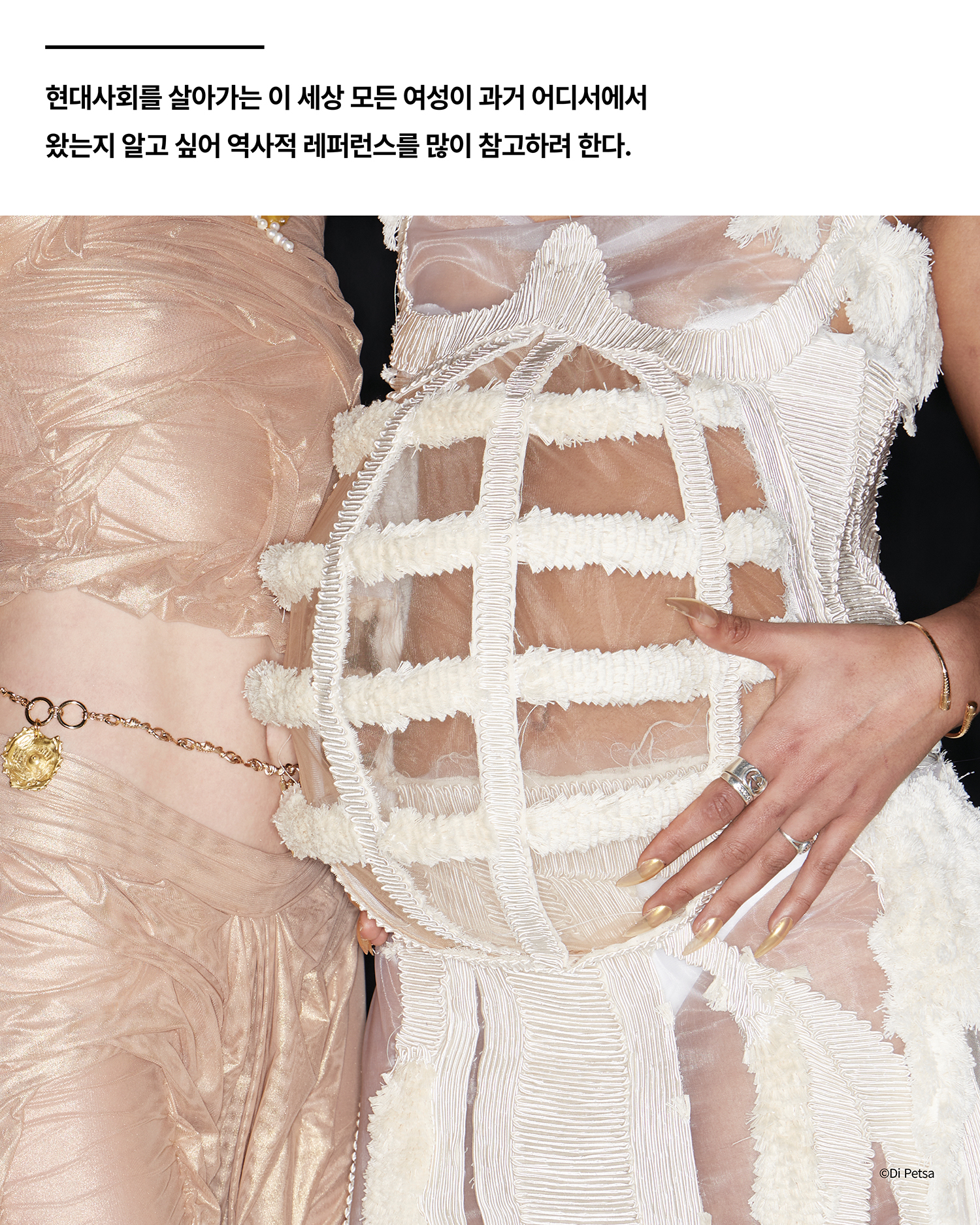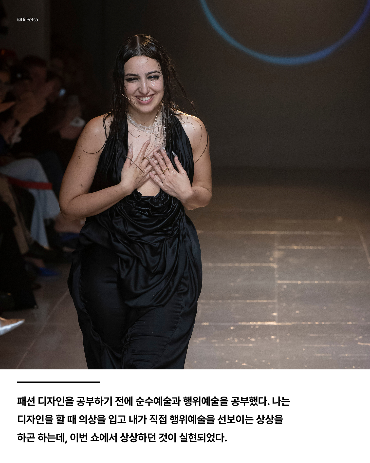 패션 디자인을 공부하기 전에 순수예술과 행위예술을 공부했다. 나는 디자인을 할 때 의상을 입고 내가 직접 행위예술을 선보이는 상상을 하곤 하는데, 이번 쇼에서 상상하던 것이 실현되었다. 이번 컬렉션은 페르세포네의 신화에서 시작되었는데, 내가 선보인 행위예술은 컬렉션의 스토리텔링에 매우 중요한 부분이었다. 컬렉션을 준비하며 페르세포네와 데메테르 여신의 관계에 관해 시를 썼는데, 이는 쇼 내내 내레이션으로 들을 수 있었다.
