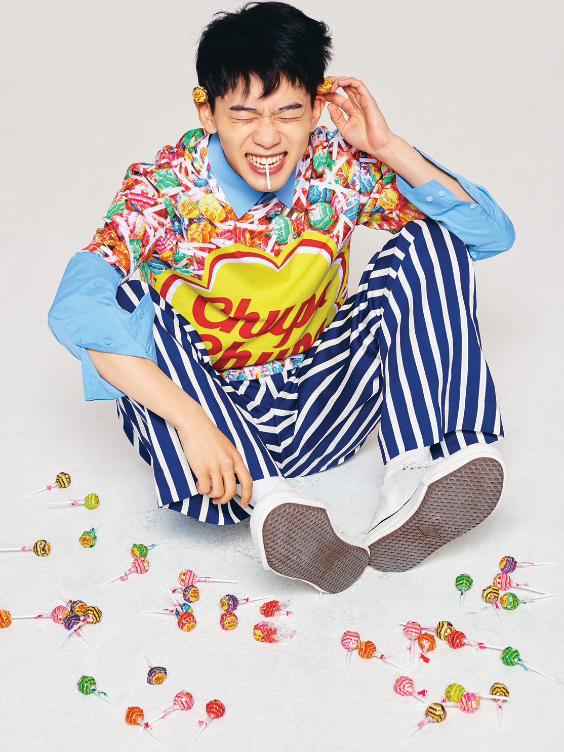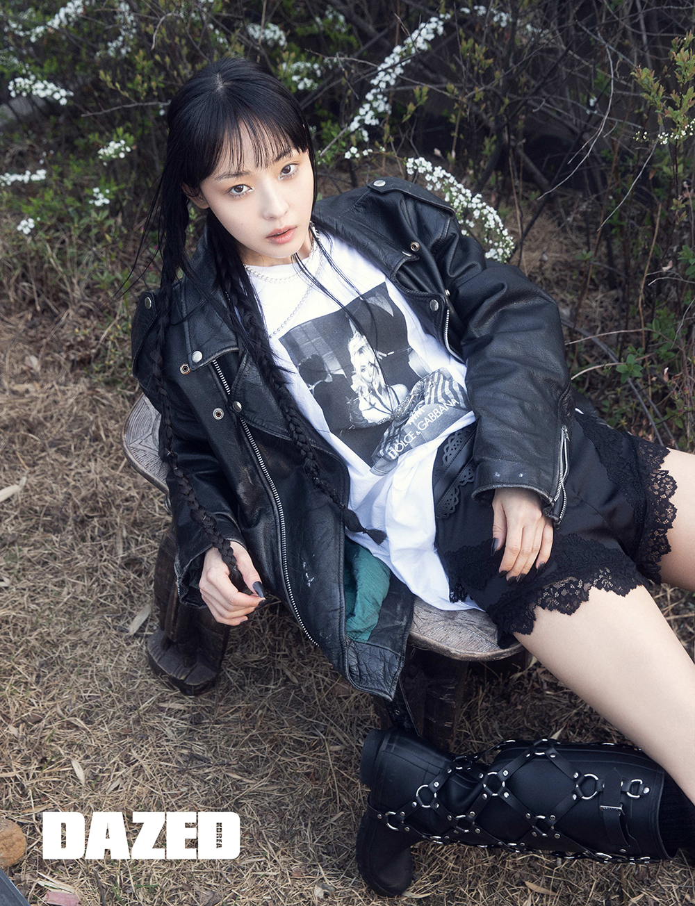 프린트 티셔츠는 돌체앤가바나(Dolce&Gabbana), 레이스 디테일 팬츠는 에이치앤엠(H&M), 부츠는 꼼데가르송×헌터(Comme Des Garçons×Hunter), 가죽재킷과 네크리스는 스타일리스트의 것.