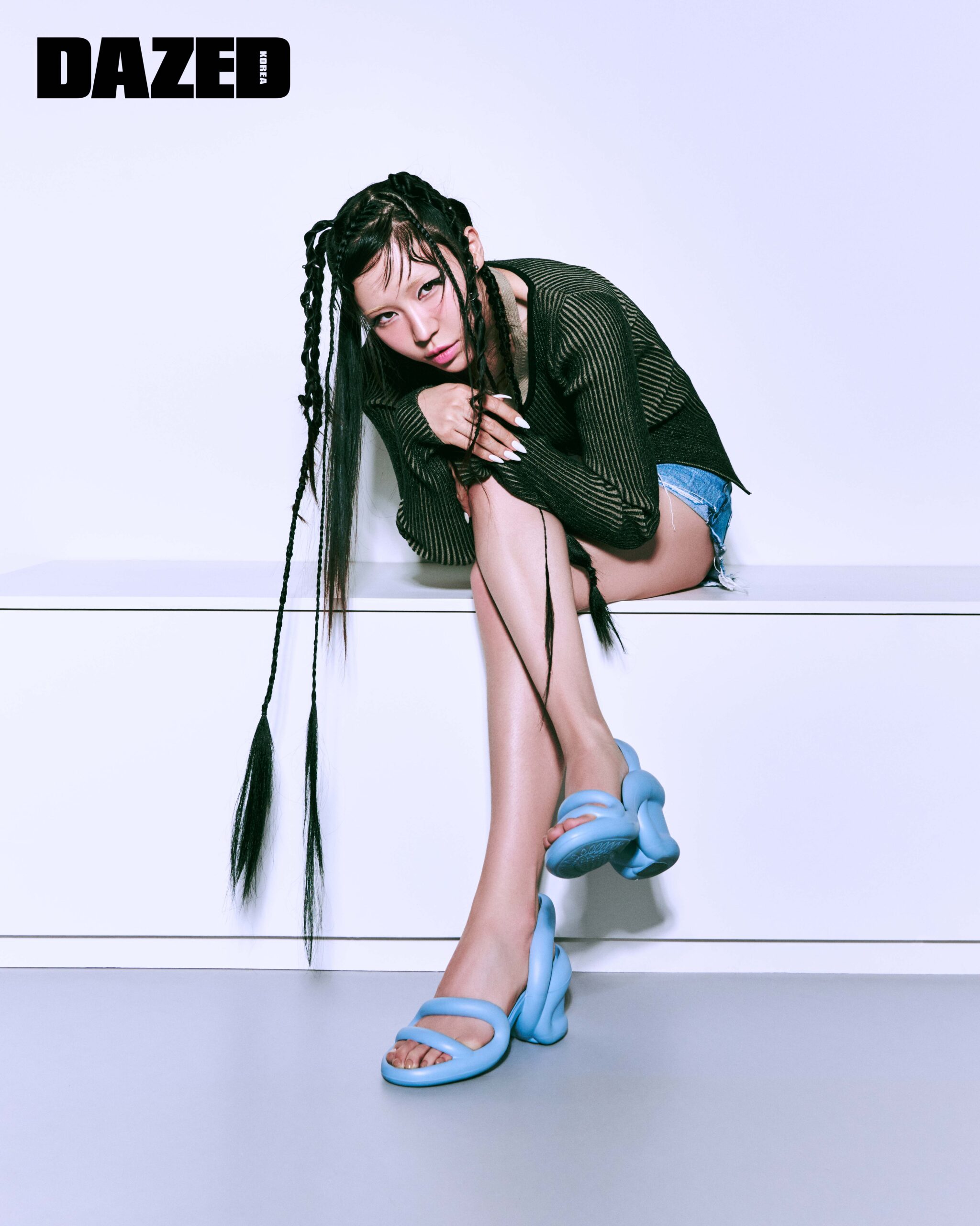 부드럽게 흐르는 곡선과 함께 심플하고 창의성 넘치는 소재의 코바라Kobarah 샌들은 캠퍼(CAMPER), 니트 카디건은 유즈(Yuse), 데님 쇼츠는 알렉산더 왕(Alexander Wang).