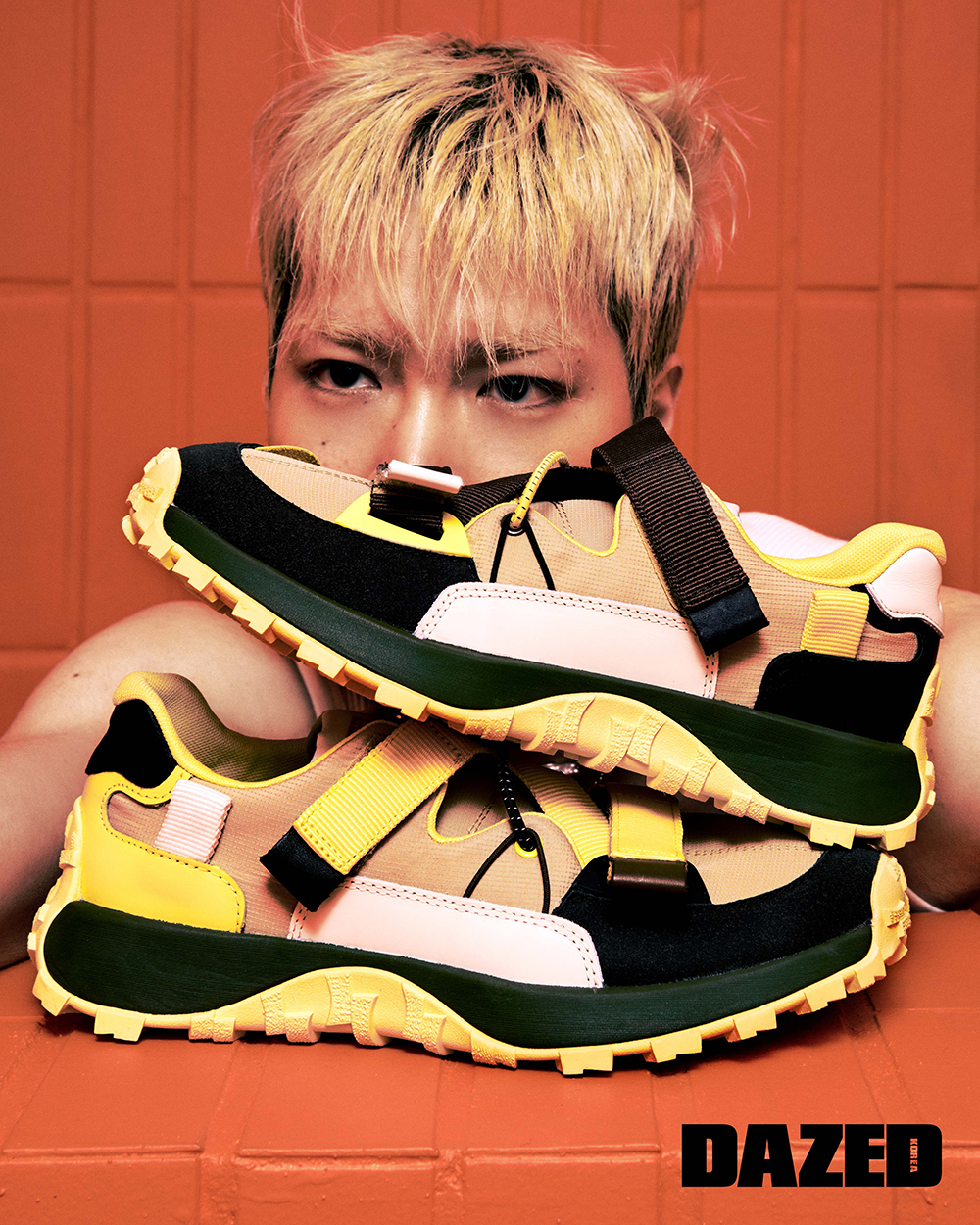 클래식한 70년대 러닝 미학과 연결된 빈티지 디자인의 드리프트 트레일Drift Trail은 캠퍼(CAMPER), 데님 재킷과 하프 팬츠는 코스트 퍼 킬로(Cost per Kilo), 이너로 입은 톱은 레씨토(Lecyto), 네크리스와 삭스는 제미나이의 것.
