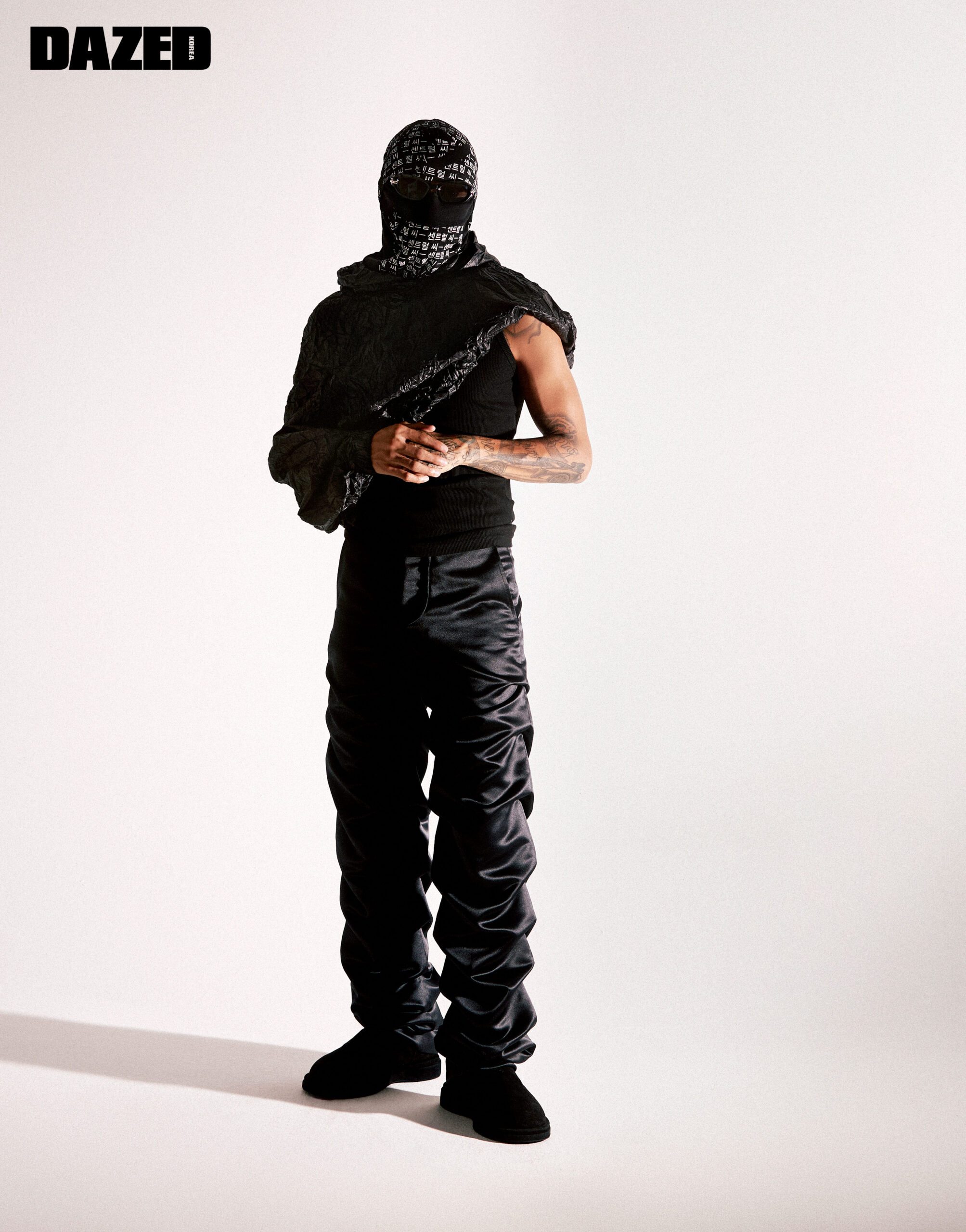 블랙 크링클 후드 톱과 새틴 셔링 팬츠, 부츠는 모두 웰던(We11done), 슬리브리스 톱과 발라클라바, 선글라스는 모두 스타일리스트의 것.