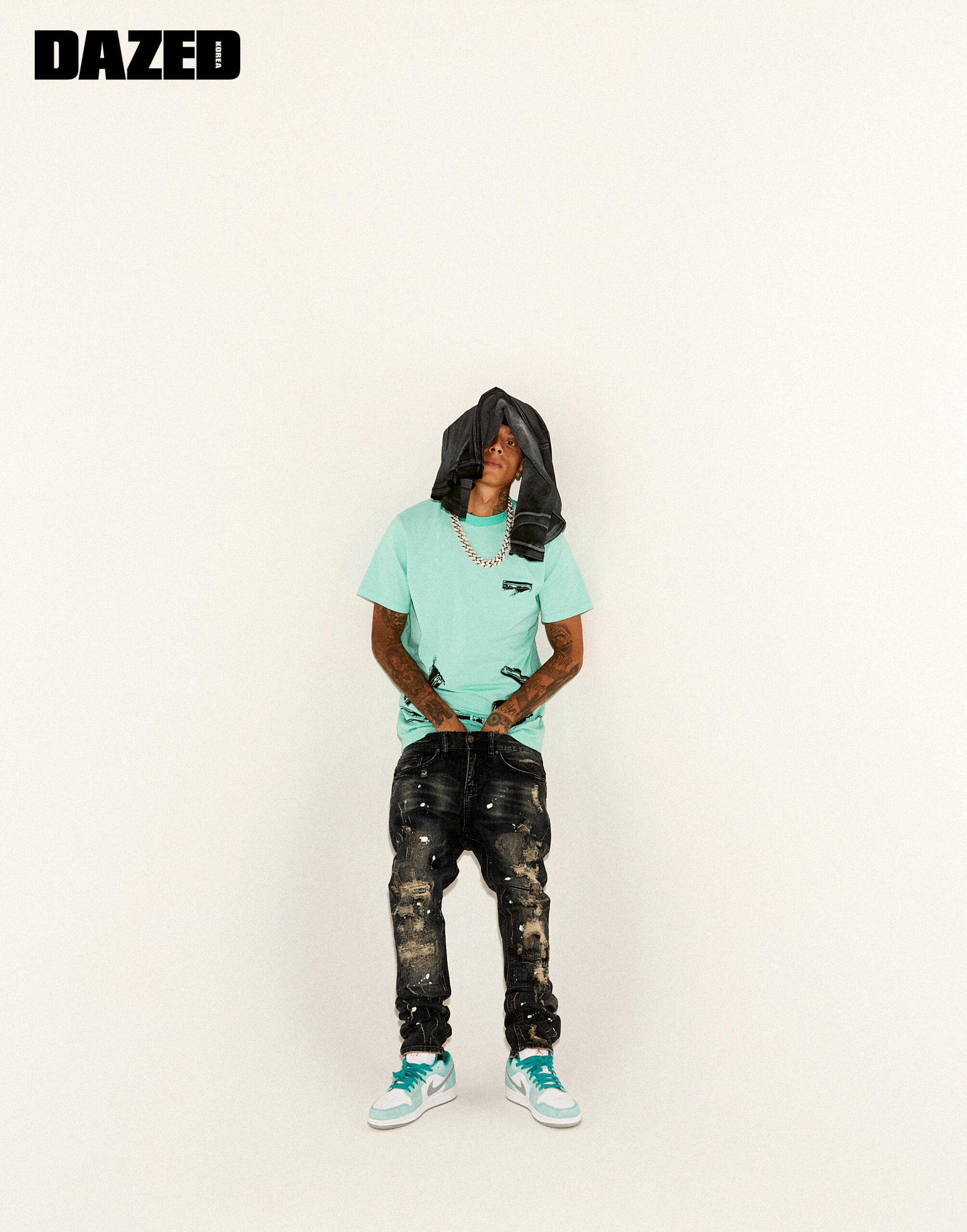 그래픽 티셔츠는 웰던(We11done), 비니와 네크리스는 센트럴 씨의 것, 데님 팬츠와 스니커즈, 그레이 스카프, 글러브는 모두 스타일리스트의 것.