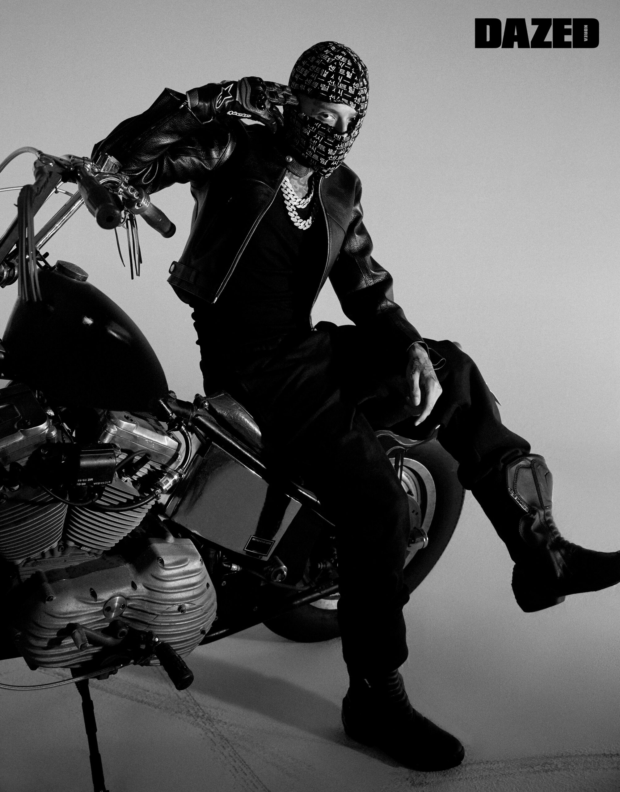 블랙 레더 재킷과 스웨트팬츠는 웰던(We11done), 네크리스는 센트럴 씨의 것, 슬리브리스 톱과 부츠, 발라클라바, 레더 글러브는 모두 스타일리스트의 것.