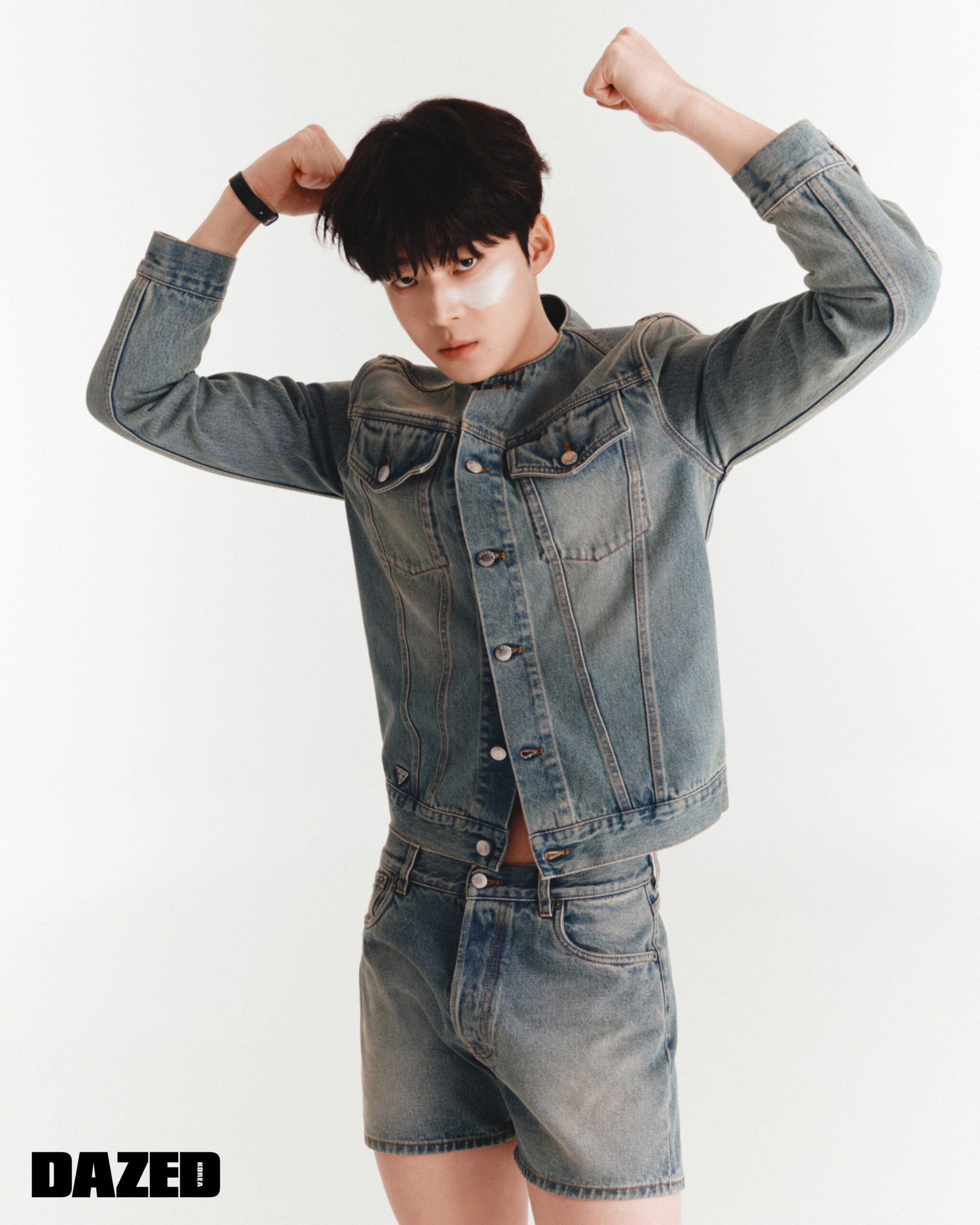 데님 재킷과 쇼츠는 프라다(Prada), 레더 브레이슬릿은 디올 맨(Dior Men).