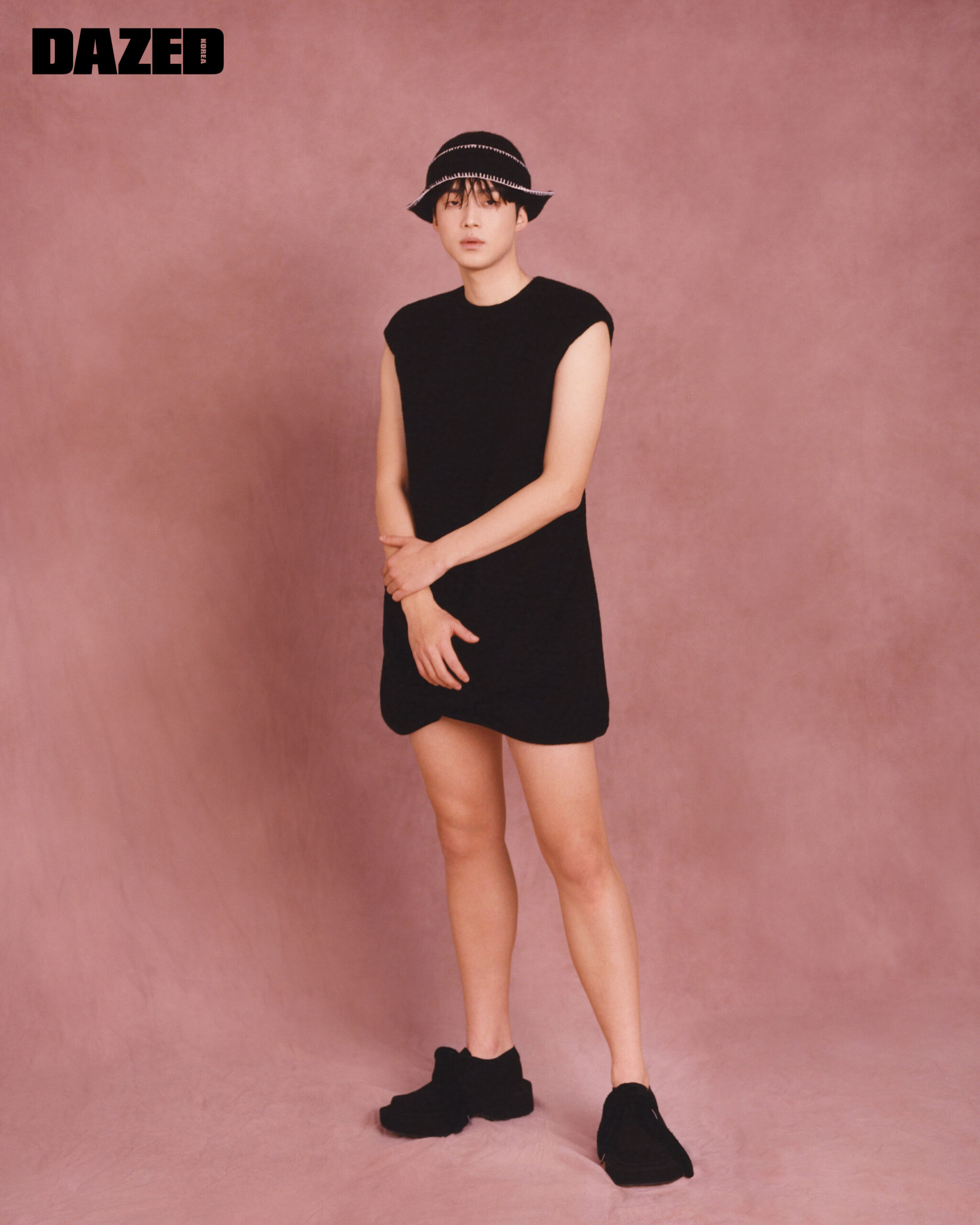 블랙 점프슈트와 더비 슈즈는 웰던(We11done), 비니는 레씨토(Lecyto).
