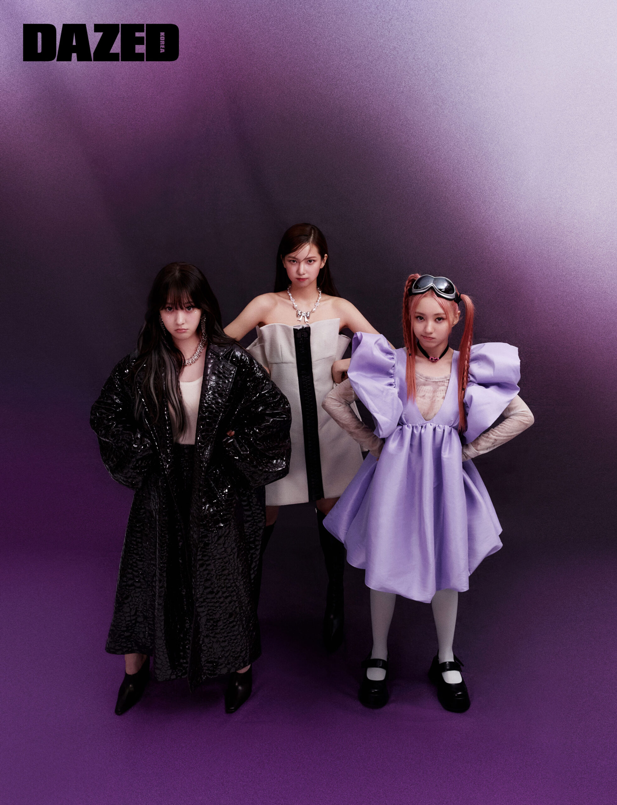 채현이 입은 레더 코트와 스커트, 슬리브리스 톱, 힐, 빅 드롭 이어링, 네크리스는 모두 보테가 베네타(Bottega Veneta). 유진이 입은 빅 집업 드레스 부츠는 루이 비통(Louis Vuitton), 리본 네크리스는 스틸에디션(Steel Edition). 예서가 입은 퍼플 컬러 드레스는 키카 바르가스 by 엠프티(Kika Vargas by E.M.P.T.Y), 이너로 착용한 프린트 톱은 2000아카이브 (2000Archives),
