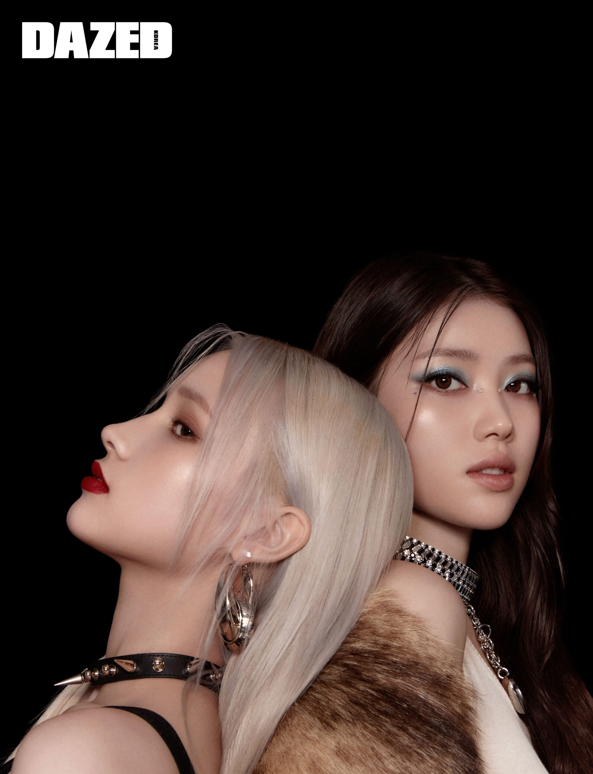 휴닝바히에가 입은 레더 슬리브리스 드레스와 이어링은 알렉산더 맥퀸(Alexander McQueen), 스터드 초커는 스틸에디션(Steel Edition), 블랙 링은 뱀버락샤(Bamberocksha). 샤오팅이 입은 퍼 코트와 슬리브리스 톱은 보테가 베네타(Bottega Veneta), 큐빅 초커는 스와로브스키(Swarovski), 하트 체인 네크리스는 허자보이에이씨씨(Hurjaboyacc).