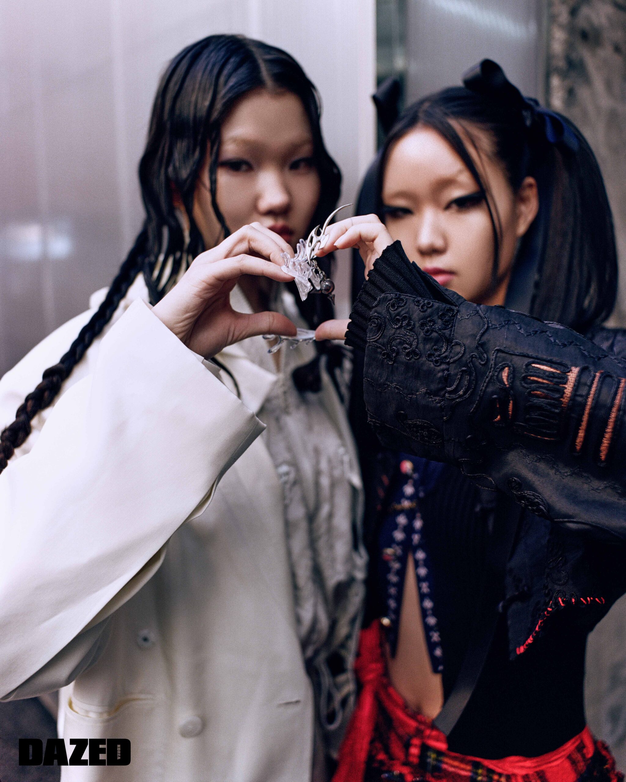 지우가 입은 화이트 더블 재킷은 조선호랑이(Joseon Tiger), 이너 스트링 집업 재킷은 펜디(Fendi). 예슬이 입은 블랙 칼라리스 재킷에 이너로 레이어링한 셔링 카디건은 자크뮈스 by 10 꼬르소 꼬모 서울(JACQUEMUS by 10 Corso Como Seoul), 연화 무늬 셔츠는 조선호랑이(Joseon Tiger), 블랙 칼리리스 재킷과 타탄체크 스커트, 허리에 묶어 연출한 스카프는 모두 디렉터의 것.