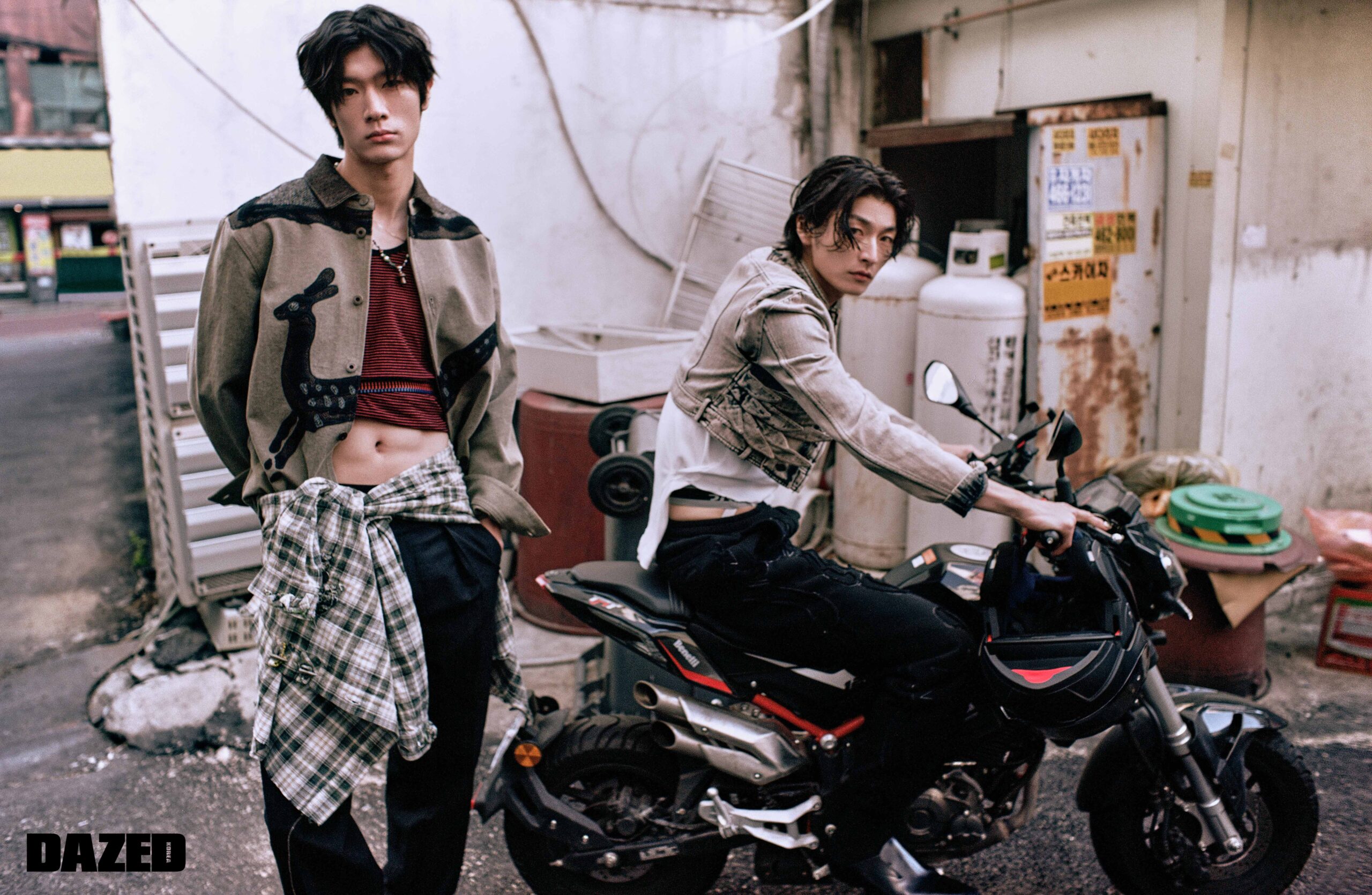 우형이 입은 엠브로이더리 셔츠는 로에베(Loewe), 블랙 슬랙스는 펜디(Fendi), 스트라이프 톱과 허리에 묶어 연출한 셔츠, 네크리스는 모두 디렉터의 것. 현재가 입은 스트링 디테일의 만다린 칼라 데님 재킷은 굼허(Goomheo), 블랙 팬츠는 슈프림(Supreme), 블랙 레더 뮬은 드리스 반 노튼(Dries Van Noten), 화이트 슬리브리스 톱과 작스트랩, 삭스는 모두 디렉터의 것.