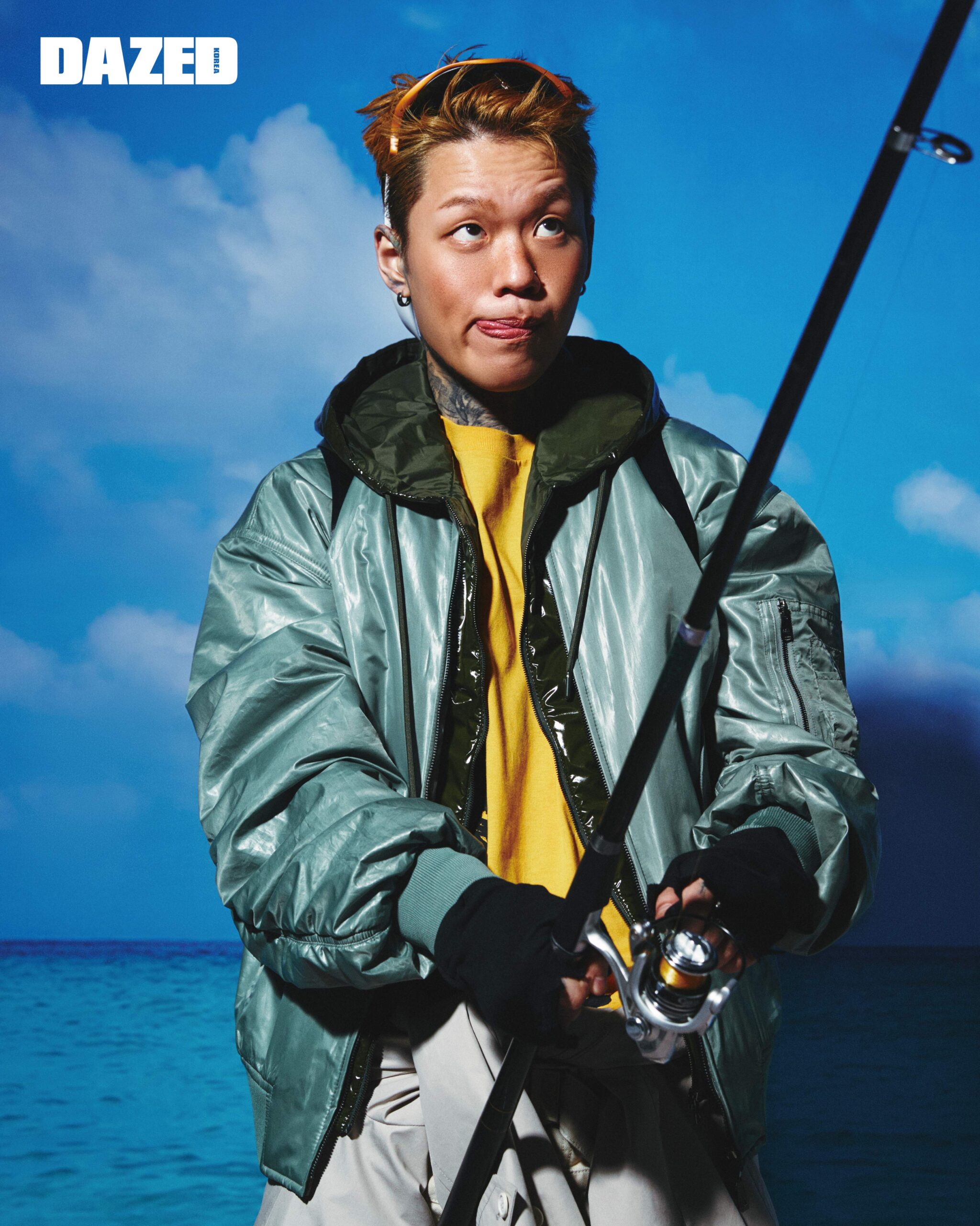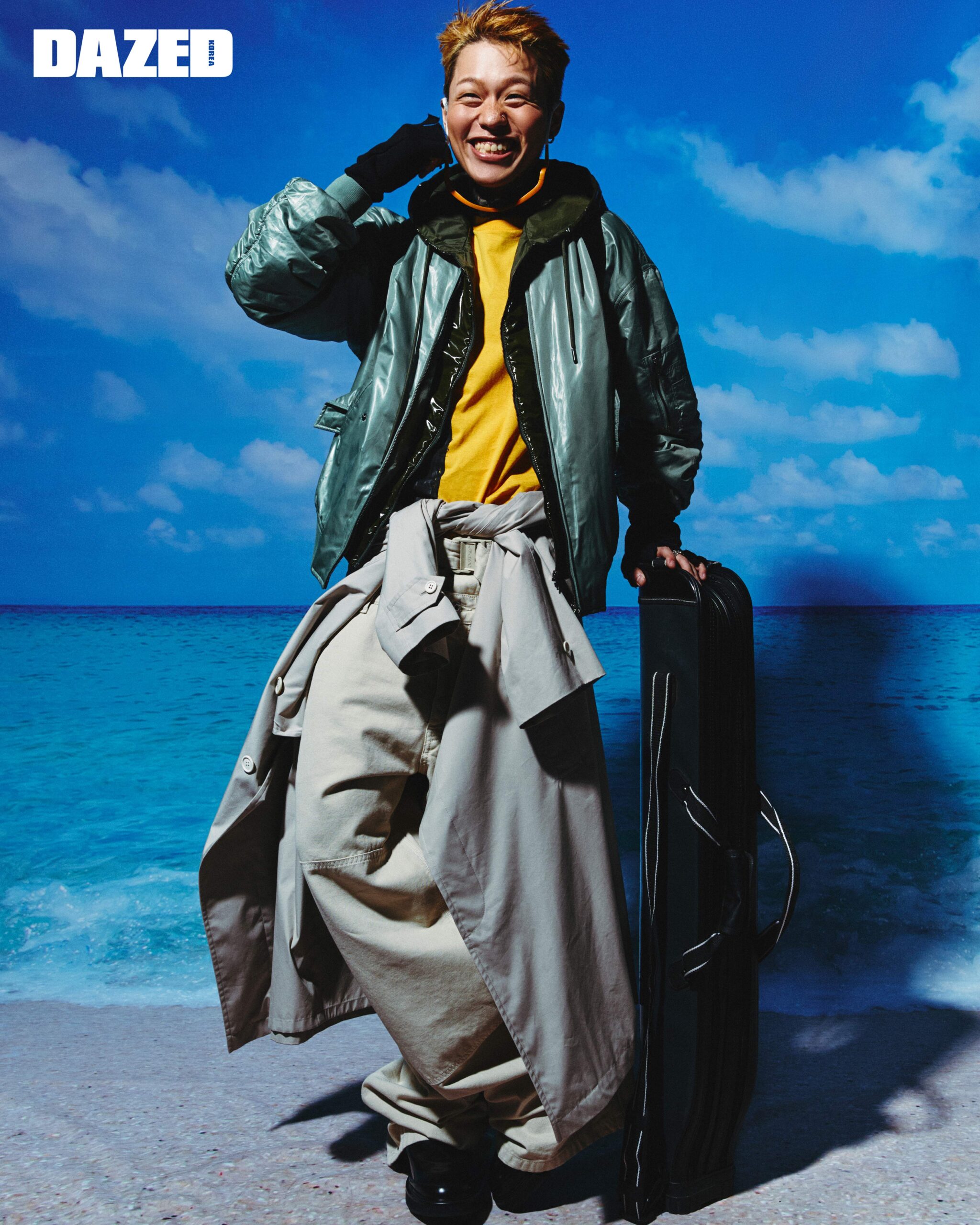 글로시 후드를 레이어링한 MA-1 재킷은 이로(IRO), 옐로 슬리브리스 톱과 허리에 묶어 연출한 코튼 코트는 프라다(Prada), 캔버스 팬츠는 오프화이트(Off-WhiteTM), 첼시 부츠는 알렉산더 맥퀸(Alexander McQueen), 오렌지 프레임 선글라스는 디올 맨(Dior Men), 크롬하츠 링은 던말릭의 것, 핸드 워머와 낚시 가방은 에디터의 것.