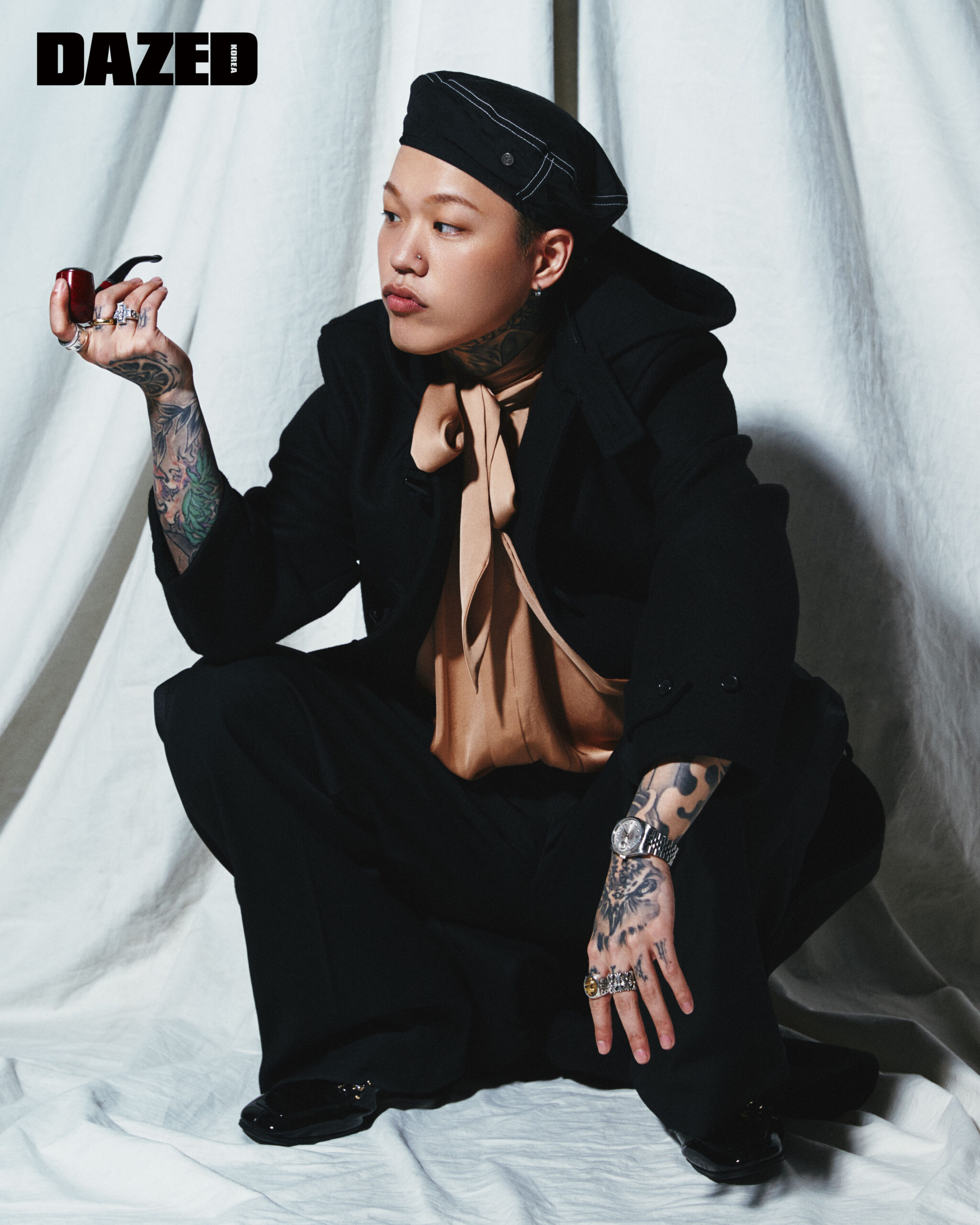 더블브레스트 재킷은 발렌시아가 by 10 꼬르소 꼬모 서울(Balenciaga by 10 Corso Como Seoul), 펜던트 네크리스는 크롬하츠(Chrome Hearts), 레이어링한 체인 네크리스와 실버 볼드 링은 킹크로치(King Kroach), 워치와 크롬하츠 링은 던말릭의 것.