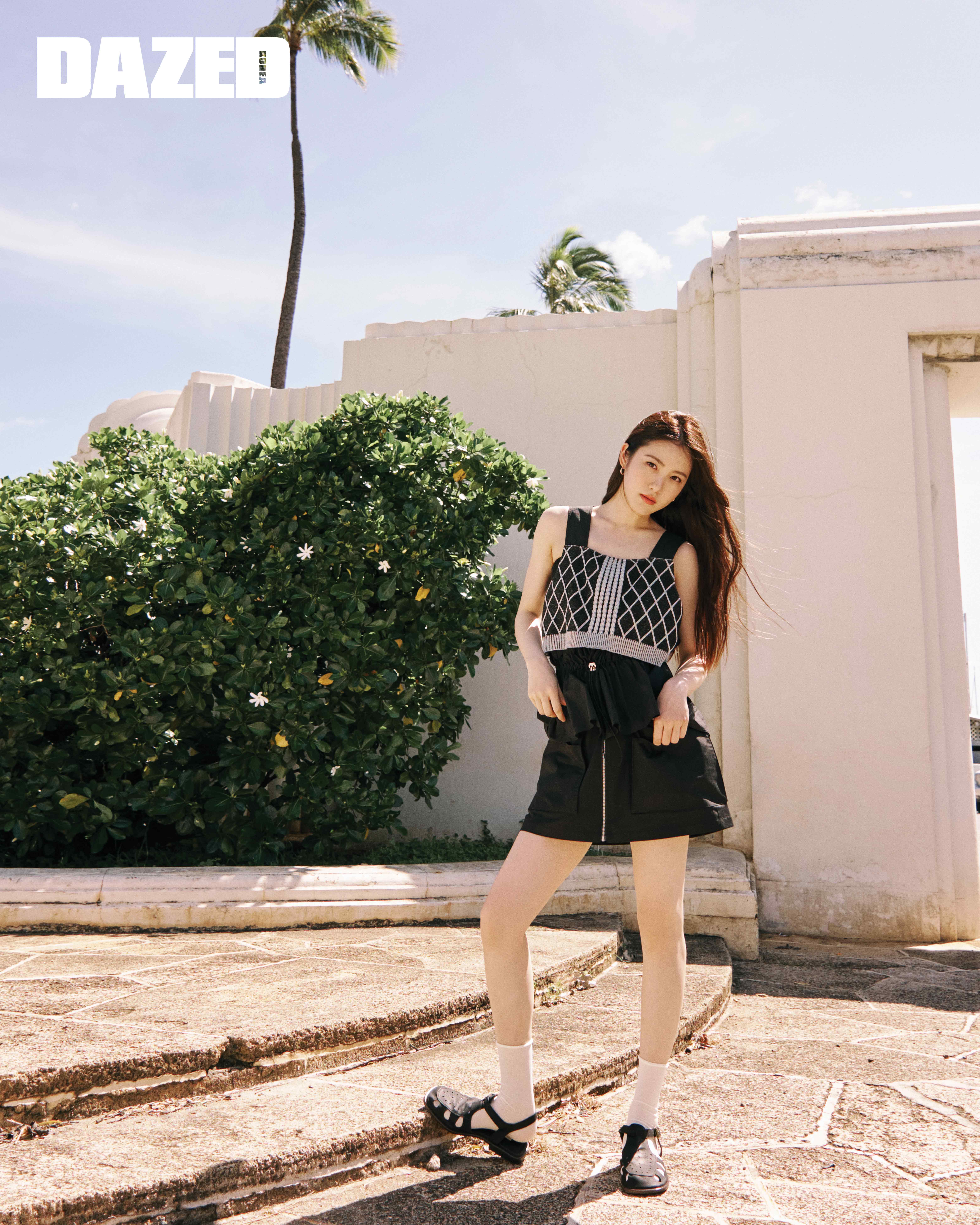 니트 레이어 플레어 헴라인 톱과 스커트는 오즈세컨(O’2nd), 블랙 샌들은 에이티티(att.), 이어링은 해수엘(Hawsoo.l), 양말은 스타일리스트의 것.