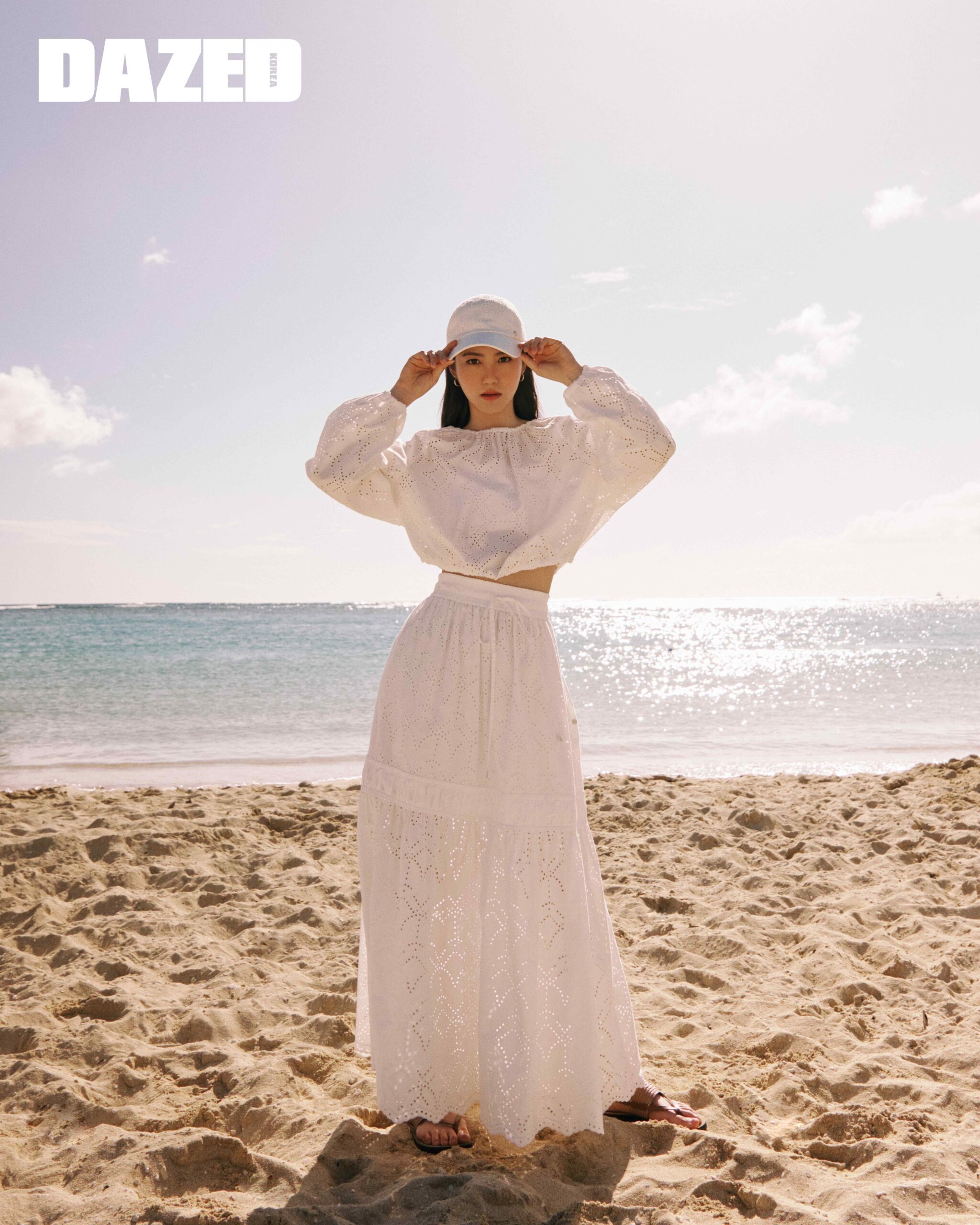 아일렛 톱과 맥시 스커트, 스트랩 샌들, 자수 디테일이 돋보이는 볼캡 모두 헬렌카민스키(HELEN KAMINSKI).