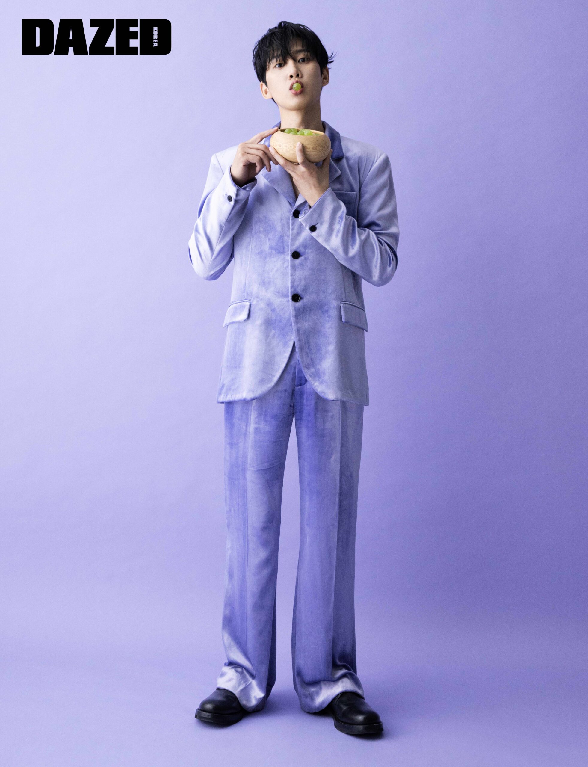 플루이드 벨벳 소재의 재킷과 팬츠는 마르니(Marni), 블랙 더비 슈즈는 스타일리스트의 것.