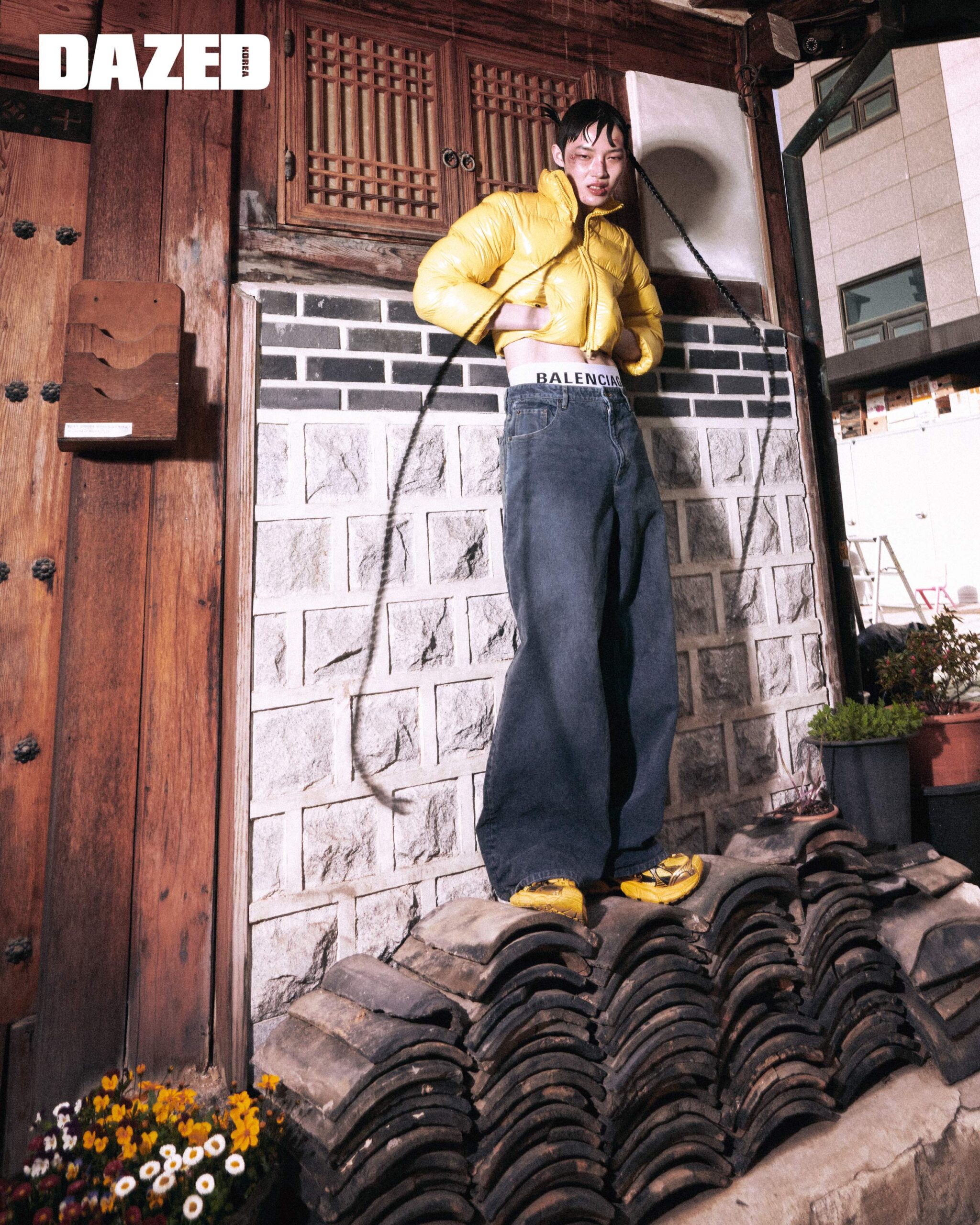 옐로 패딩 재킷과 데님 팬츠, 스니커즈, 브리프는 모두 발렌시아가(Balenciaga).