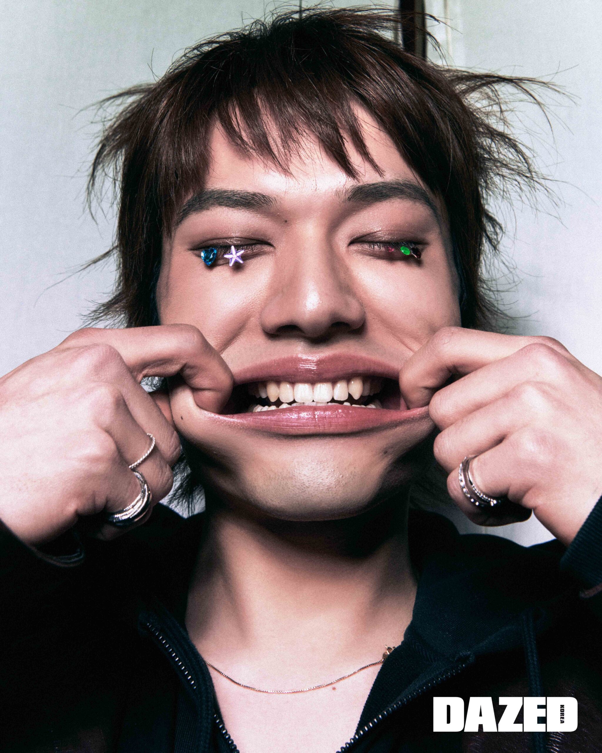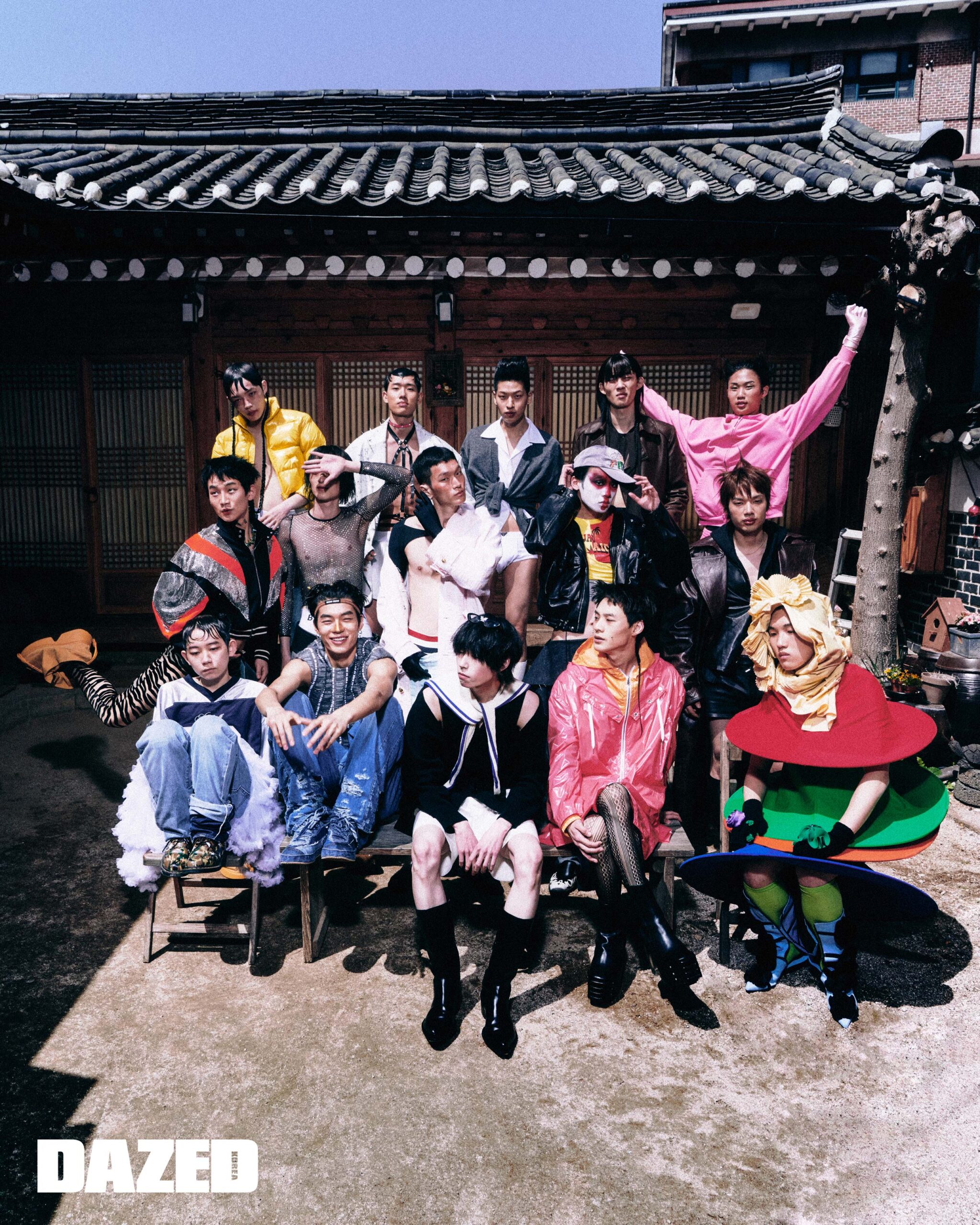 병직이 입은 옐로 패딩 재킷과 데님 팬츠, 브리프는 모두 발렌시아가(Balenciaga). 제민이 입은 스터드 장식 레더 재킷은 아크네 스튜디오(Acne Studios), 쇼츠는 사카이(Sacai), 스터드 초커는 베르사체(Versace), 하네스는 에디터의 것. 성준이 입은 니트 카디건과 하프 슬리브 티셔츠, 화이트 브리프는 모두 프라다(Prada). 민준이 입은 레더 코트와 시스루 셔츠는 생 로랑 by 안토니 바카렐로(Saint Laurent by Anthony Vaccarello). 우준이 입은 핑크 후드 톱과 쇼츠는 발렌시아가(Balenciaga), 글러브는 에디터의 것. 예찬이 입은 레더 코트와 레더 부츠는 보테가 베네타(Bottega Veneta), 레더 재킷과 쇼츠는 페라가모(Ferragamo), 이너로 착용한 블랙 후디는 뮈글러×에이치앤엠(Mugler×H&M). 조니가 입은 레더 후드 재킷은 페라가모(Ferragamo), 슬리브리스 톱과 데님 팬츠는 디젤(Diesel), 레이어링한 크롭트 티셔츠는 디스퀘어드2(Dsquared2), 볼캡은 MPQ. 준영이 입은 볼레로 톱은 뮈글러×에이치앤엠(Mugler×H&M), 코트와 스커트, 작스트랩은 톰브라운(Thom Browne), 니하이 레더 부츠는 에르메스(Hermès). 필립이 입은 메시 톱과 디스트로이드 데님 팬츠, 브리프, 빅 버클 벨트는 모두 발렌시아가(Balenciaga). 미루가 입은 재킷과 지브라 패턴 타이츠는 구찌(Gucci), 네크리스는 디올 맨(Dior Men), 슈즈는 로에베(Loewe). 다원이 입은 럭비 티셔츠는 2000아카이브스(2000Archives), 데님 팬츠와 데님 레그 워머는 리바이스(Levi’s), 샤 스커트는 에디터의 것, 슈즈는 다원의 것. 샹위가 입은 스트라이프 드레스는 톰브라운(Thom Browne), 데님 팬츠는 디젤(Diesel), 데님 패치워크 디테일 슈즈는 로에베(Loewe), 헤어밴드는 미우미우(Miu Miu). 규현이 입은 컷아웃 디테일 재킷과 화이트 쇼츠는 알렉산더 맥퀸(Alexander McQueen), 블랙 부츠는 보테가 베네타(Bottega Veneta), 니트 타바드는 겐조(Kenzo), 안경은 에디터의 것. 성신이 입은 에나멜 소재 레인코트는 에르메스(Hermès), 플랫폼 부츠는 릭 오웬스(Rick Owens), 타이츠는 에디터의 것. 준훈이 입은 독특한 실루엣의 브라톱과 미디스커트, 레이어링한 스커트, 글러브, 부츠는 모두 선우(Sunwoo), 헤드피스로 연출한 셔츠는 드리스 반 노튼(Dries Van Noten), 글러브에 부착한 플라워 브로치는 2000아카이브스(2000Archives), 컬러 타이츠는 에디터의 것.