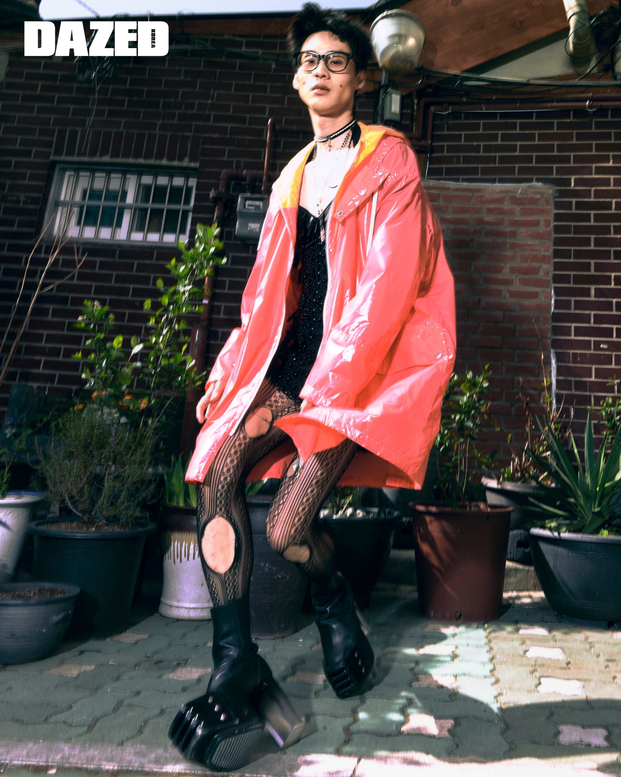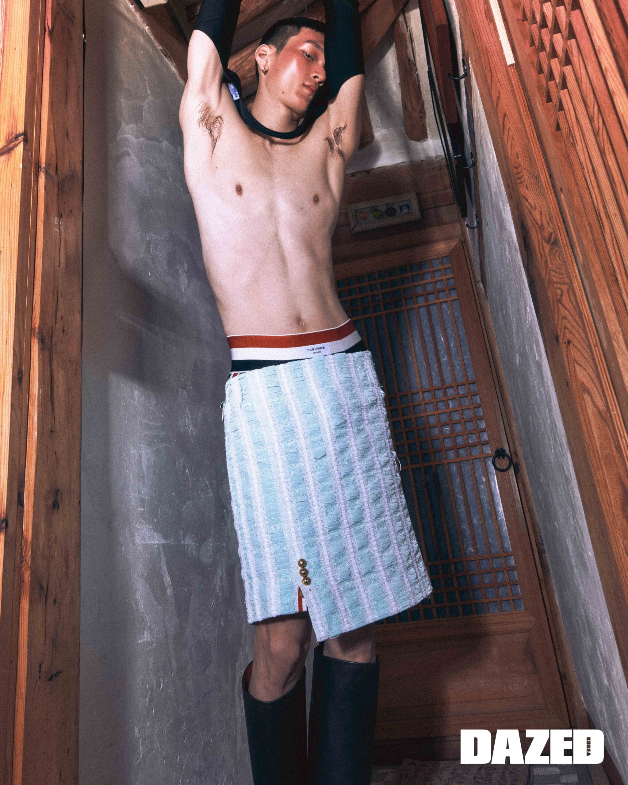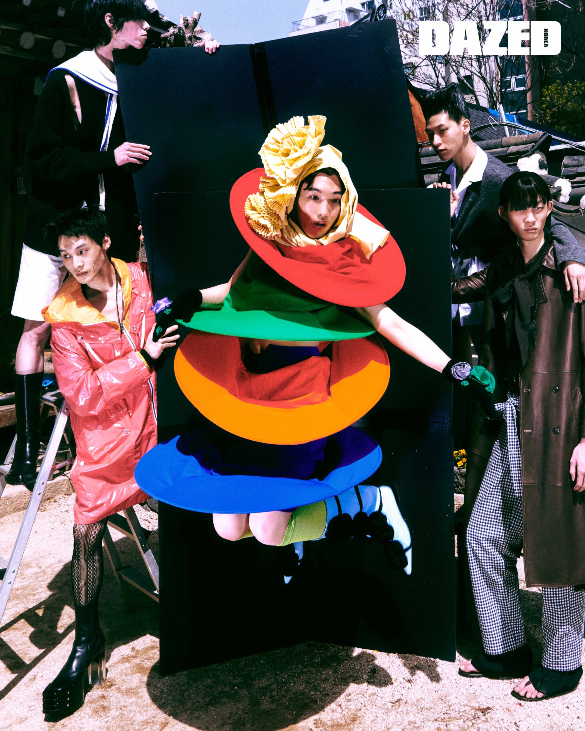 준훈이 입은 독특한 실루엣의 브라톱과 미디스커트, 레이어링한 스커트, 글러브, 부츠는 모두 선우(Sunwoo), 헤드피스로 연출한 셔츠는 드리스 반 노튼(Dries Van Noten), 글러브에 부착한 플라워 브로치는 2000아카이브스(2000Archives), 컬러 타이츠는 에디터의 것. 성신이 입은 에나멜 소재 레인코트는 에르메스(Hermès), 볼레로 톱은 돌체앤가바나(Dolce&Gabbana), 플랫폼 부츠는 릭 오웬스(Rick Owens), 타이츠는 에디터의 것. 규현이 입은 컷아웃 디테일 재킷과 화이트 쇼츠는 알렉산더 맥퀸(Alexander McQueen), 블랙 부츠는 보테가 베네타(Bottega Veneta), 니트 타바드는 겐조(Kenzo), 안경은 에디터의 것. 성준이 입은 니트 카디건과 하프 슬리브 티셔츠, 화이트 브리프는 모두 프라다(Prada). 민준이 입은 레더 코트와 시스루 셔츠, 블랙 팬츠, 샌들, 벨트는 모두 생 로랑 by 안토니 바카렐로(Saint Laurent by Anthony Vaccarello), 레이어링한 리본 디테일 체크 패턴 팬츠는 겐조(Kenzo).
