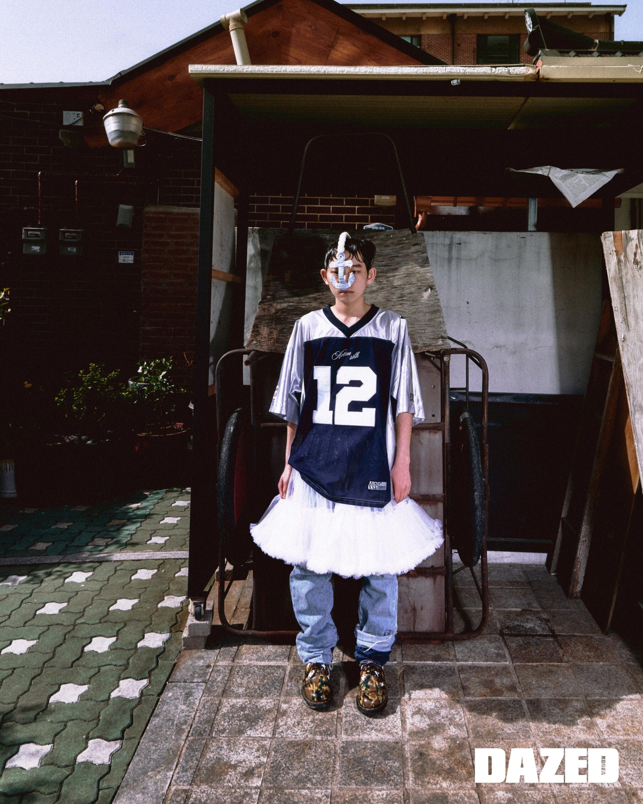 럭비 티셔츠는 2000아카이브스(2000Archives), 데님 팬츠와 데님 레그 워머는 리바이스(Levi’s), 헤드피스는 톰브라운(Thom Browne), 샤 스커트는 에디터의 것, 슈즈는 다원의 것.