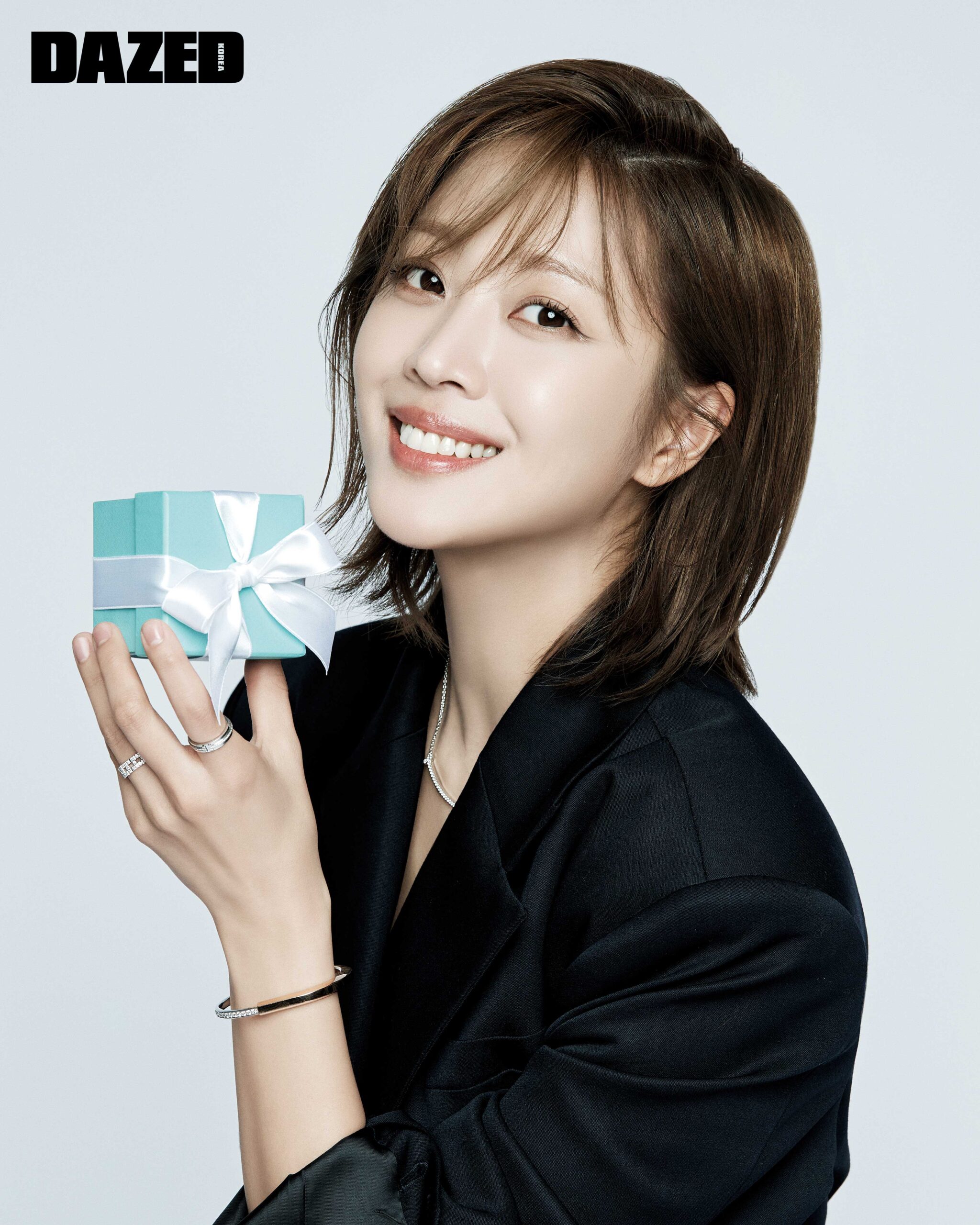 플래티넘에 다이아몬드를 세팅한 티파니 키 플뢰르 드 리스 키 펜던트와 라운드 브릴리언트 컷 다이아몬드를 세팅한 18K 옐로 골드 티파니 락 다이아몬드 엑센트 뱅글, 라운드 브릴리언트 컷 다이아몬드를 세팅한 18K 옐로 골드 티파니 락 하프 파베 다이아몬드 뱅글, 라운드 브릴리언트 컷 다이아몬드를 세팅한 18K 로즈 골드 및 화이트 골드 티파니 락 링, 라운드 브릴리언트 컷 다이아몬드를 세팅한 18K 로즈 골드 및 화이트 골드 티파니 락 투 핑거 링은 모두 티파니(Tiffany & Co.), 블랙 코트는 발렌티노(Valentino), 블랙 슬리브리스 톱은 아미(AMI).
