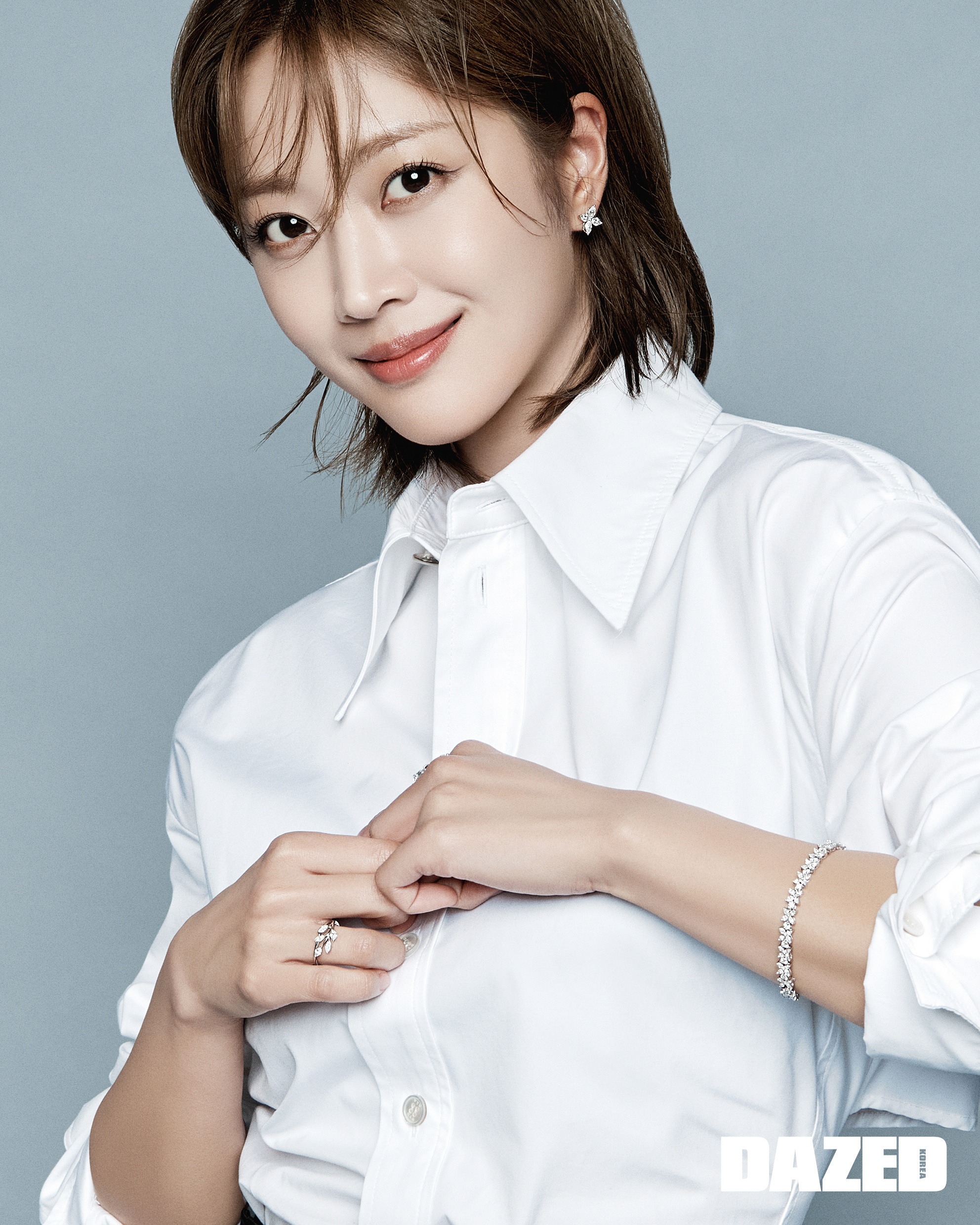 플래티넘에 마퀴즈 컷 다이아몬드를 세팅한 티파니 빅토리아 이어링과 플래티넘에 마퀴즈 컷 다이아몬드와 라운드 브릴리언트 컷 다이아몬드를 세팅한 티파니 빅토리아 얼터네이팅 브레이슬릿, 플래티넘에 마퀴즈 컷 다이아몬드와 라운드 브릴리언트 컷 다이아몬드를 세팅한 티파니 빅토리아 클러스터 바인 링, 플래티넘에 마퀴즈 컷 다이아몬드와 라운드 브릴리언트 컷 다이아몬드를 세팅한 티파니 빅토리아 바인 링은 모두 티파니(Tiffany & Co.), 화이트 백 버클 크롭트 셔츠는 우영미(Wooyoungmi), 블랙 와이드 팬츠는 잉크(EENK).