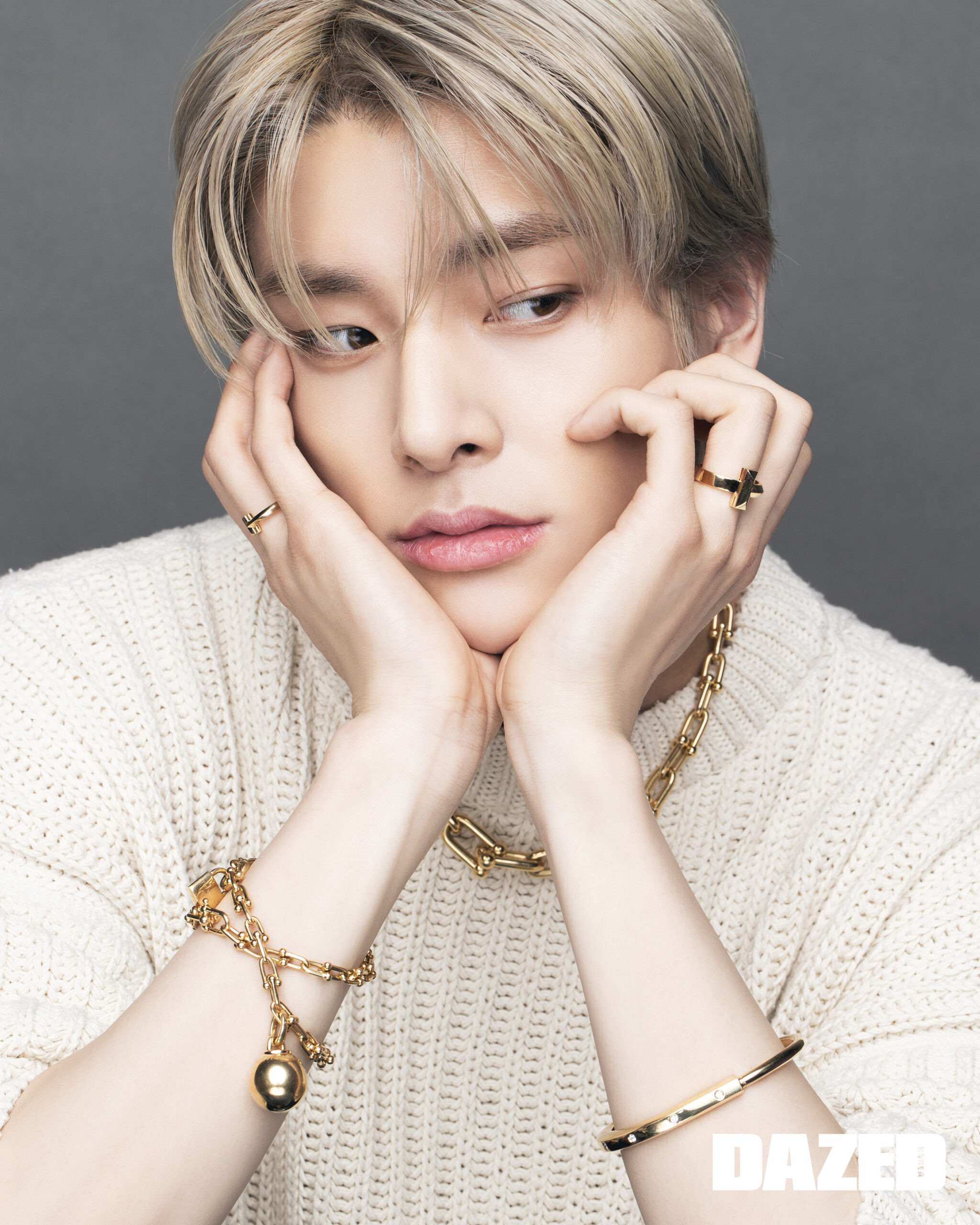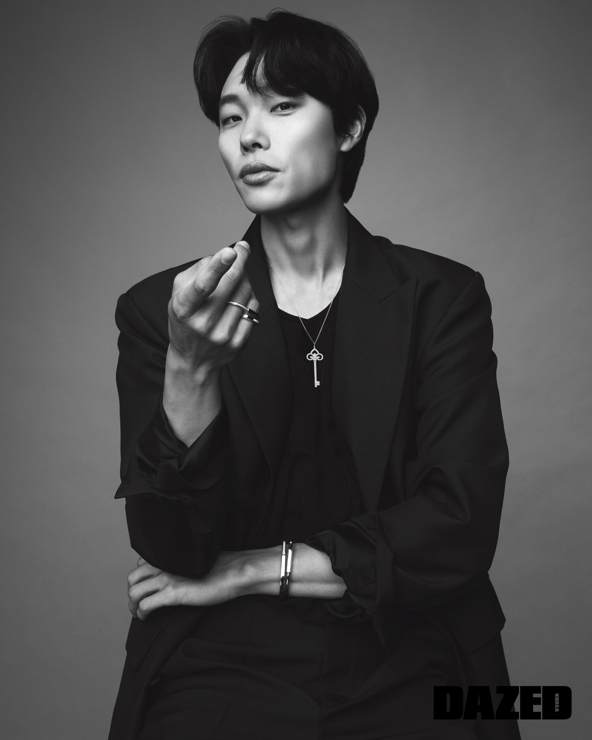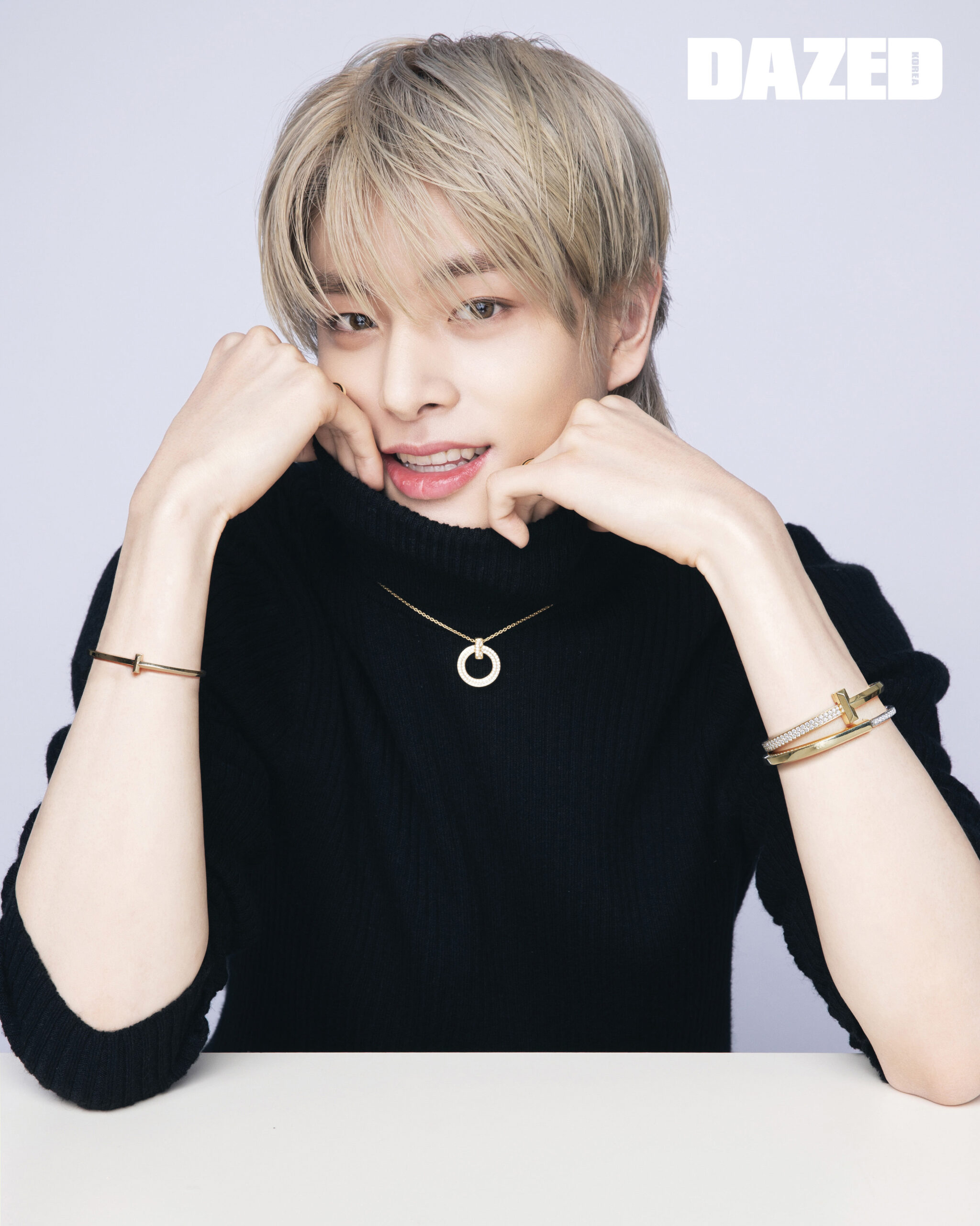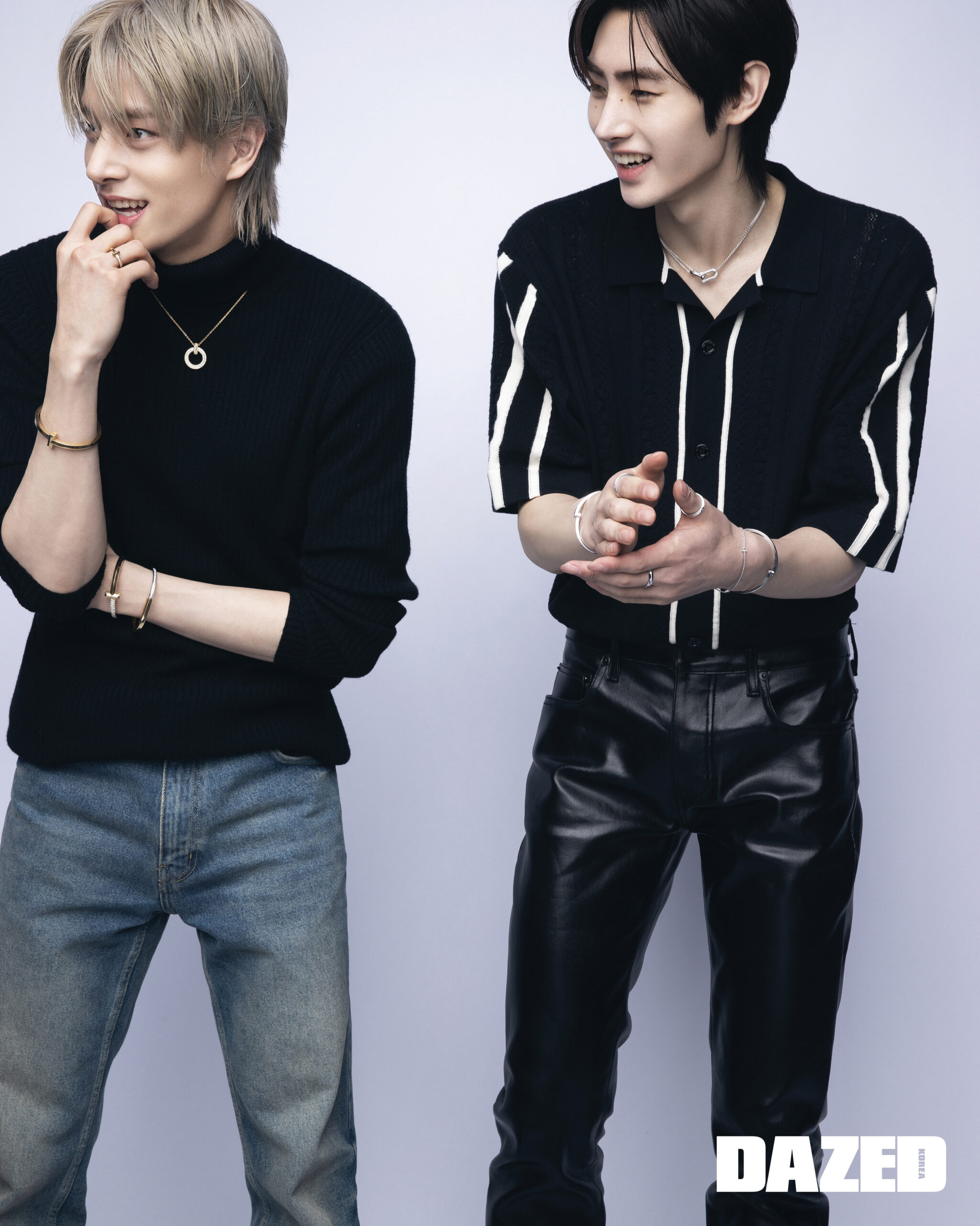 제이크가 착용한 라운드 브릴리언트 컷 다이아몬드를 세팅한 18K 옐로 골드 티파니 T1 서클 펜던트와 18K 옐로 골드 티파니 T1 내로우 힌지드 뱅글, 라운드 브릴리언트 컷 다이아몬드를 세팅한 18K 옐로 골드 티파니 T1 와이드 하프 다이아몬드 힌지드 뱅글, 라운드 브릴리언트 컷 다이아몬드를 세팅한 18K 옐로 골드 티파니 락 하프 파베 다이아몬드 뱅글, 라운드 브릴리언트 컷 다이아몬드를 세팅한 18K 옐로 골드 티파니 T1 내로우 하프 다이아몬드 링은 모두 티파니(Tiffany & Co.), 데님 팬츠는 쿠레쥬(Courrèges), 블랙 터틀넥 톱은 스타일리스트의 것. 성훈이 착용한 다이아몬드를 세팅한 18K 화이트 골드 티파니 하드웨어 파베 더블 링크 펜던트와 18K 화이트 골드 티파니 T1 내로우 힌지드 뱅글, 라운드 브릴리언트 컷 다이아몬드를 세팅한 18K 화이트 골드 티파니 T1 내로우 하프 다이아몬드 힌지드 뱅글, 다이아몬드를 세팅한 18K 화이트 골드 티파니 T 스마일 브레이슬릿, 다이아몬드를 세팅한 18K 화이트 골드 티파니 T 내로우 링, 다이아몬드를 세팅한 18K 화이트 골드 티파니 T 투 파베 내로우 링, 18K 화이트 골드 티파니 T 투 내로우 링은 모두 티파니(Tiffany & Co.), 니트 톱은 닐 바렛(Neil Barret), 팬츠는 스타일리스트의 것.