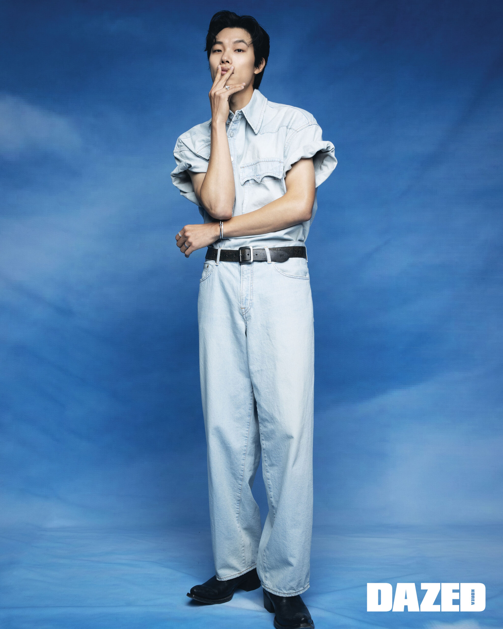 라운드 브릴리언트 컷 다이아몬드를 세팅한 18K 옐로 골드 티파니 락 하프 파베 다이아몬드 뱅글과 라운드 브릴리언트 컷 다이아몬드를 세팅한 18K 화이트 골드 티파니 T1 내로우 하프 다이아몬드 힌지드 뱅글, 라운드 브릴리언트 컷 다이아몬드를 세팅한 18K 화이트 골드 티파니 T1 와이드 풀 다이아몬드 링, 18K 화이트 골드 티파니 T 트루 와이드 링, 다이아몬드를 세팅한 18K 화이트 골드 티파니 T 트루 파베 와이드 링은 모두 티파니(Tiffany & Co.), 데님 반팔 셔츠와 팬츠 셋업은 컬러 by 10 꼬르소 꼬모 서울(Kolor by 10 Corso Como Seoul), 블랙 부츠는 프라다(Prada), 빈티지 벨트는 더블알엘(Double RL).