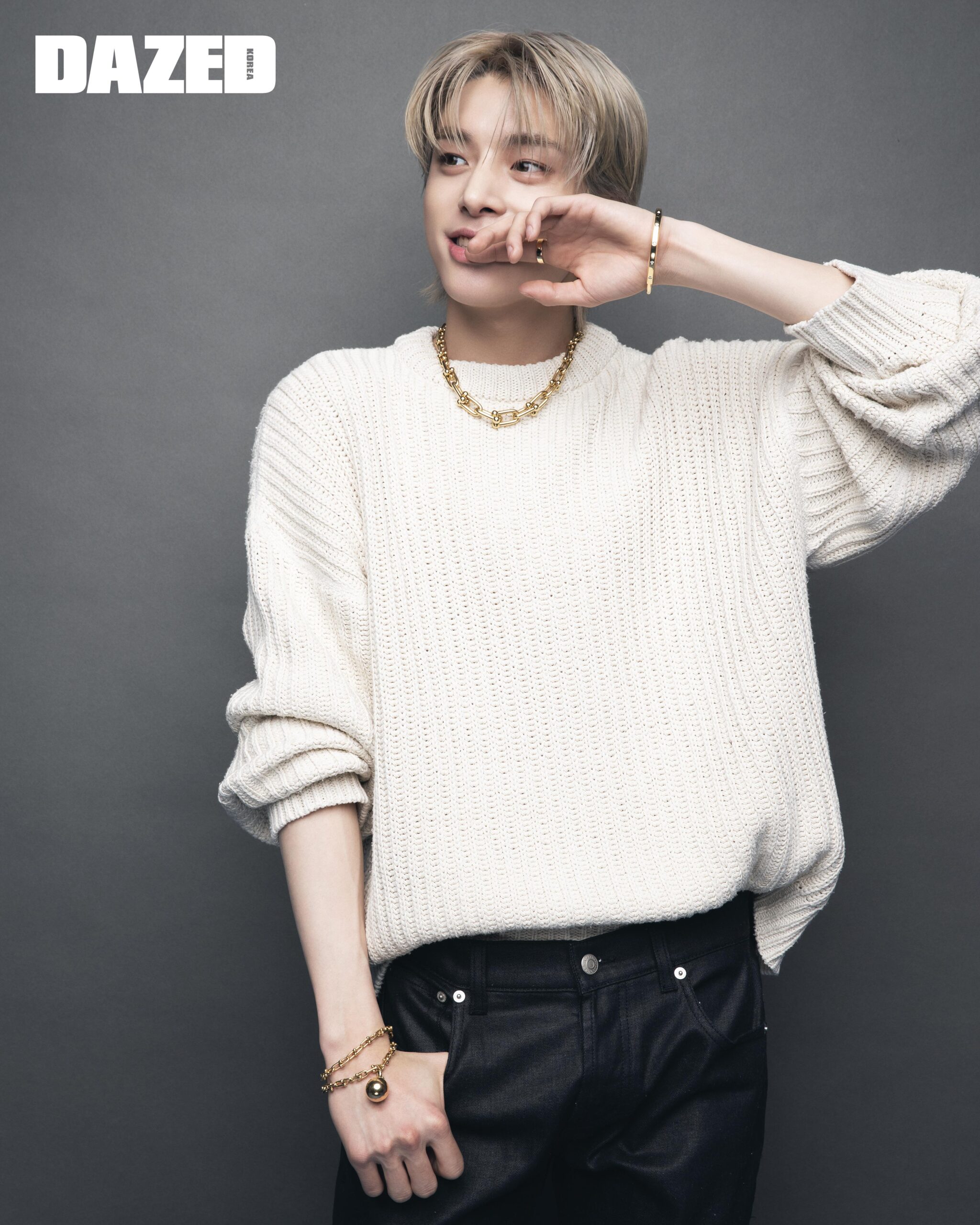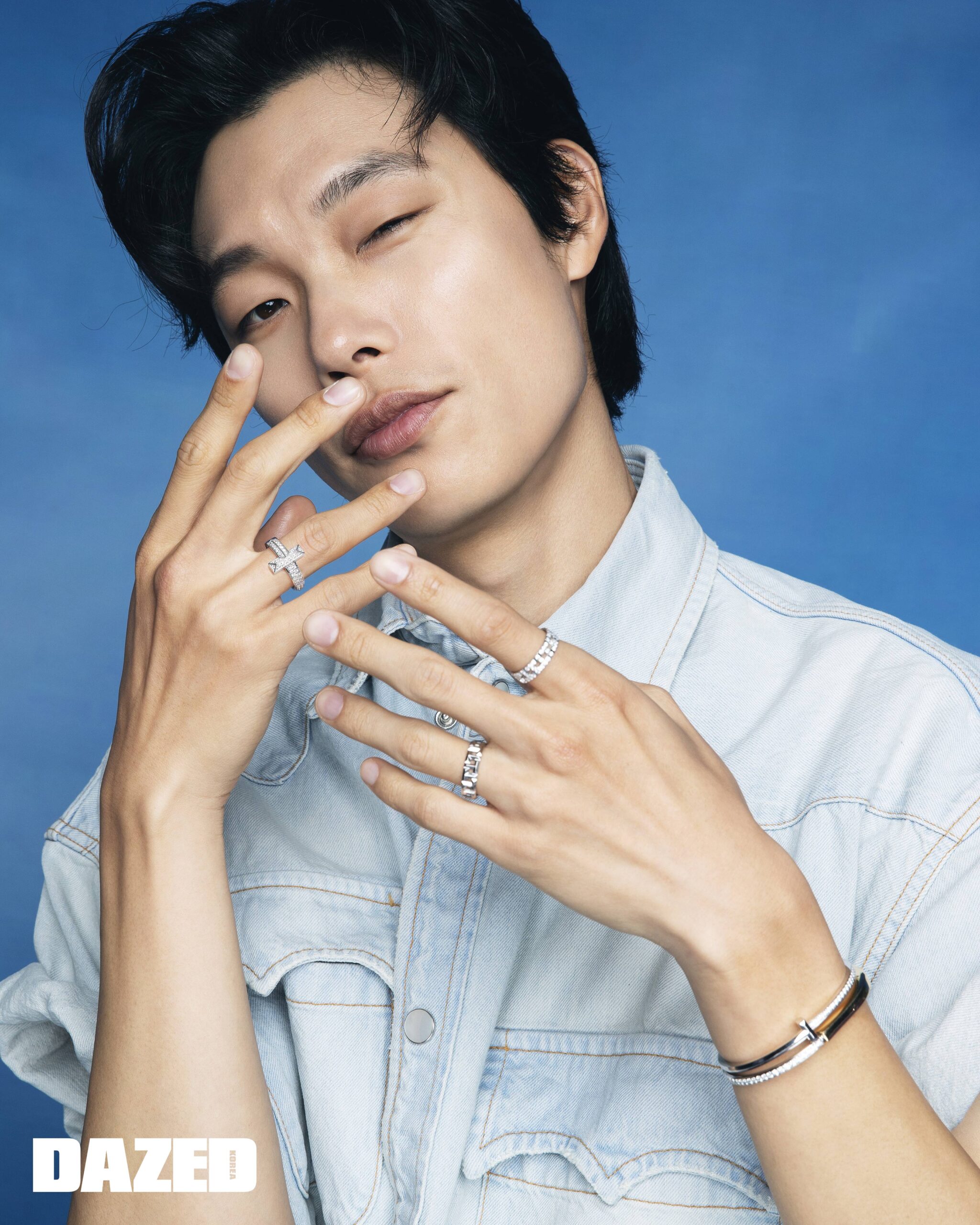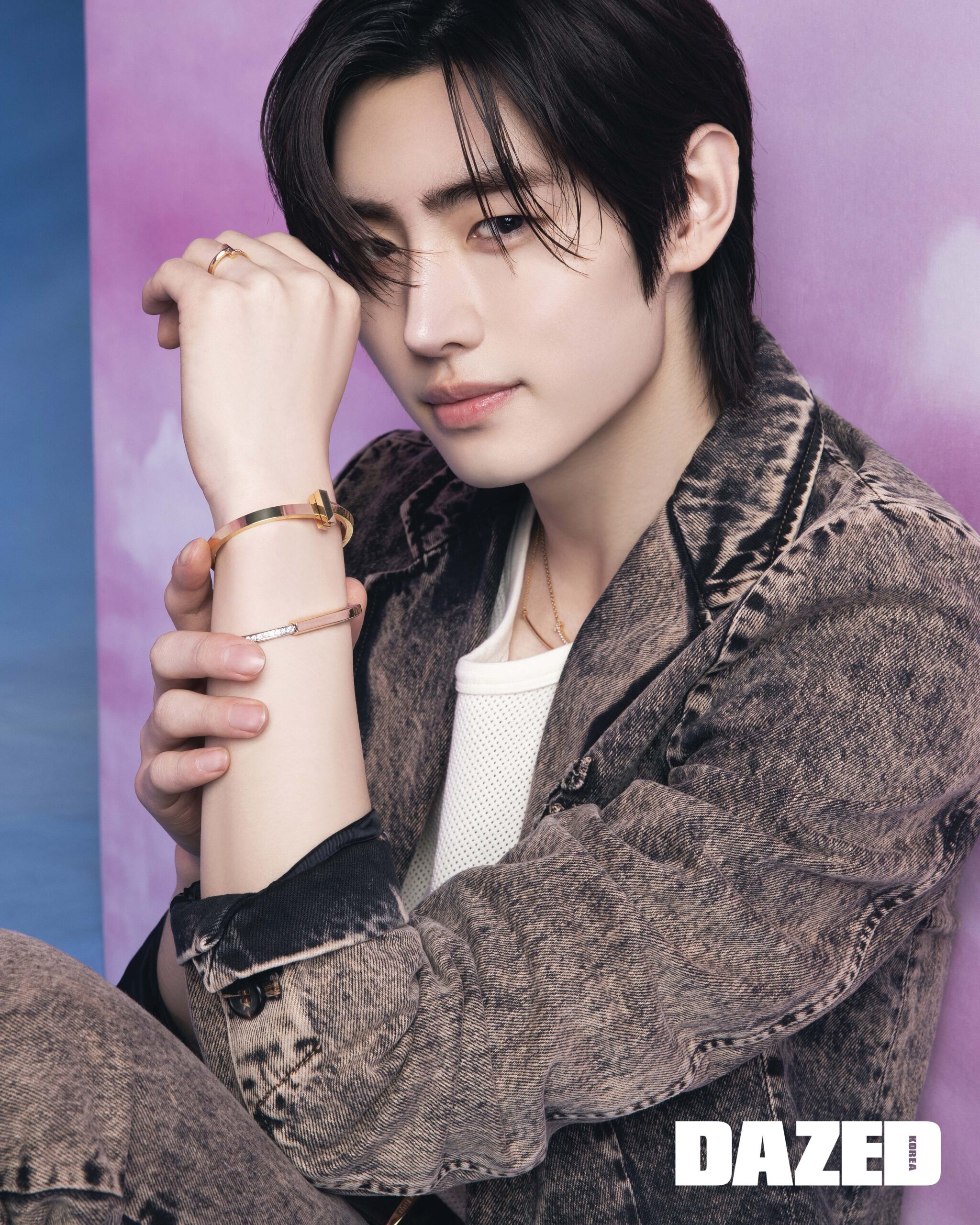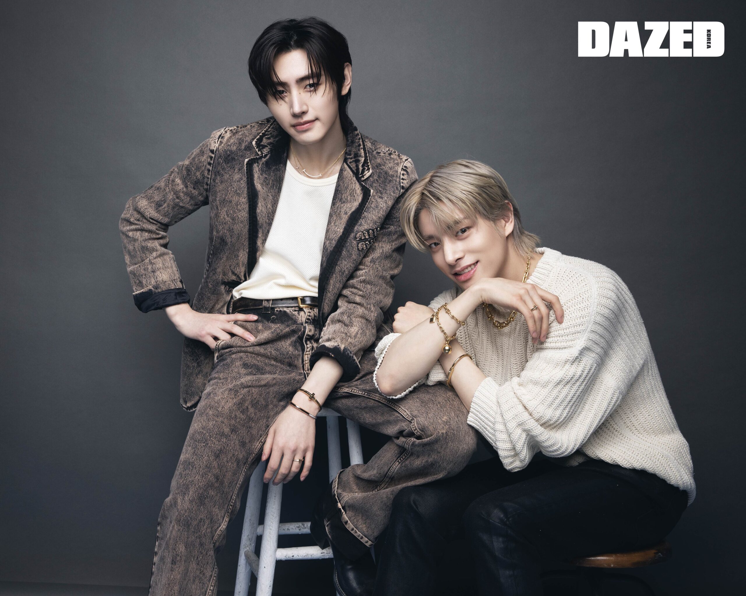 성훈이 착용한 다이아몬드를 세팅한 18K 옐로 골드 티파니 T 미디움 스마일 펜던트와 다이아몬드를 세팅한 18K 로즈 골드 티파니 T 라지 스마일 펜던트, 18K 옐로 골드 티파니 T1 와이드 힌지드 뱅글, 라운드 브릴리언트 컷 다이아몬드를 세팅한 18K 로즈 골드 티파니 락 하프 파베 다이아몬드 뱅글, 라운드 브릴리언트 컷 다이아몬드를 세팅한 18K 옐로 골드 티파니 T1 내로우 하프 다이아몬드 링은 모두 티파니(Tiffany & Co.), 데님 재킷과 팬츠 셋업은 미우미우(Miu Miu), 이너 톱은 선플라워 by 비이커(Sunflower by Beaker), 앵클부츠는 프라다(Prada), 벨트는 스타일리스트의 것. 제이크가 착용한 18K 옐로 골드 티파니 하드웨어 그레듀에이티드 링크 네크리스와 라운드 브릴리언트 컷 다이아몬드를 세팅한 18K 옐로 골드 티파니 락 다이아몬드 엑센트 뱅글, 18K 옐로 골드 티파니 하드웨어 랩 브레이슬릿, 다이아몬드를 세팅한 18K 옐로 골드 티파니 T1 내로우 하프 다이아몬드 링은 모두 티파니(Tiffany & Co.), 화이트 니트 톱은 아워레가시(Our Legacy), 데님 팬츠는 알렉산더 맥퀸(Alexander McQueen).