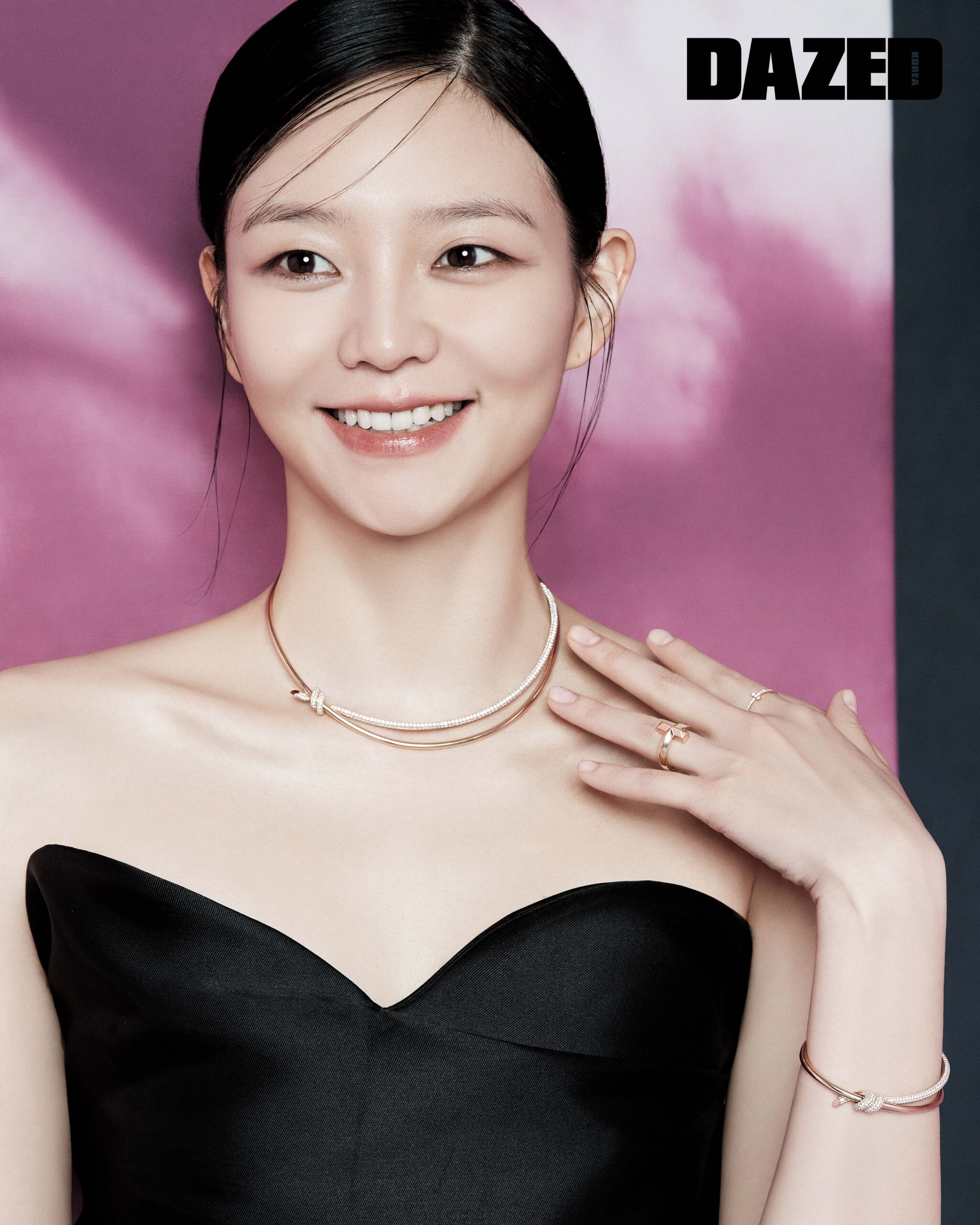 라운드 브릴리언트 컷 다이아몬드를 세팅한 18K 로즈 골드 티파니 노트 더블 로우 다이아몬드 네크리스와 라운드 브릴리언트 컷 다이아몬드를 세팅한 18K 로즈 골드 티파니 노트 더블 로우 다이아몬드 힌지드 뱅글, 라운드 브릴리언트 컷 다이아몬드를 세팅한 18K 로즈 골드 티파니 T1 와이드 하프 다이아몬드 링, 다이아몬드를 세팅한 18K 로즈 골드 티파니 T 와이어 FC 링은 모두 티파니(Tiffany & Co.), 드레스는 딘트(Dint), 스트랩 스틸레토 힐은 세르지오 로시(Sergio Rossi).