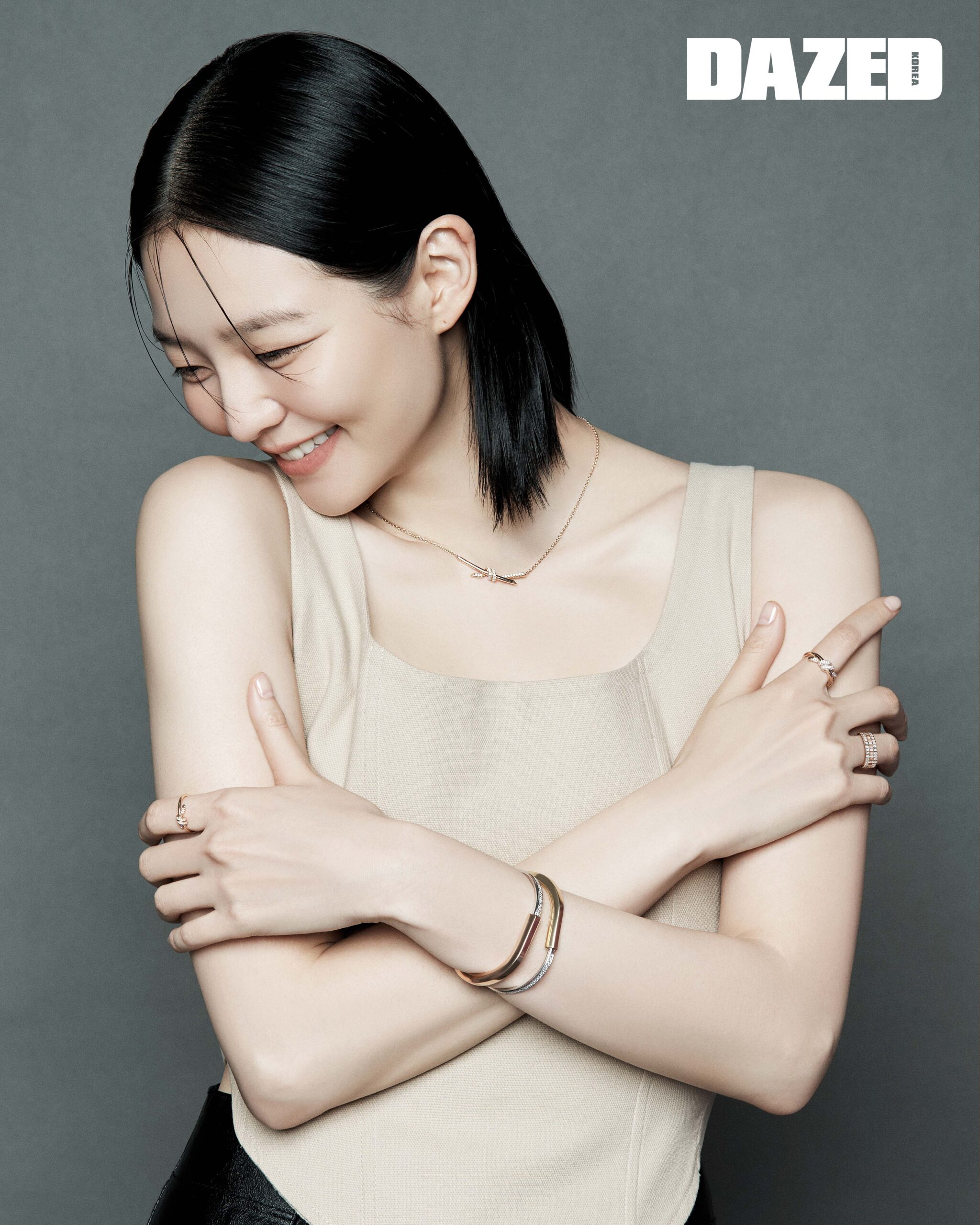 다이아몬드를 세팅한 18K 옐로 골드 티파니 T 미디움 스마일 펜던트와 다이아몬드를 세팅한 18K 로즈 골드 티파니 T 라지 스마일 펜던트, 18K 옐로 골드 티파니 T1 와이드 힌지드 뱅글, 라운드 브릴리언트 컷 다이아몬드를 세팅한 18K 로즈 골드 티파니 락 하프 파베 다이아몬드 뱅글, 라운드 브릴리언트 컷 다이아몬드를 세팅한 18K 옐로 골드 티파니 T1 내로우 하프 다이아몬드 링은 모두 티파니(Tiffany & Co.), 데님 재킷과 팬츠 셋업은 미우미우(Miu Miu), 이너 톱은 선플라워 by 비이커(Sunflower by Beaker), 벨트는 스타일리스트의 것.