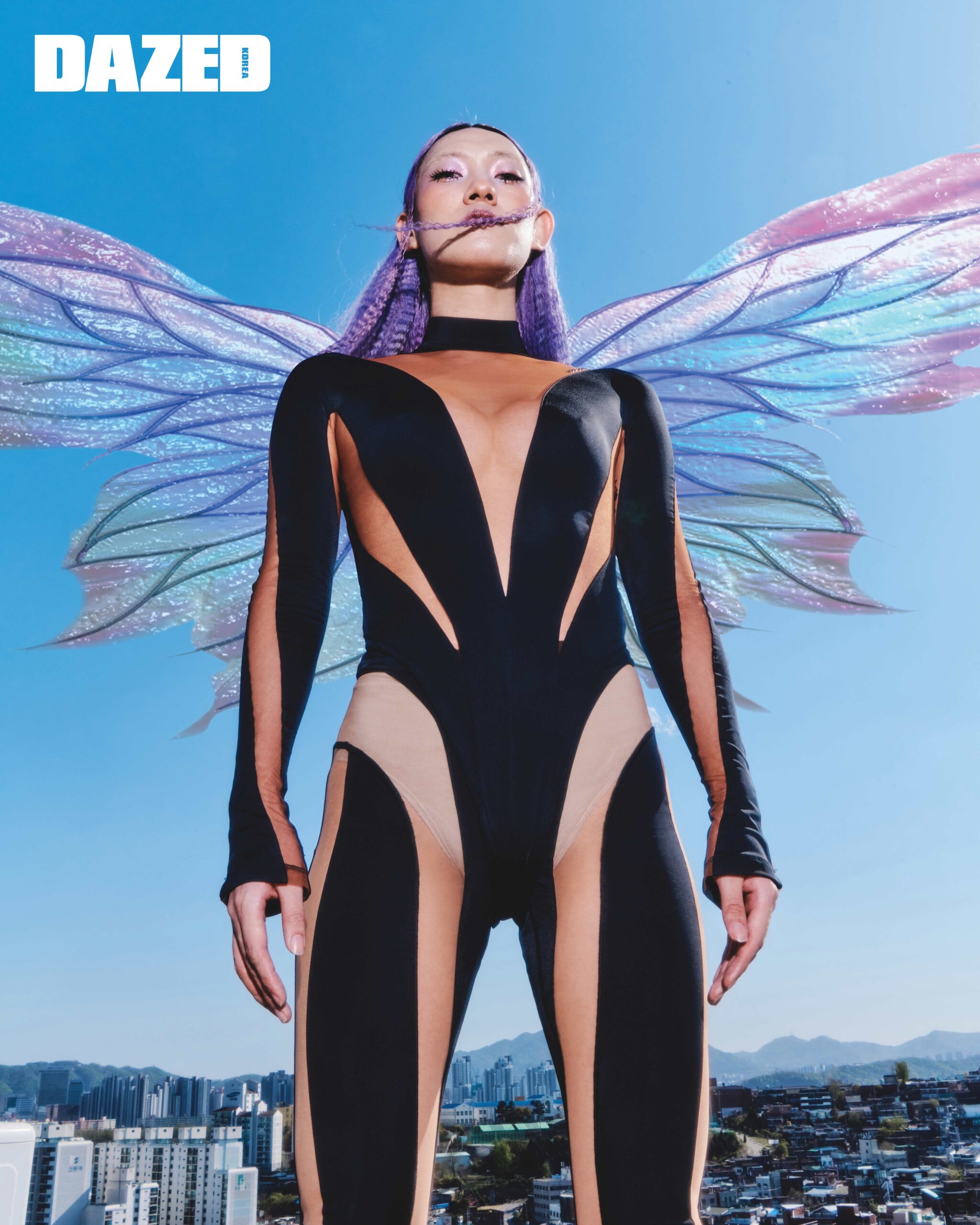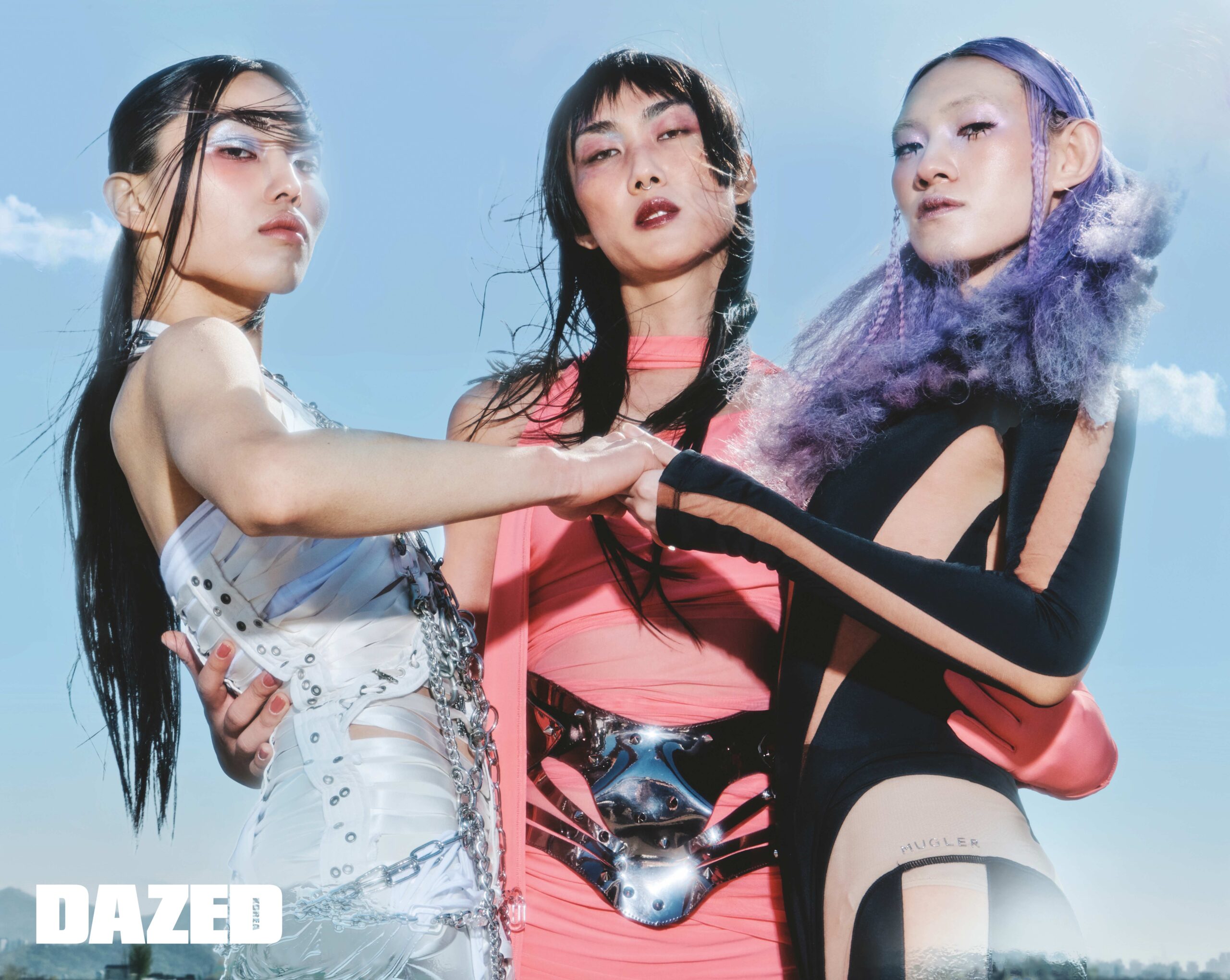 이 입은 스트랩 디테일 드레스와 화이트 이너 톱은 미나정(Mina Chung), 실버 체인 보디 피스는 올가미(Olgami). 정글이 입은 비대칭 드레스는 뮈글러×에이치앤엠(Mugler×H&M), 실버 코르셋은 노쿠노쿠(Noku Noku). 나비가 입은 패널 디테일 시스루 보디슈트와 시스루 타이츠는 뮈글러×에이치앤엠(Mugler×H&M).