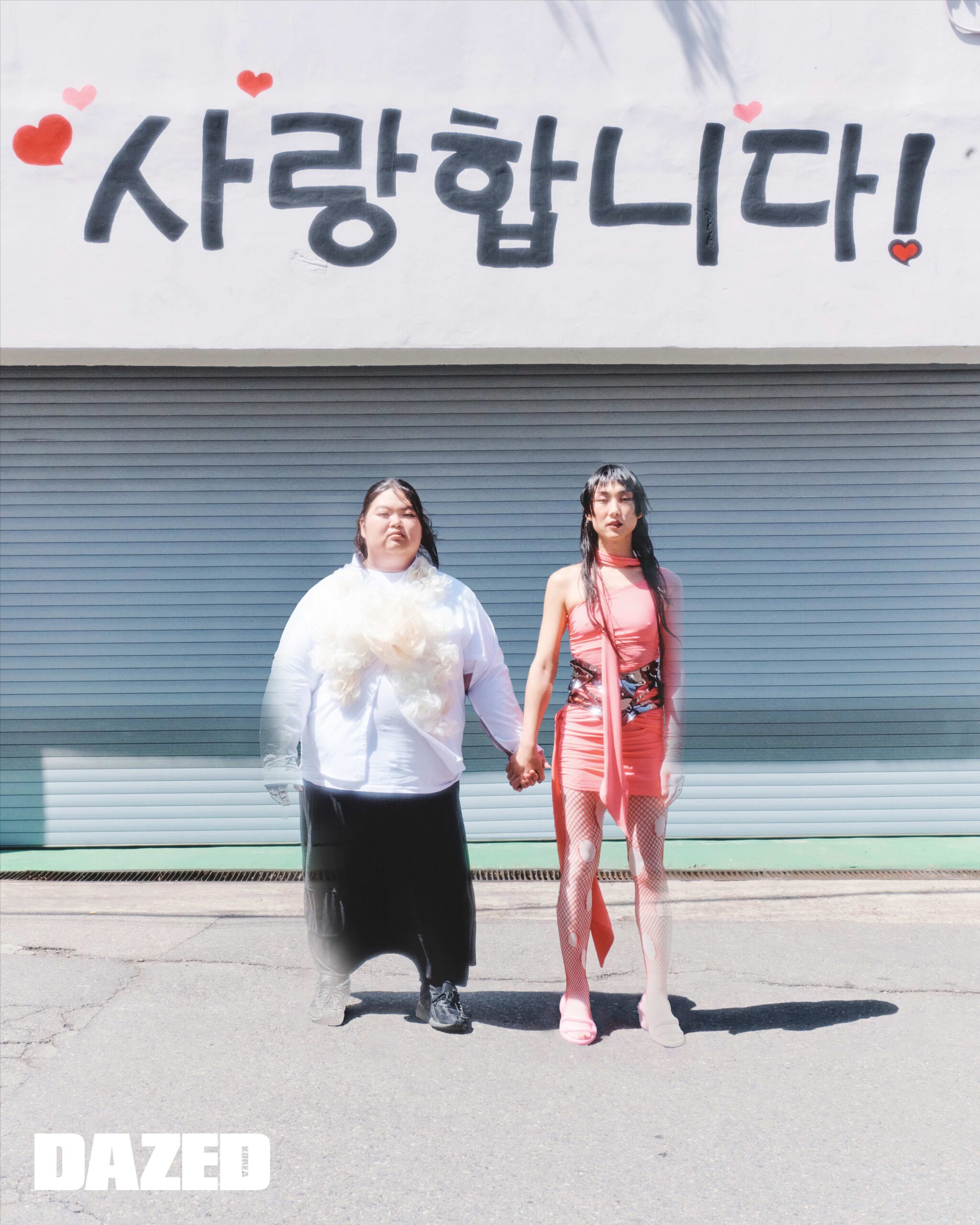 키라라가 입은 블랙 롱스커트와 스니커즈, 삭스는 키라라의 것, 코르사주 디테일 셔츠와 이너 티셔츠는 에디터의 것. 정글이 입은 비대칭 드레스는 뮈글러×에이치앤엠(Mugler×H&M), 핑크 펌프스는 캠퍼(Camper), 실버 코르셋은 노쿠노쿠(Noku Noku), 화이트 타이츠와 네트 타이츠는 에디터의 것.