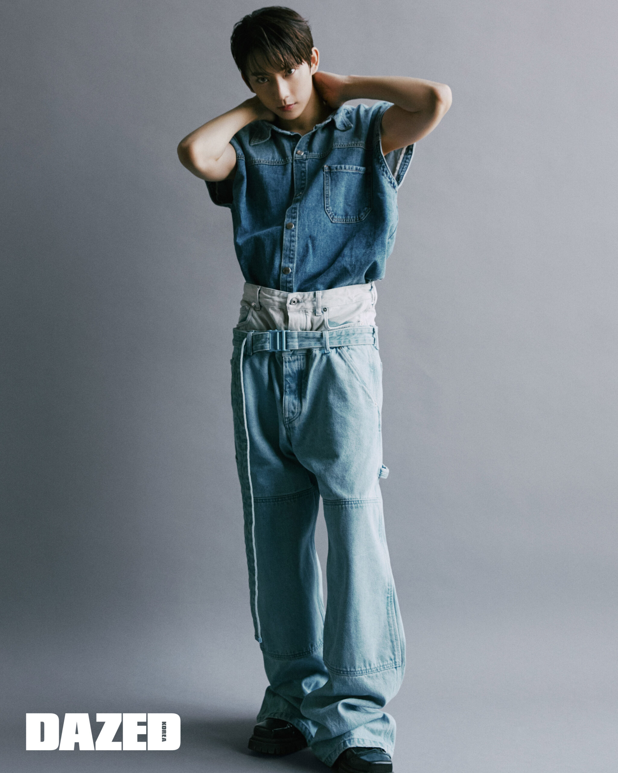 데님 베스트는 퀴즈(Kuiz), 데님 팬츠는 오프 화이트(Off-WhiteTM), 슈즈는 손신발(Sonshinbal).