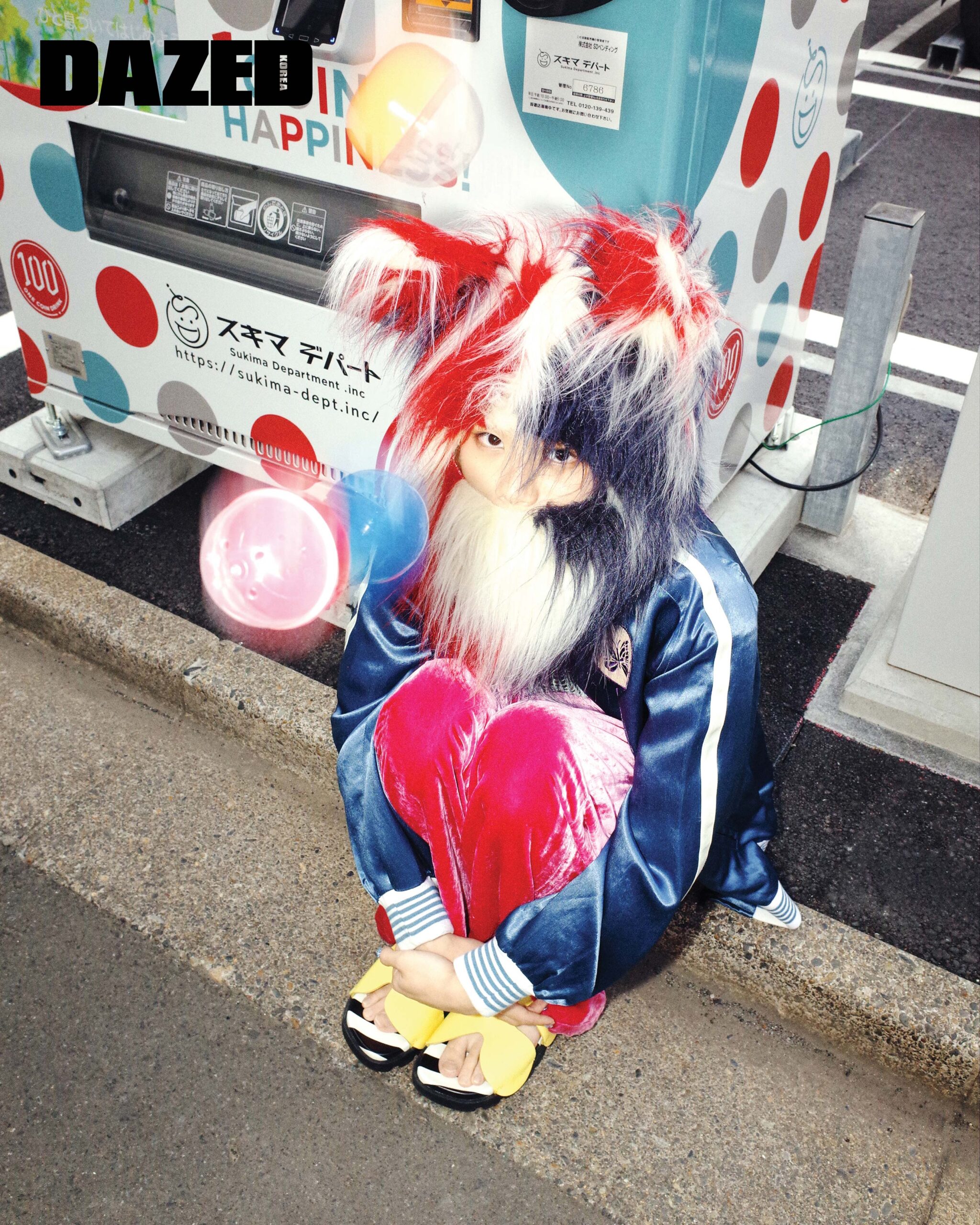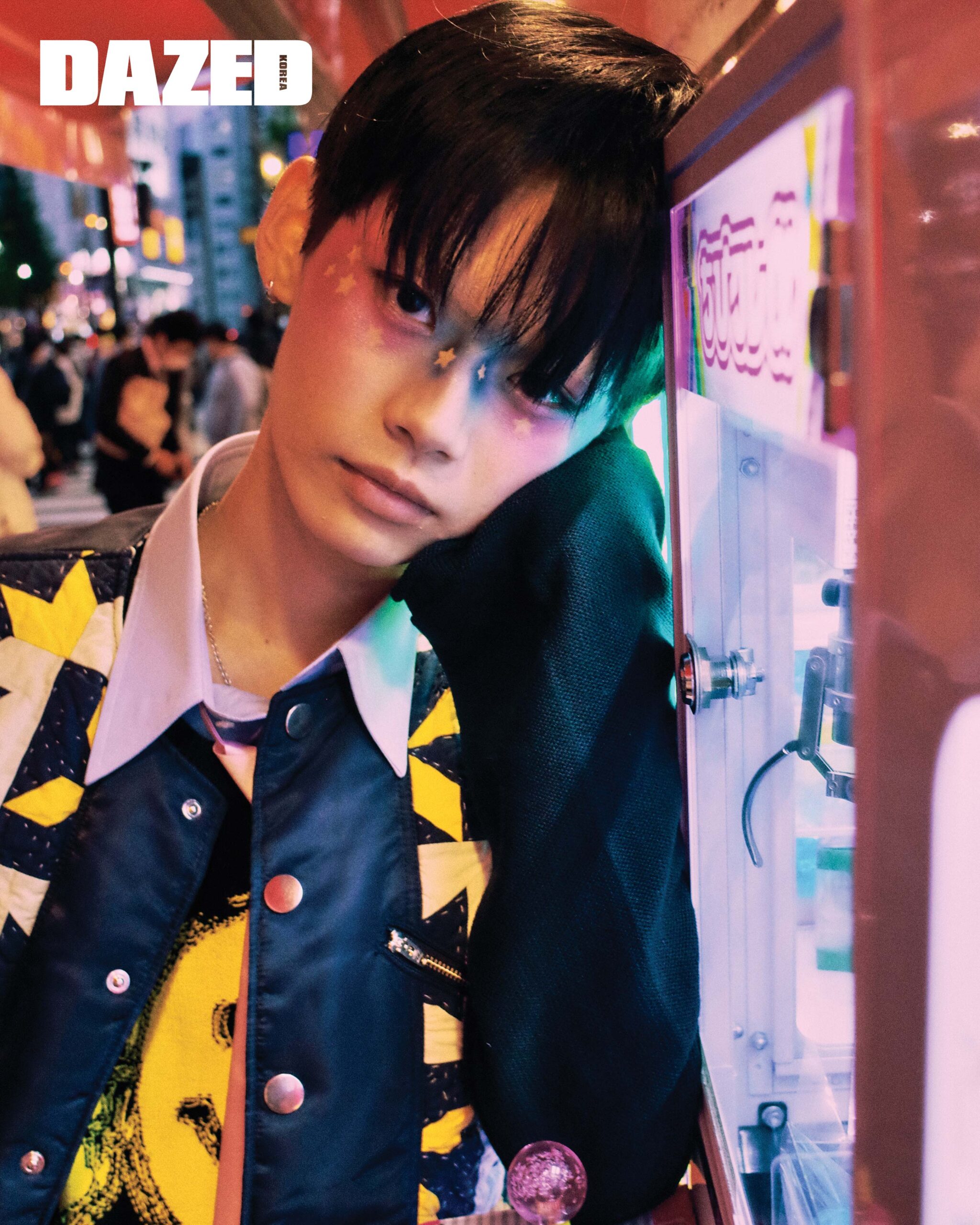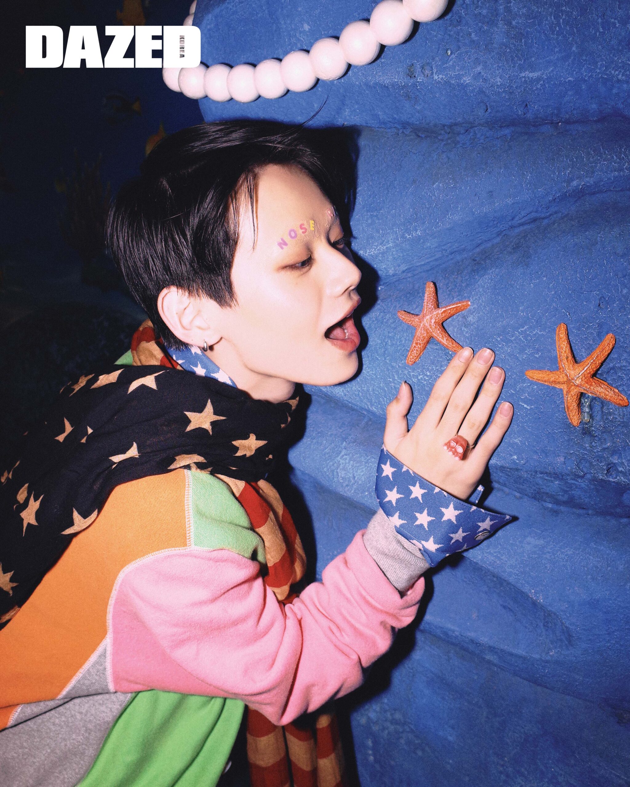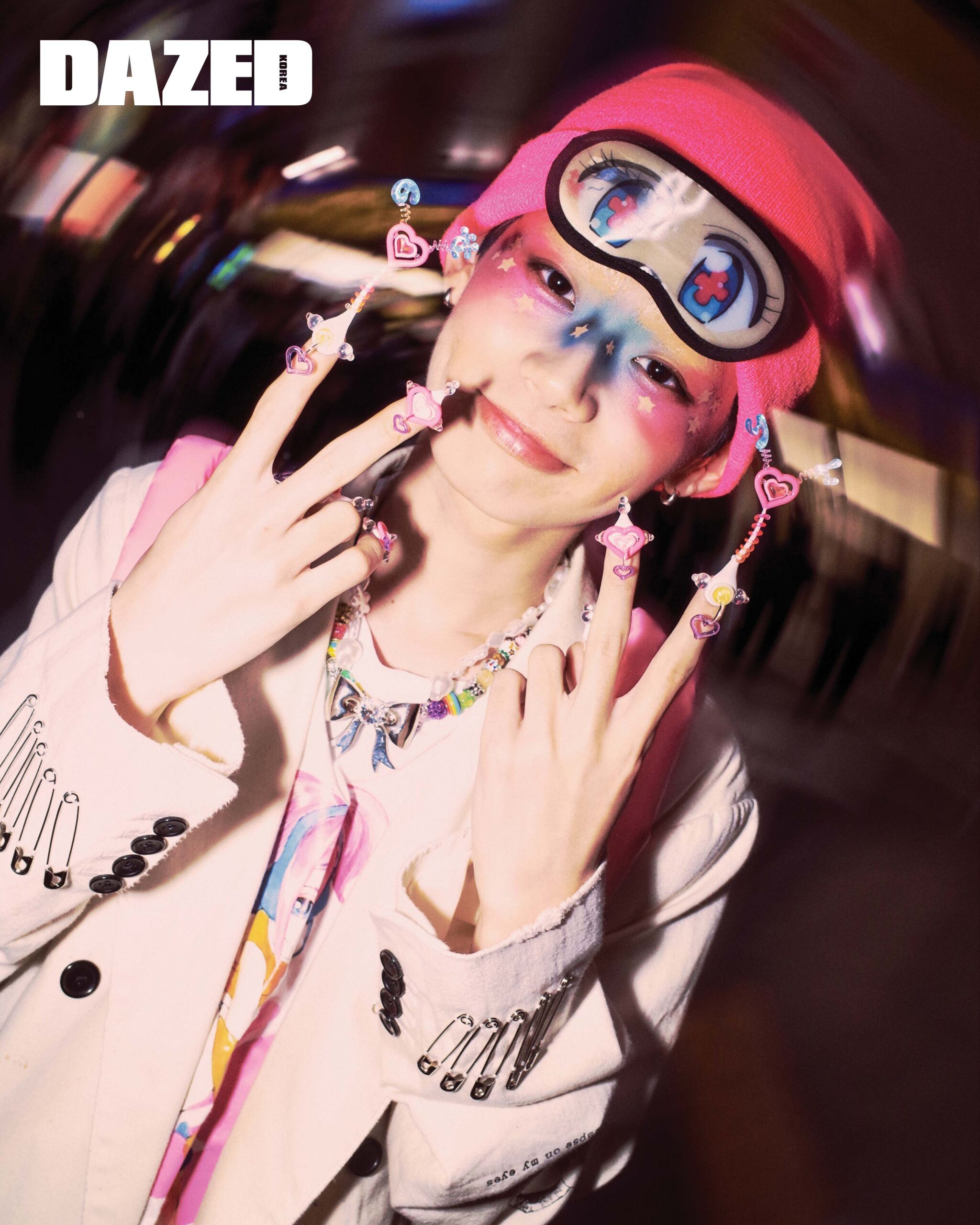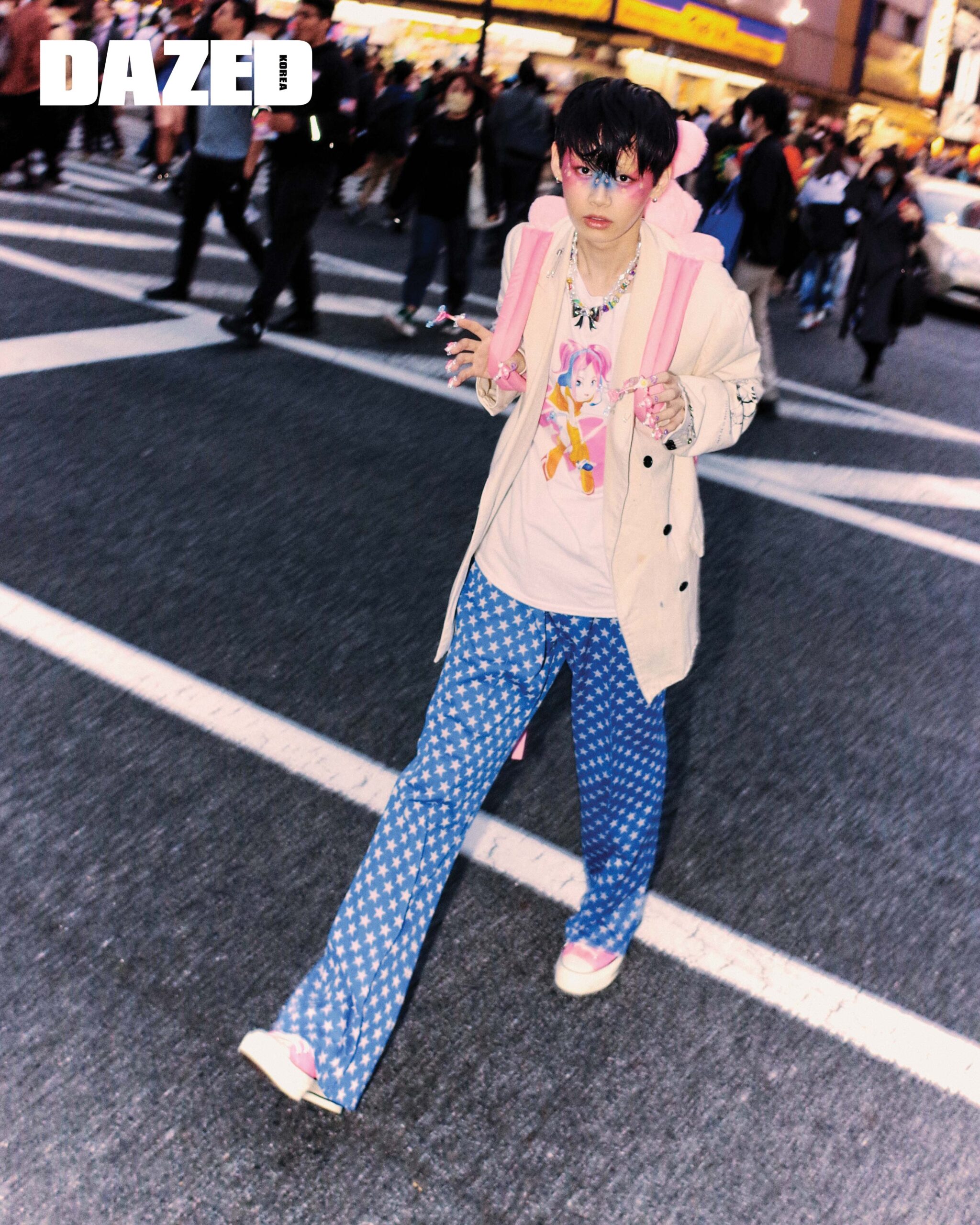 프린트 재킷은 키드일×마인데님(Kidill×Minedenim), 프린트 티셔츠와 비니는 키집(Kizip), 스타 프린트 팬츠는 니들스(Needles), 슈즈는 컨버스(Converse), 래빗 백팩은 제니폭스(Jennyfax), 멀티컬러 비즈 네크리스와 리본 펜던트 펄 네크리스는 허자보이에이씨씨(Hurjaboyacc).