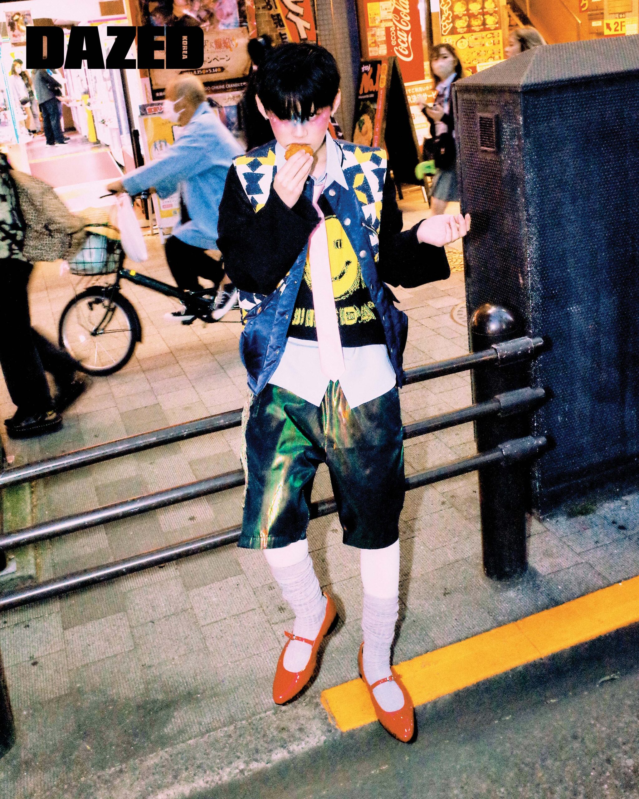 엠브로이더리 디테일 베스트는 코키(Khoki), 스마일 프린트 니트 톱은 지에다(JieDa), 셔츠와 메리제인 슈즈는 마수(Masu), 멀티컬러 하프 팬츠는 더블렛(Doublet), 타이와 타이츠, 니삭스는 모두 에디터의 것.