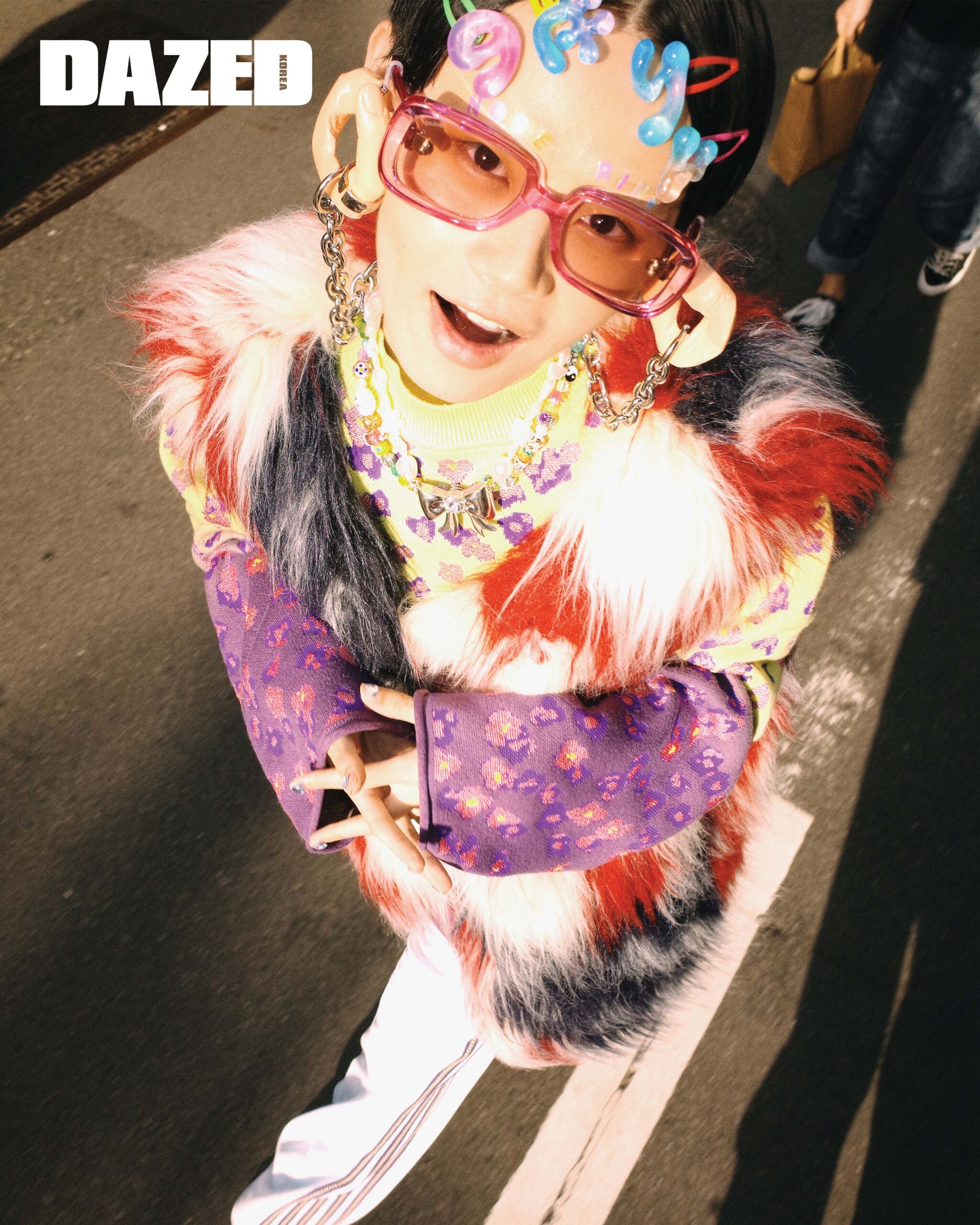 퍼 베스트는 마수(Masu), 레오퍼드 프린트 니트 톱은 키드일×루루무(Kidill×rurumu:), 트랙 팬츠는 지에다(JieDa), 슈즈는 닥터마틴(Dr. Martens), 멀티컬러 비즈 네크리스와 리본 펜던트 펄 네크리스는 허자보이에이씨씨(Hurjaboyacc), 선글라스 홀더는 더블렛(Doublet), 선글라스는 더블렛×블랑(Doublet×Blanc).