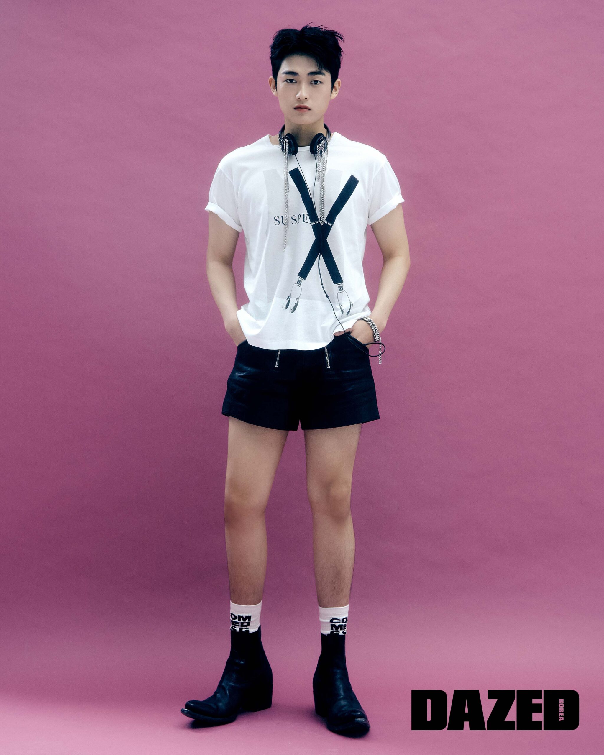 레더 쇼츠와 부츠는 프라다(Prada), 레터링 삭스는 꼼데가르송(Comme des Garçons), 체인 브레이슬릿과 체인 장식 헤드폰은 미세서울(Miséseoul), 하프 슬리브 티셔츠는 에디터의 것.