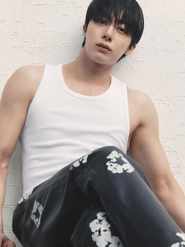 원 슬리브 톱은 지민리(Jiminlee), 그래픽 프린트 팬츠는 파라다이스 유스 클럽 by 엠프티(Paradise Youth Club by E.M.P.T.Y), 언더웨어는 프라다(Prada), 볼드 체인 브레이슬릿은 크롬하츠(Chrome Hearts), 블랙 카디건은 디렉터의 것.