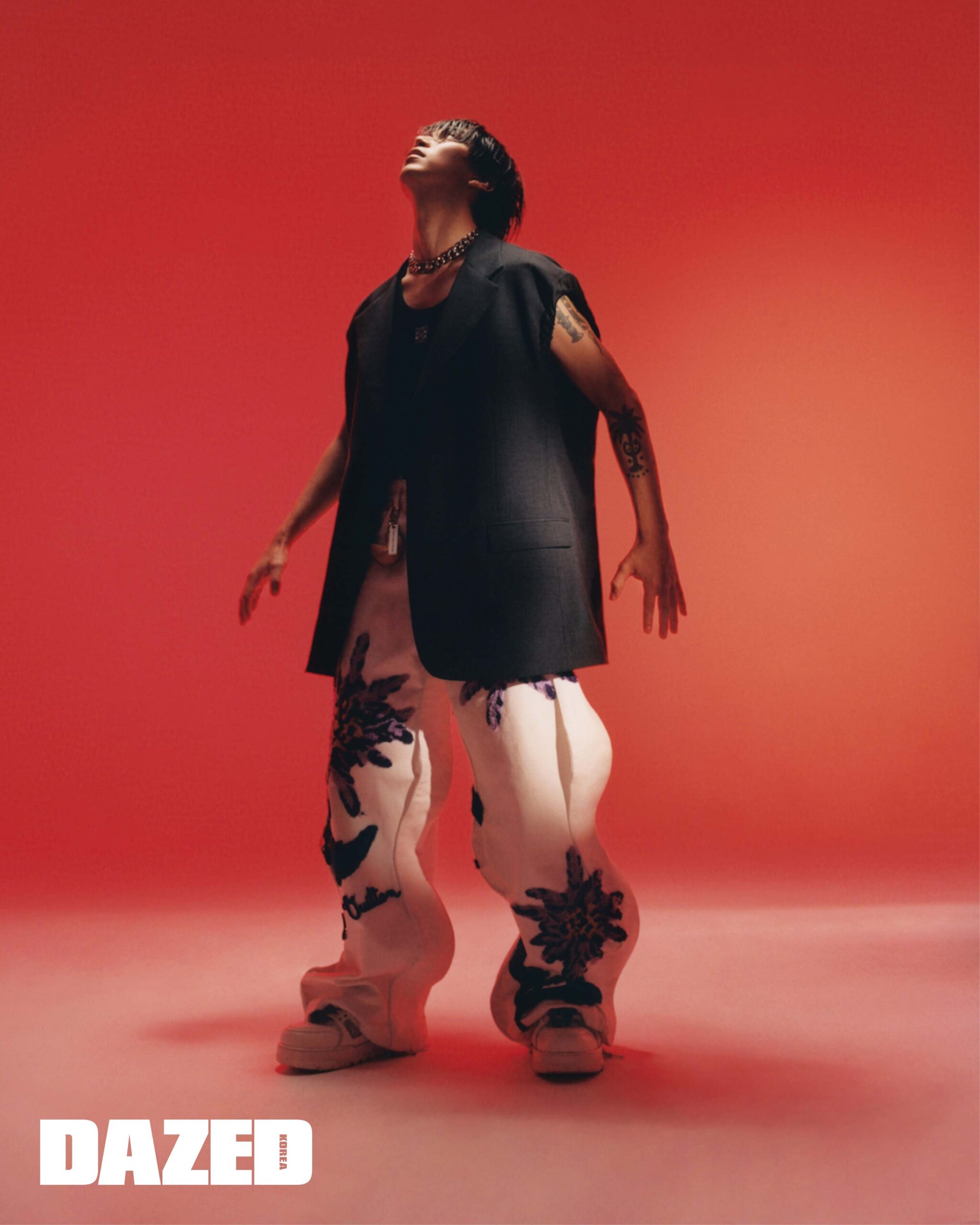 슬리브리스 싱글브레스트 재킷은 라프 시몬스 by 지스트리트 494 옴므(Raf Simons by G.Street 494 Homme), 엠브로이더리 슬리브리스 톱은 로에베(Loewe), 엠브로이더리 데님 팬츠와 트레이너 맥시 스니커즈는 루이 비통(Louis Vuitton), 네크리스와 참은 디렉터의 것.
