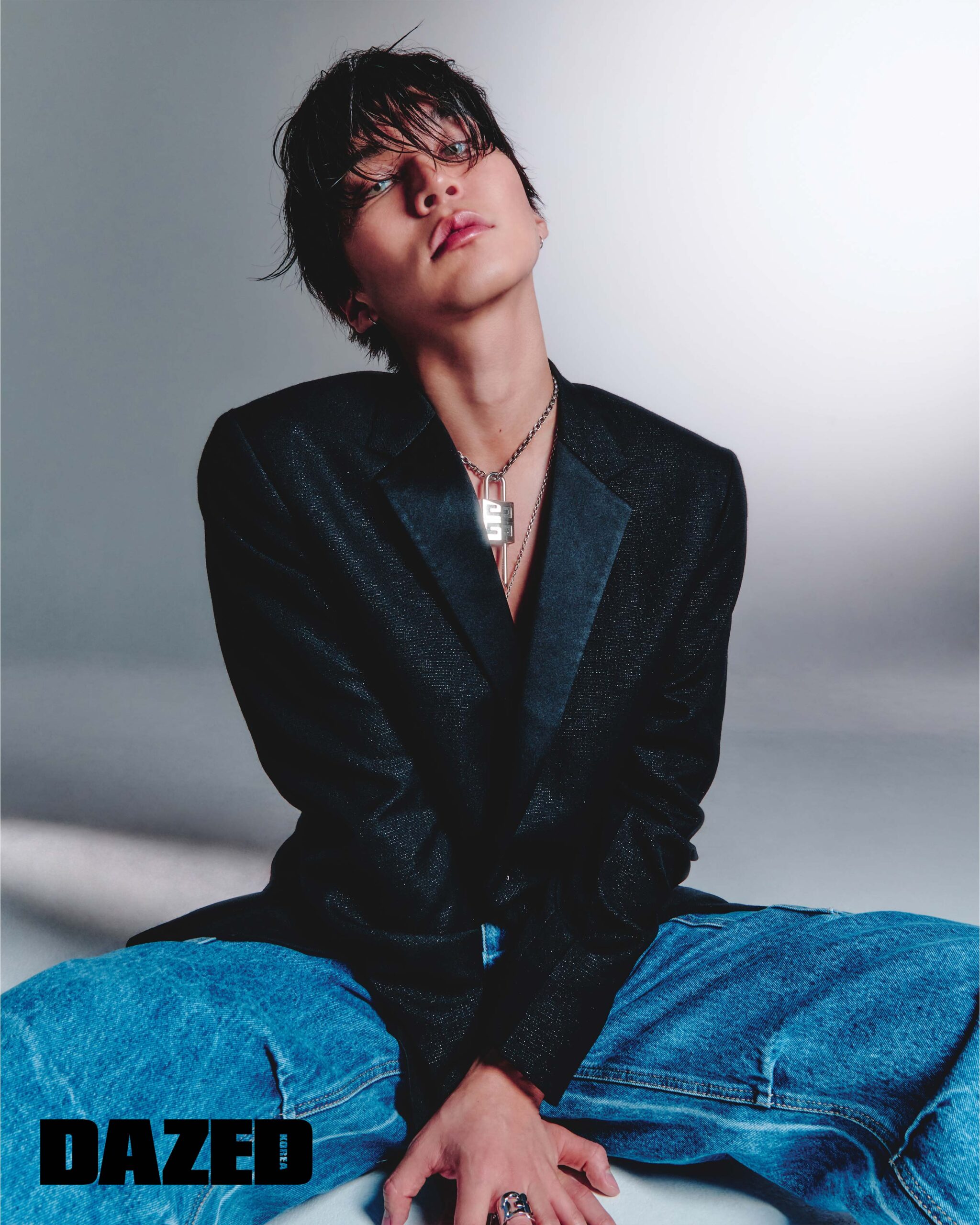 싱글브레스트 재킷과 포켓 데님 팬츠, 볼드 링은 모두 지방시(Givenchy), 볼드 체인 네크리스는 모르스 보나(Mors Bona), 레이어링한 롱 체인 네크리스는 크롬하츠(Chrome Hearts), 자물쇠 모티브 펜던트는 디렉터의 것.
