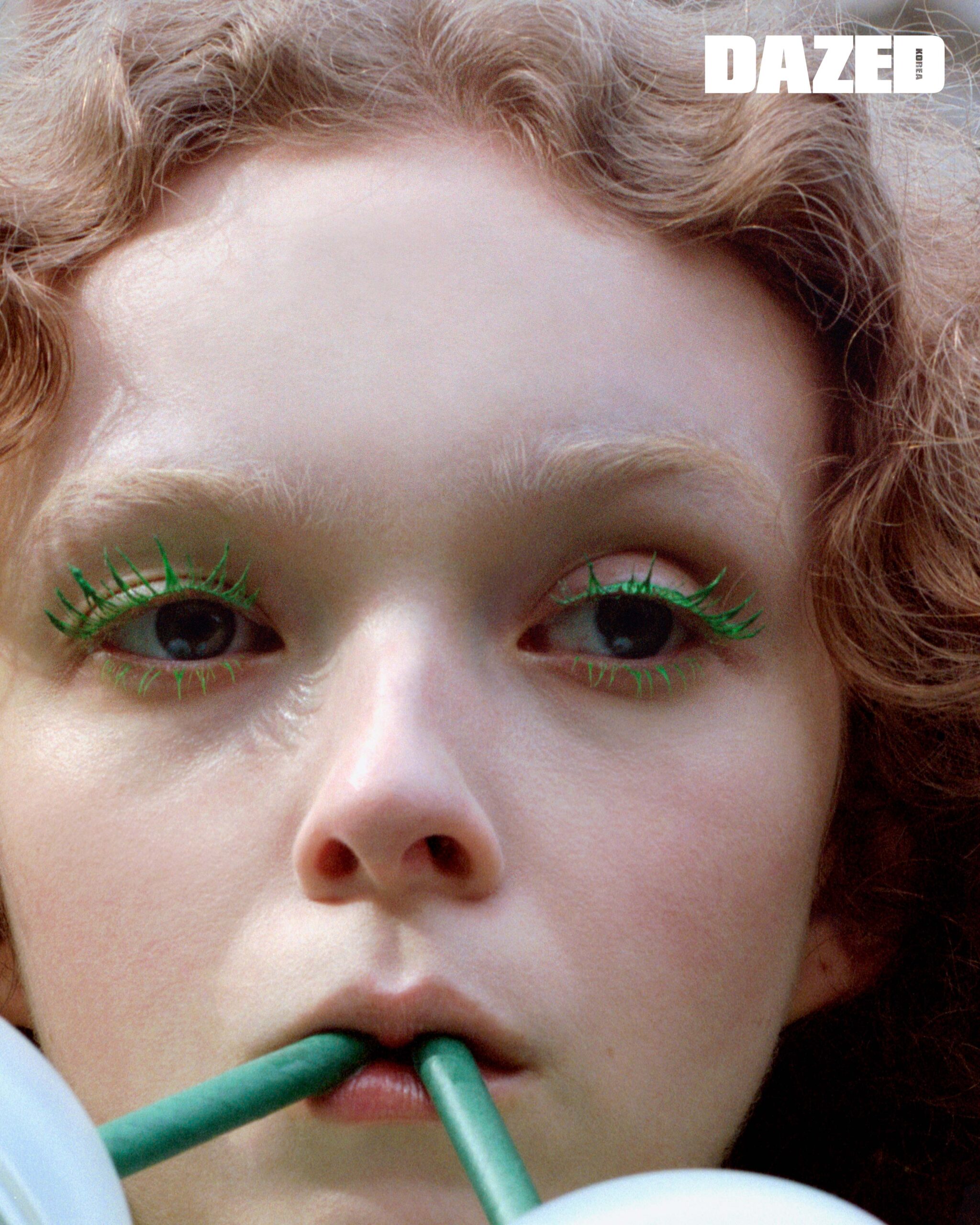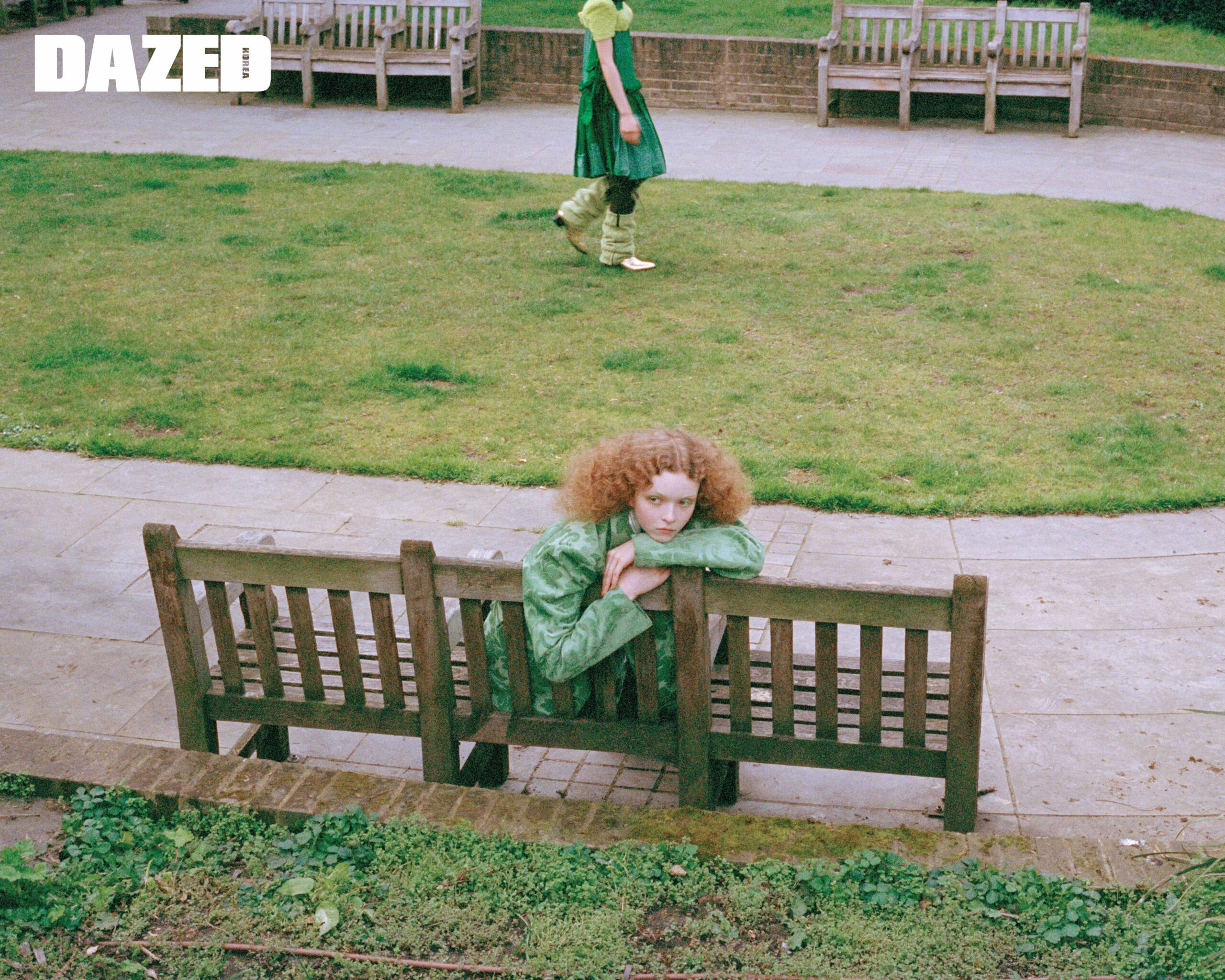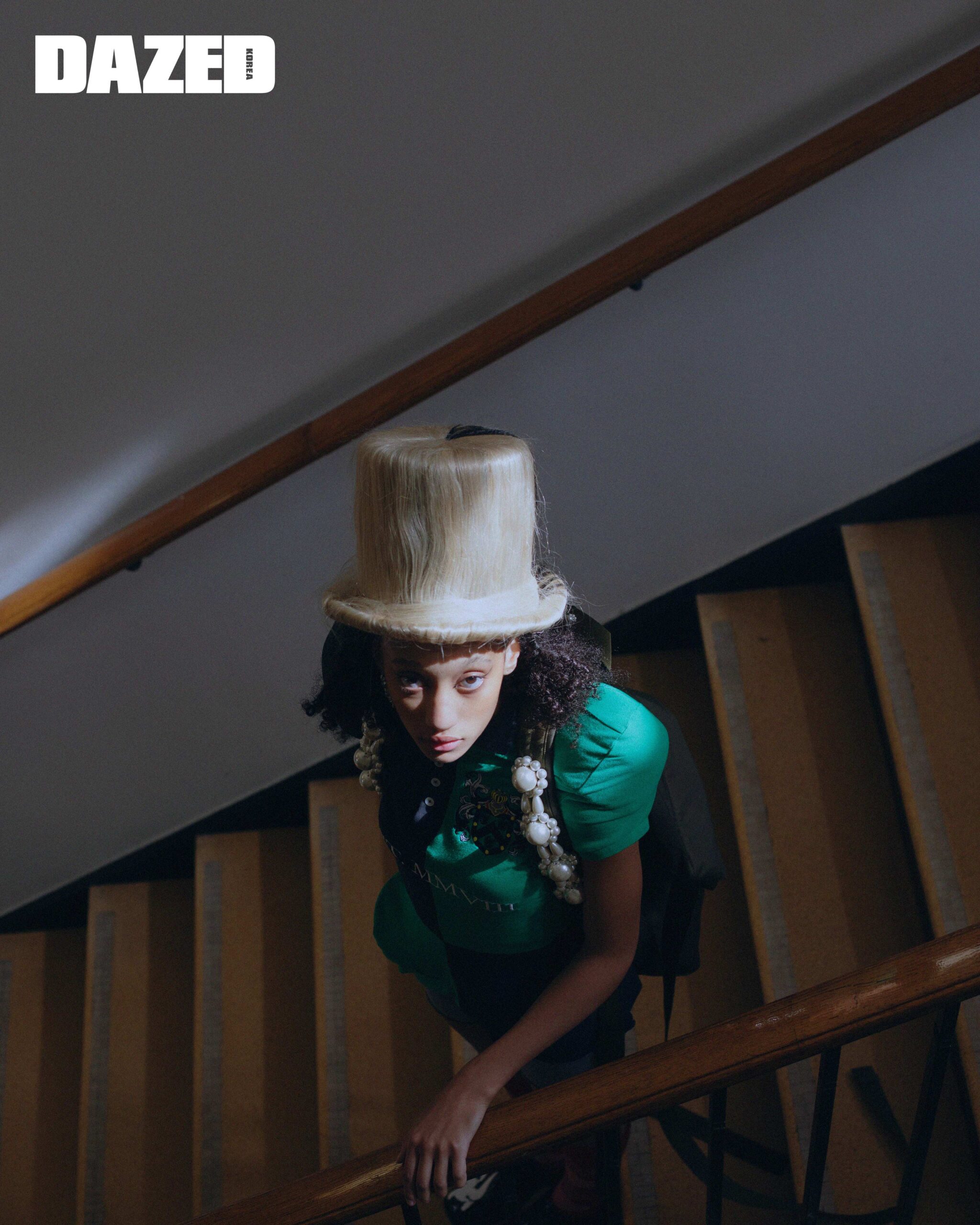그린 톱과 쇼츠, 모헤어 해트는 모두 라우라 앤드라슈코(Laura Andraschko), 슈즈는 스테판 쿡(Stefan Cooke), 펄 장식 백은 시몬 로샤(Simone Rocha).