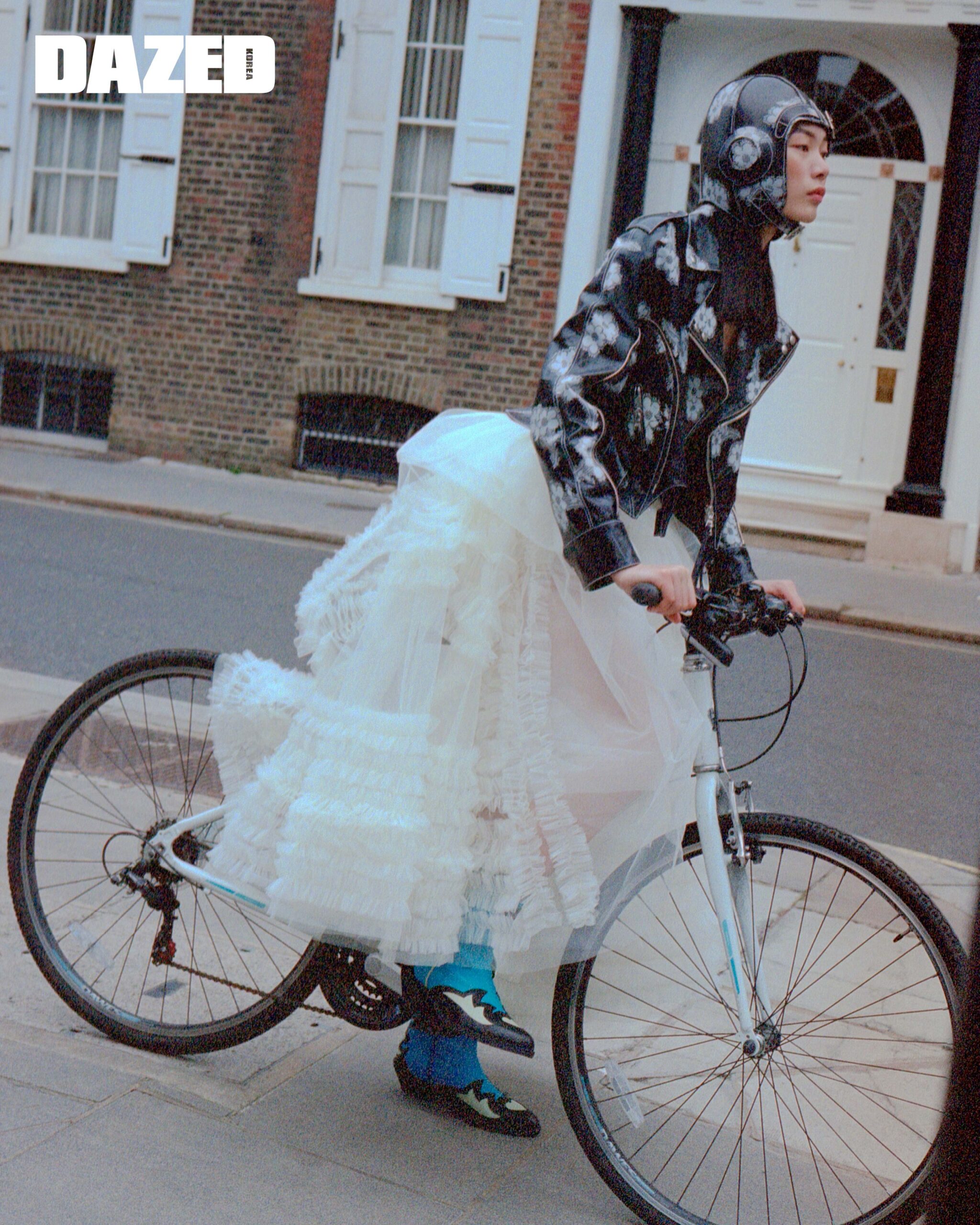 화이트 플라워 프린트가 돋보이는 레더 재킷과 헬멧은 유한 왕(Yuhan Wang), 화이트 롱스커트와 슈즈는 몰리 고다드(Molly Goddard).