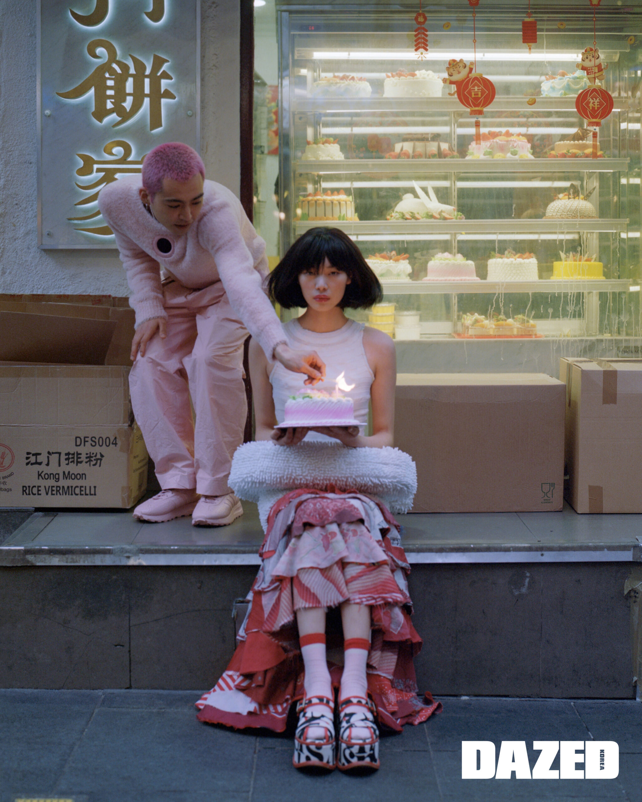 마키토가 입은 핑크 니트 톱과 핑크 팬츠, 핑크 스니커즈는 모두 크레이그 그린(Craig Green). 빙빙이 입은 화이트 톱과 롱스커트는 코너 아이브스(Conner Ives), 레이어링한 스커트는 웁스 왕(Oops Wang), 프린트가 돋보이는 슈즈는 비비안 웨스트우드(Vivienne Westwood).