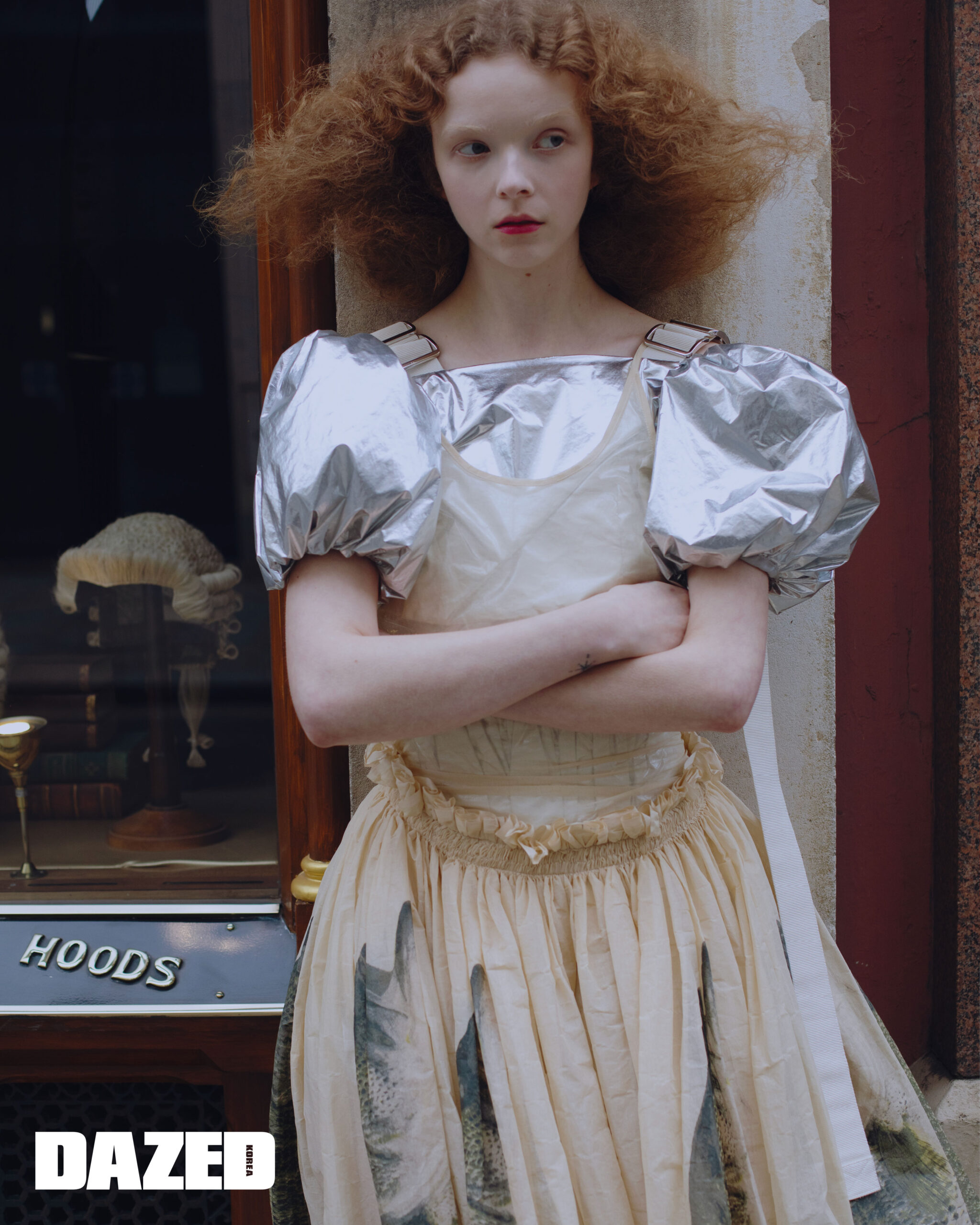 실버 드레스는 시몬 로샤(Simone Rocha), 레이어링한 베이지 드레스는 벨라 윈(Bella Wynne).