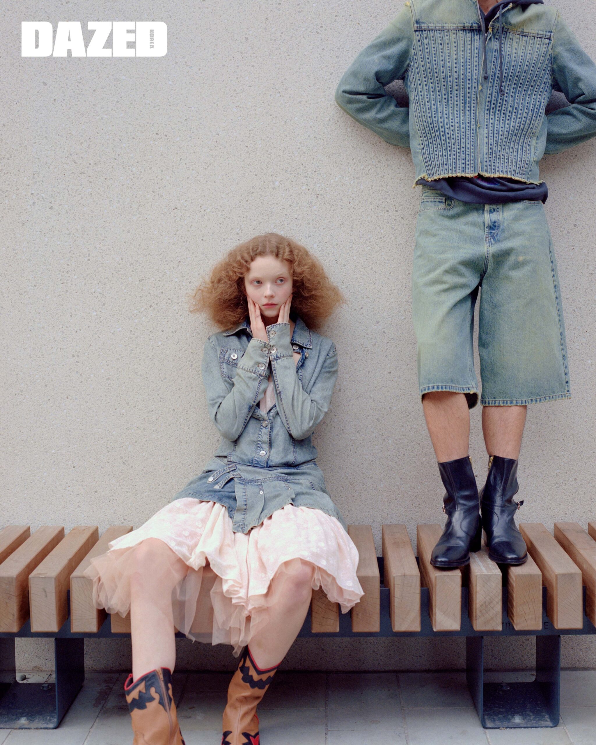 릴리가 입은 데님 드레스는 노울스(Knwls), 레이어링한 핑크 드레스는 벨라 윈(Bella Wynne), 브라운 부츠는 몰리 고다드(Molly Goddard). 마키토가 입은 데님 재킷과 쇼츠는 스테판 쿡(Stefan Cooke), 네이비 후드 톱은 JW 앤더슨(JW Anderson), 블랙 부츠는 비비안 웨스트우드(Vivienne Westwood).
