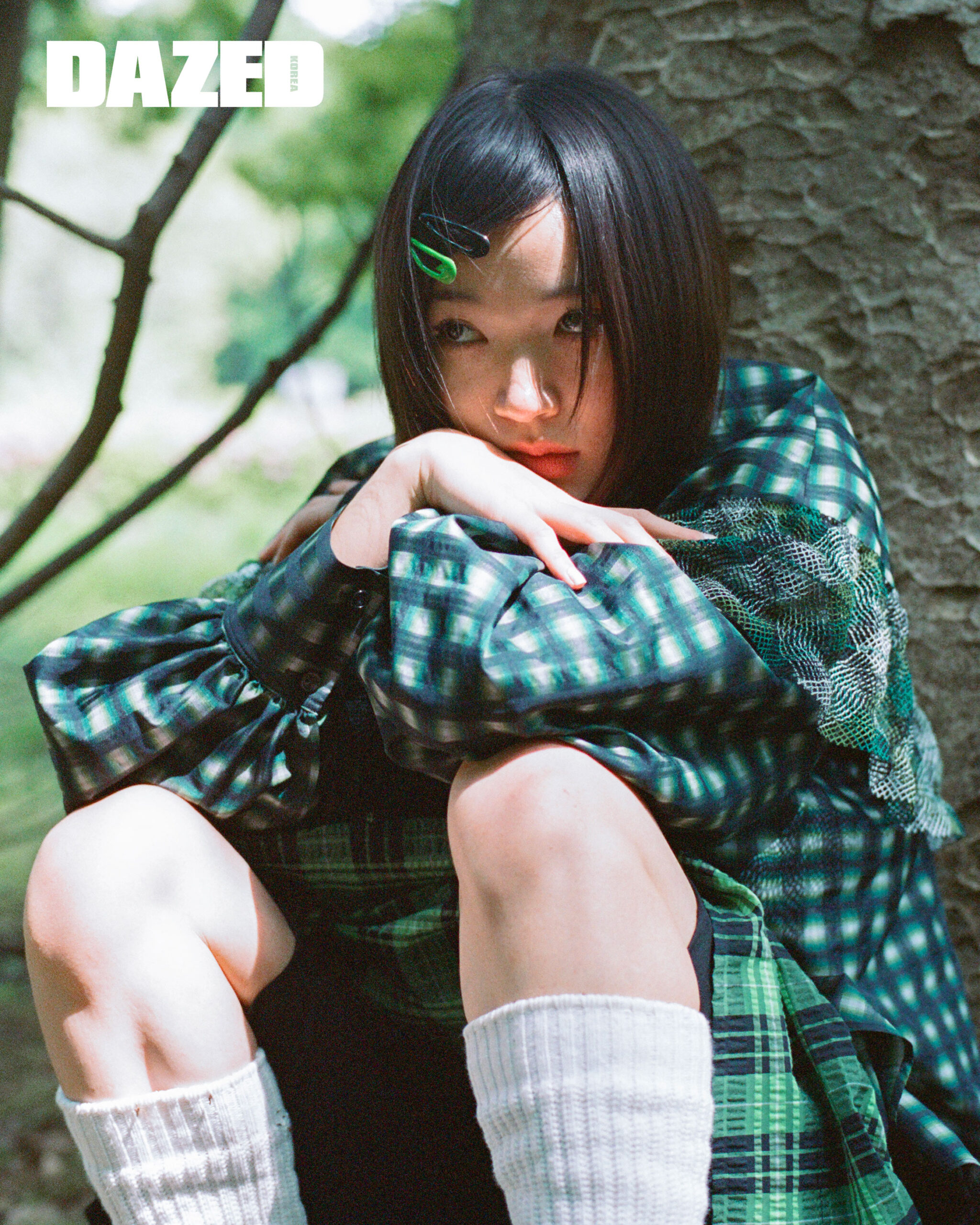 체크 블라우스는 아이레나(iRENA), 체크 미니드레스는 가니(Ganni), 스커트를 레이어링한 하프 팬츠는 지브이지브이(G.V.G.V), 니삭스는 스타일리스트의 것.