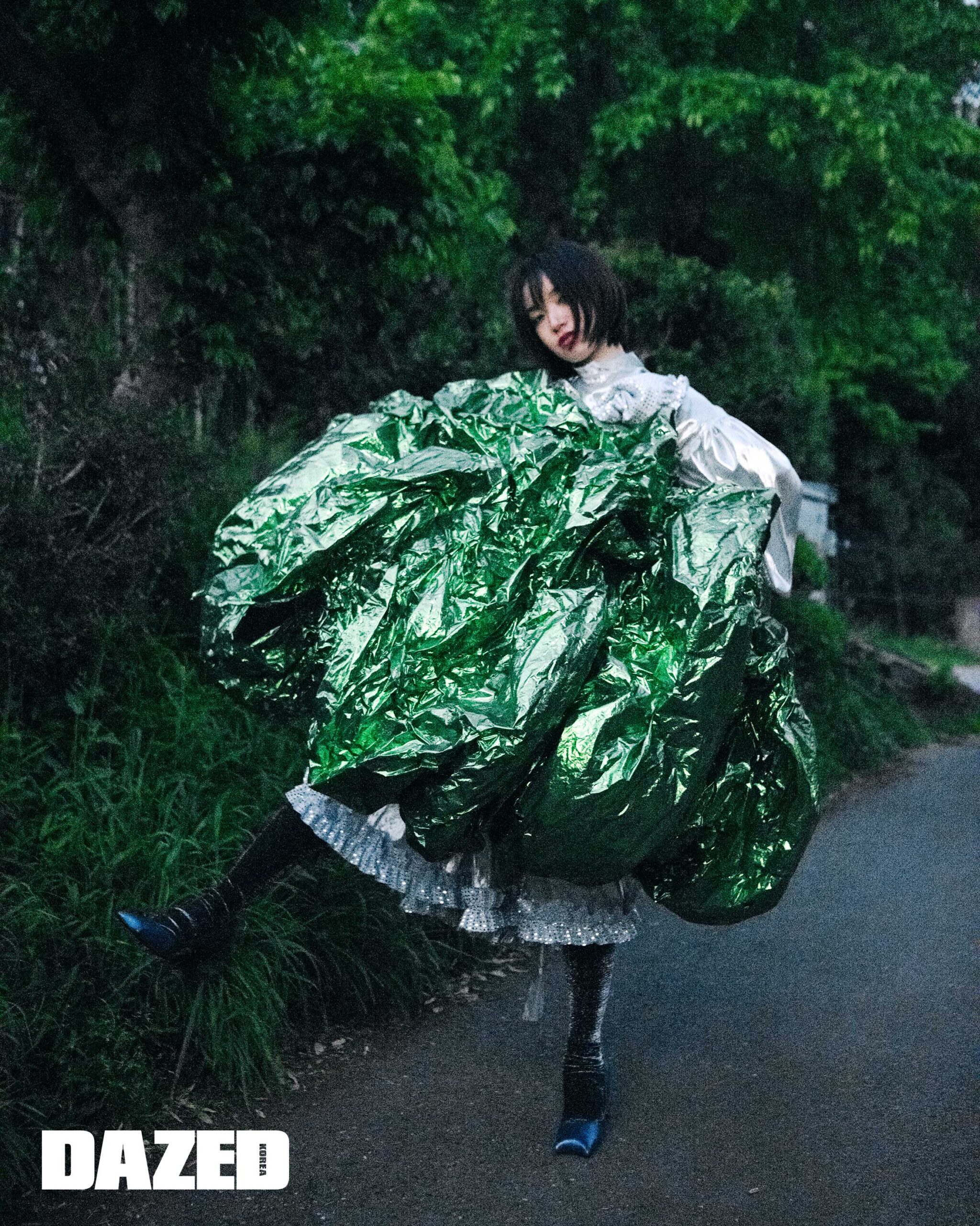 그린 미니드레스는 언더커버(Undercover), 리본 디테일 실버 드레스는 미키오사카베(Mikiosakabe),슈즈는 폴라 카노바스 델 바스(Paula Canovas del Vas), 벨벳 타이츠는 스타일리스트의 것.