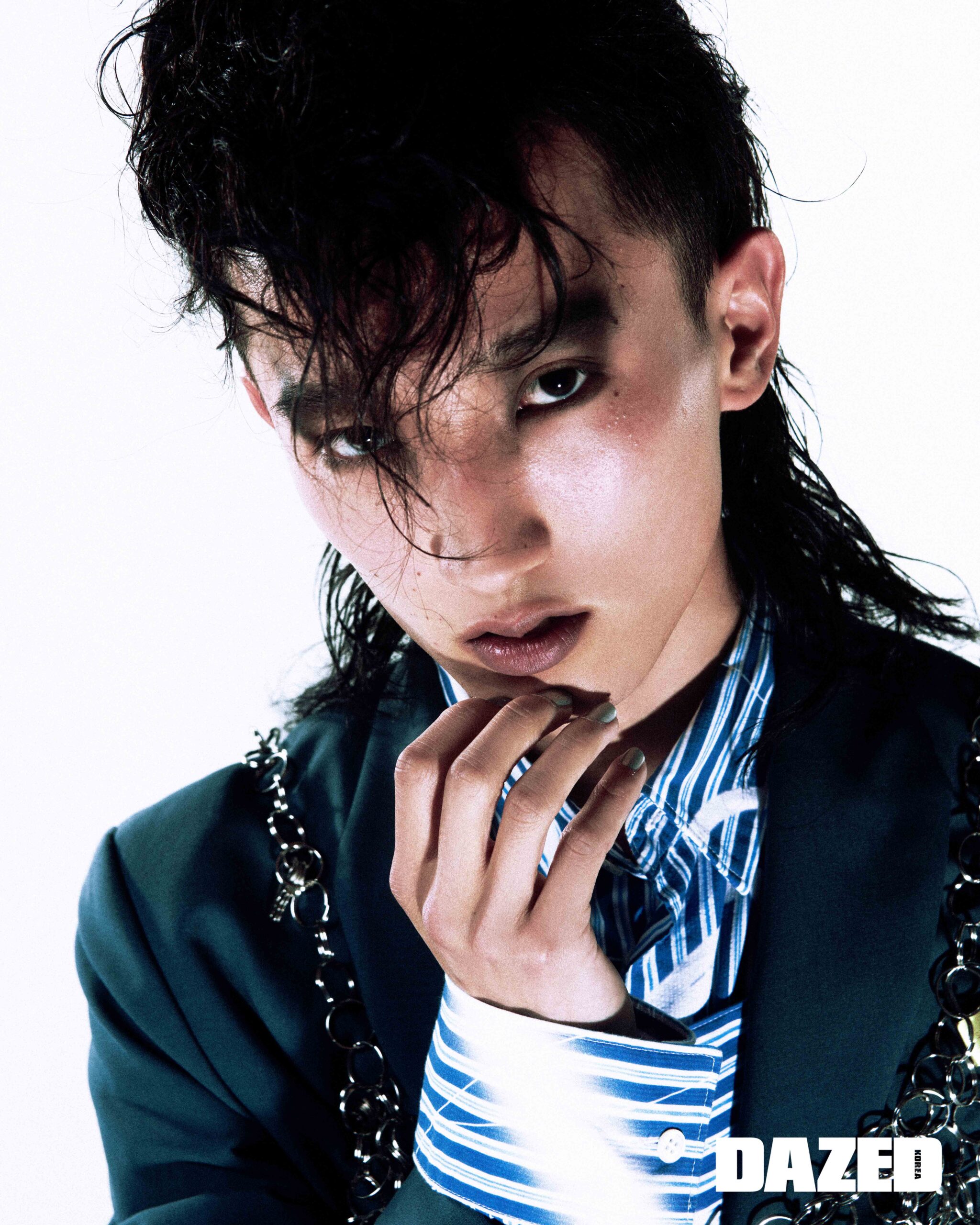 재킷은 아이렌시아(Irensia), 체인 베스트와 스트라이프 셔츠는 쿠도스(kudos).