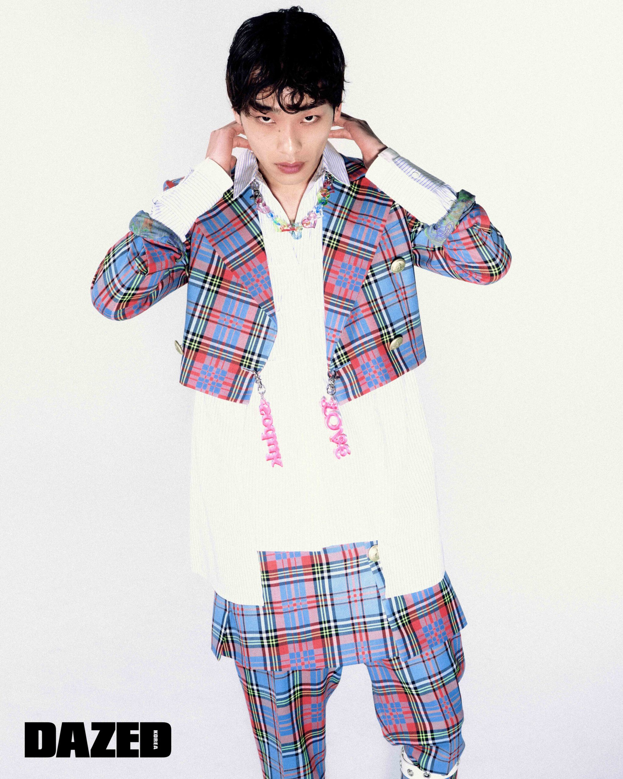 체크 크롭트 재킷과 팬츠, 팬츠와 레이어링한 스커트는 모두 비비안 웨스트우드(Vivienne Westwood), 셔츠는 스도쿠(soduk), 네크리스로 연출한 하트 브레이슬릿과 재킷에 연출한 참은 스도쿠×고타 오쿠다(soduk×Kota Okuda), 팬츠에 두른 벨트는 에디터의 것.