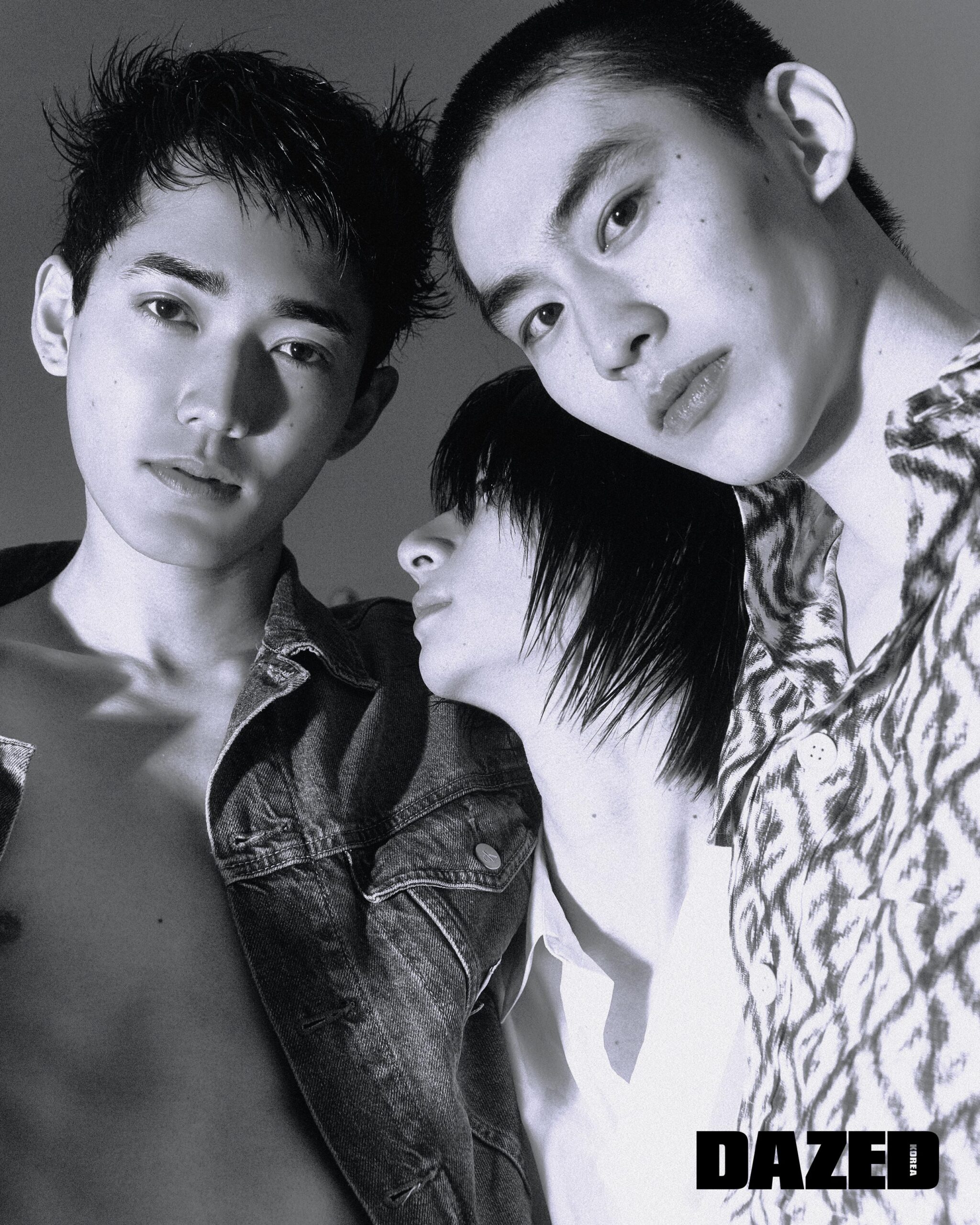 가주하가 입은 데님 재킷은 캘빈클라인 진(Calvin Klein Jeans), 히에이가 입은 셔츠는 스도쿠(soduk). 게이즈가 입은 프린트 셔츠는 펜디(Fendi).