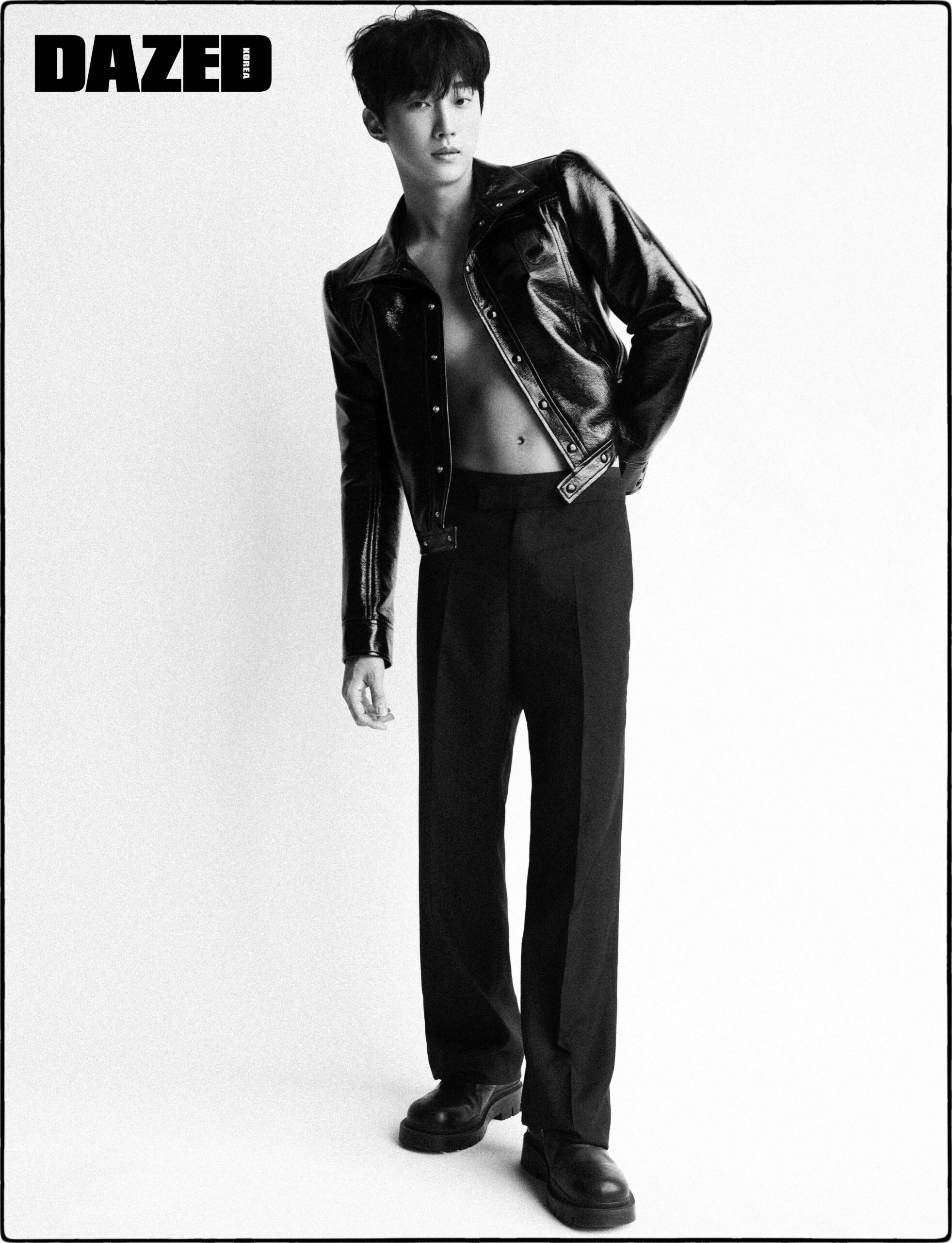 재킷은 쿠레쥬 by 분더샵(Courrèges by BOONTHESHOP), 팬츠는 김서룡(Kimseoryong), 슈즈는 스타일리스트의 것.